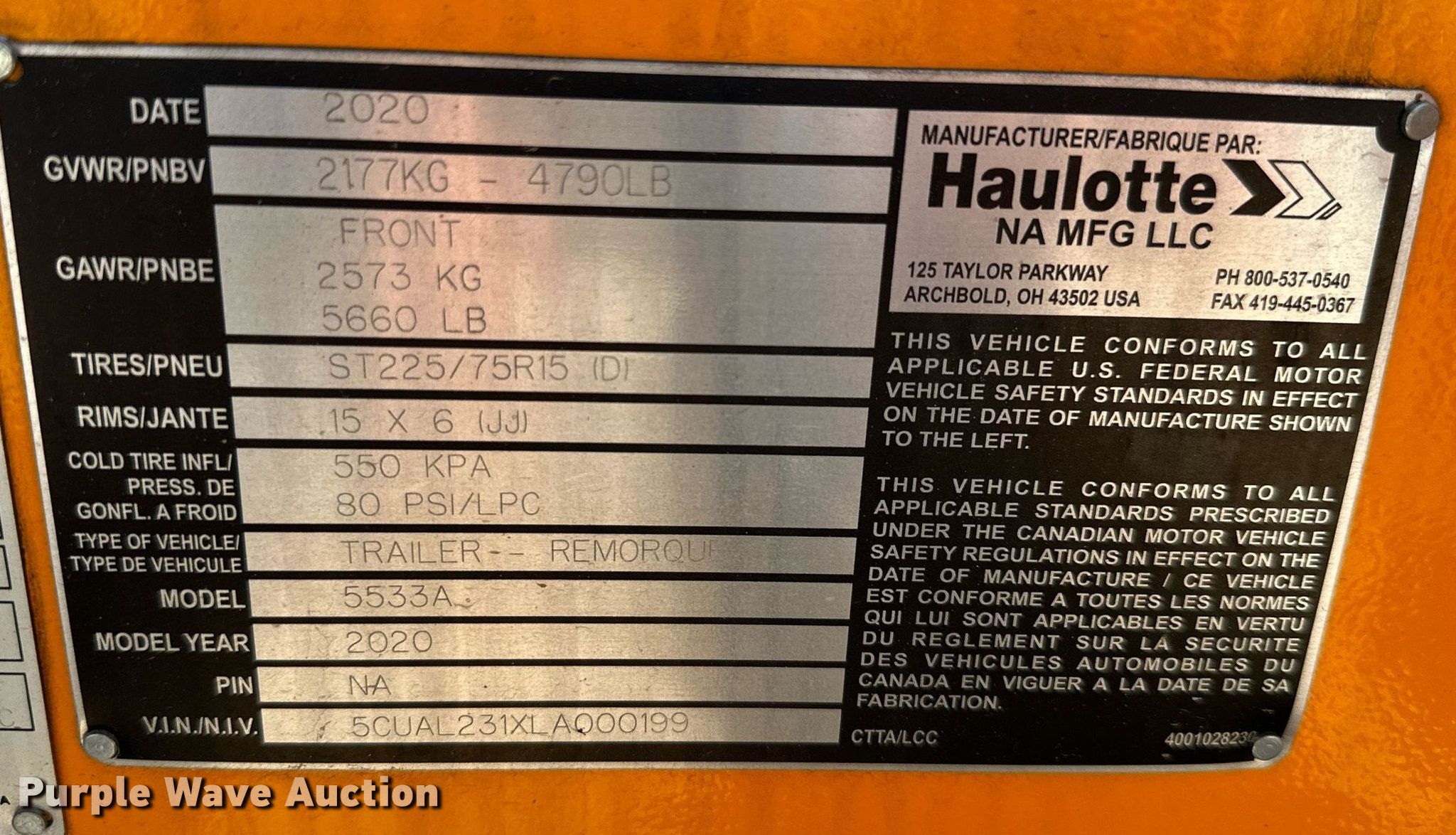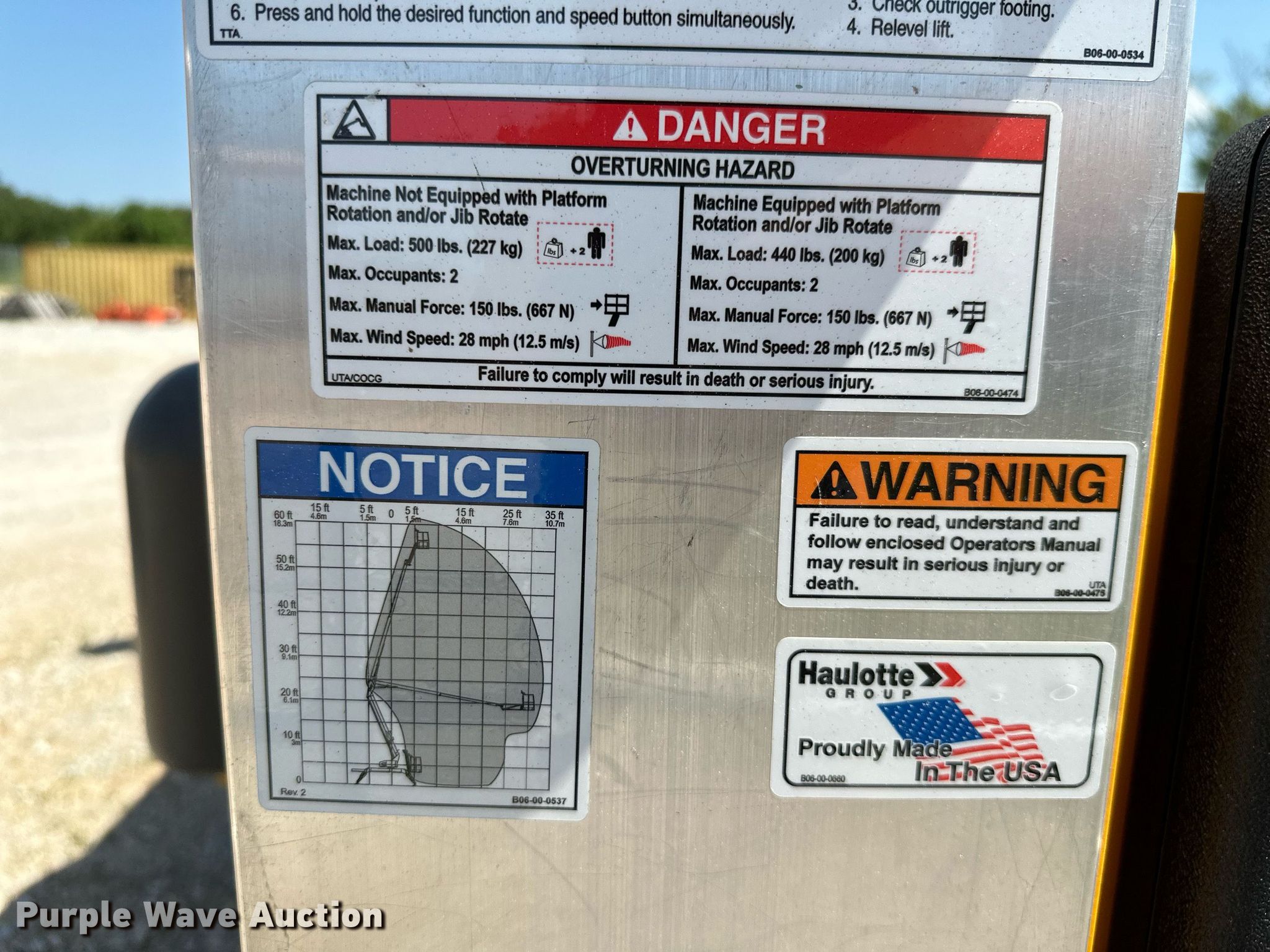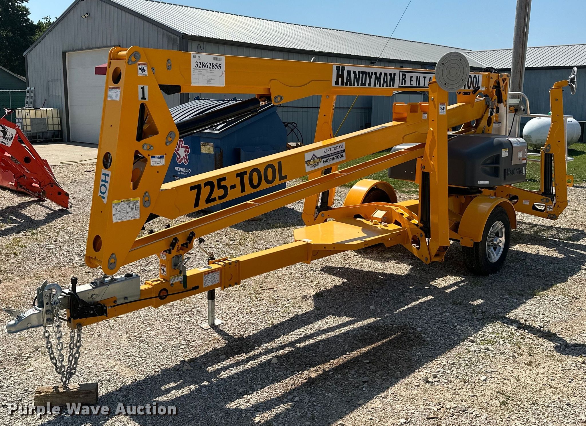 2020 Haulotte 5533A boom lift. Hours: 456 on meter, VIN: 5CUAL231XLA000199, Serial: 2085601-00199. Electric Motor Volts: 24. Features Tow behind, Maximum lift capacity: 500 lbs, Maximum reach length: 33' 5", Maximum lift height: 55' 3", Hydraulic outriggers, Hydraulic extendable jib, Hydraulic leveling, Platform: 26" L x 46" W, Controls: Platform, Ground, Safety alarm. Tires Tire size: ST225/75R15. Family Rentals. 1978 Slack Street. Pea Ridge, AR 72751