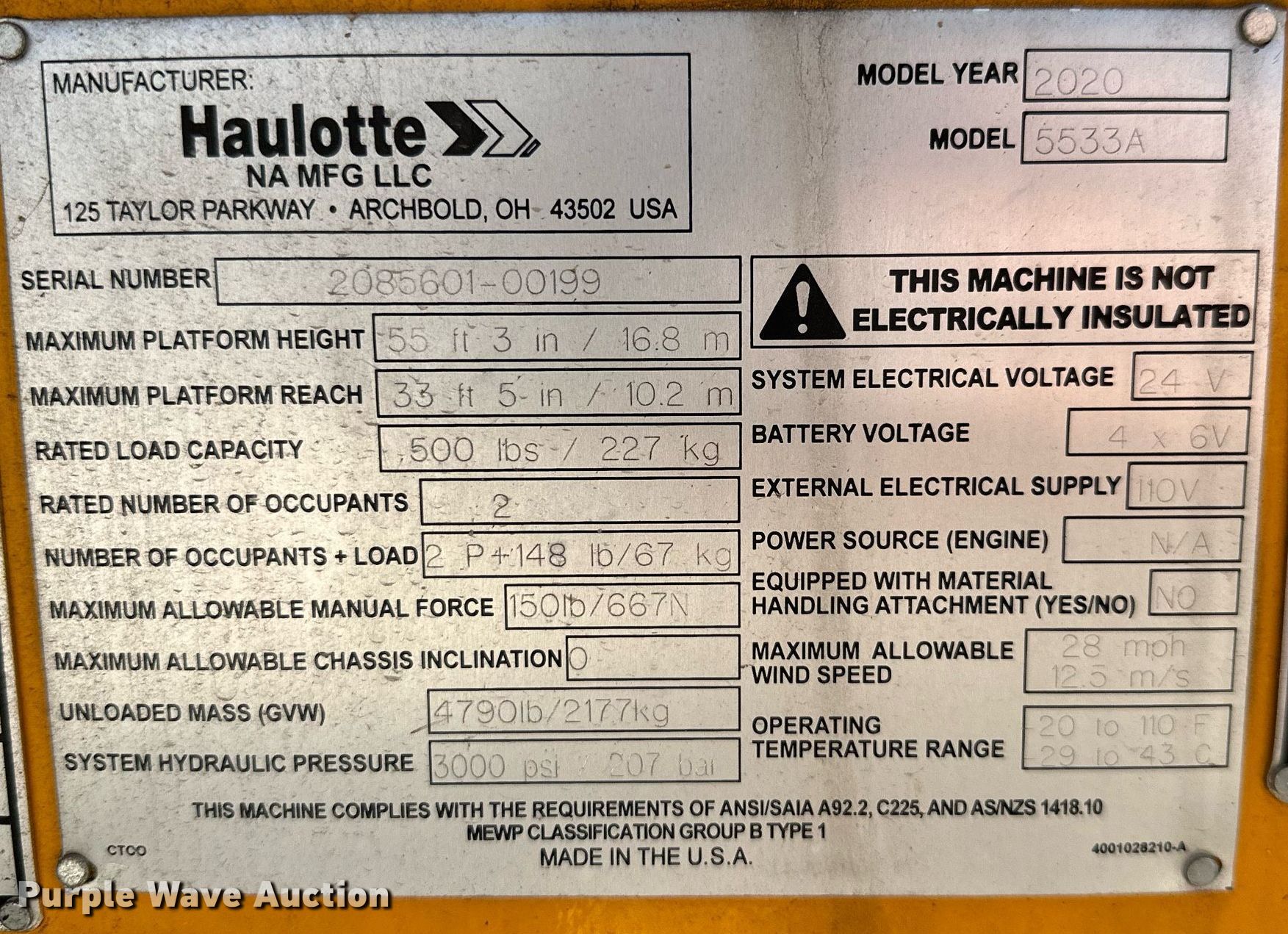 Purple Wave is selling a used Boom Lift in Arkansas. This item is a 2020 Haulotte 5533A boom lift with the following: Hours: 456 on meter, VIN: 5CUAL231XLA000199, Serial: 2085601-00199