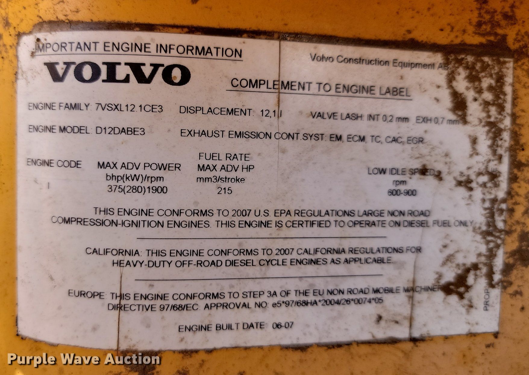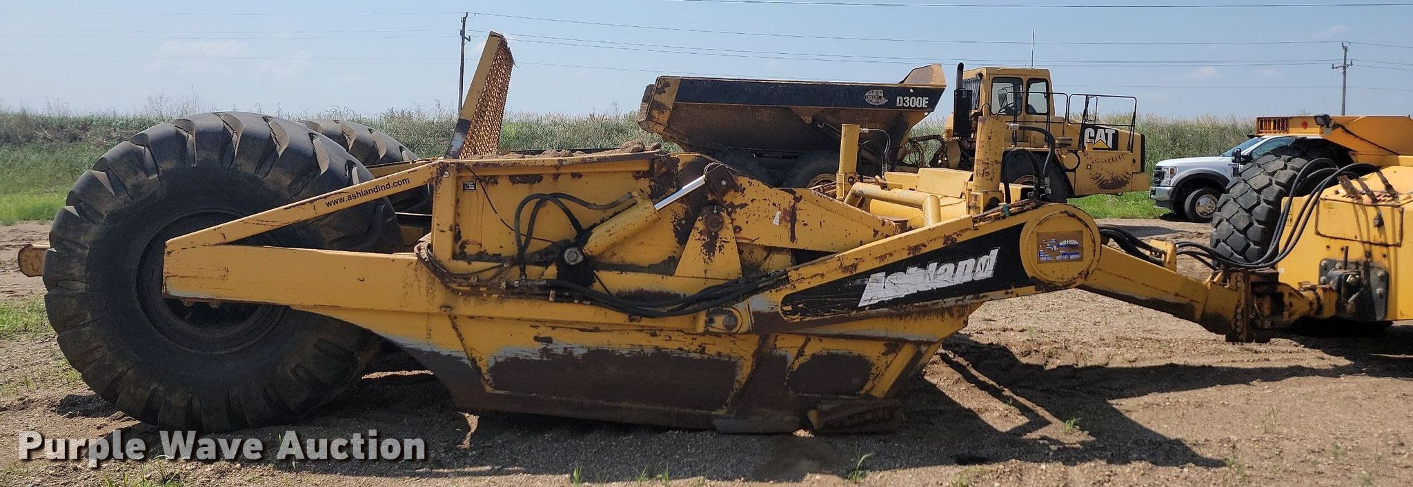 Volvo T450D 4WD scraper tractor. Hours: 8,720 on meter, Serial: T450DV17048. Engine Volvo D12DABE3, Displacement: 12.1L, Cylinders: 6, Fuel type: Diesel. Transmission Powershift. Operators station AC, Heat. Features Hydraulic remote sets Rear: 2. Tires Size: 29.5R25. Notes Glass cracked. (2) Ashland I-180 TS2 pull type scrapers. Chassis Brakes: Hydraulic. Features Bowl capacity: 18 cu.yd., Reversible cutting edge, Hydraulic lift. Tires Size: 29.5-25. Notes One unit non-operational, parts only Parts may be missing. First Rate Excavate Inc.. 1509 E 39th St N. Sioux Falls, SD 57104
