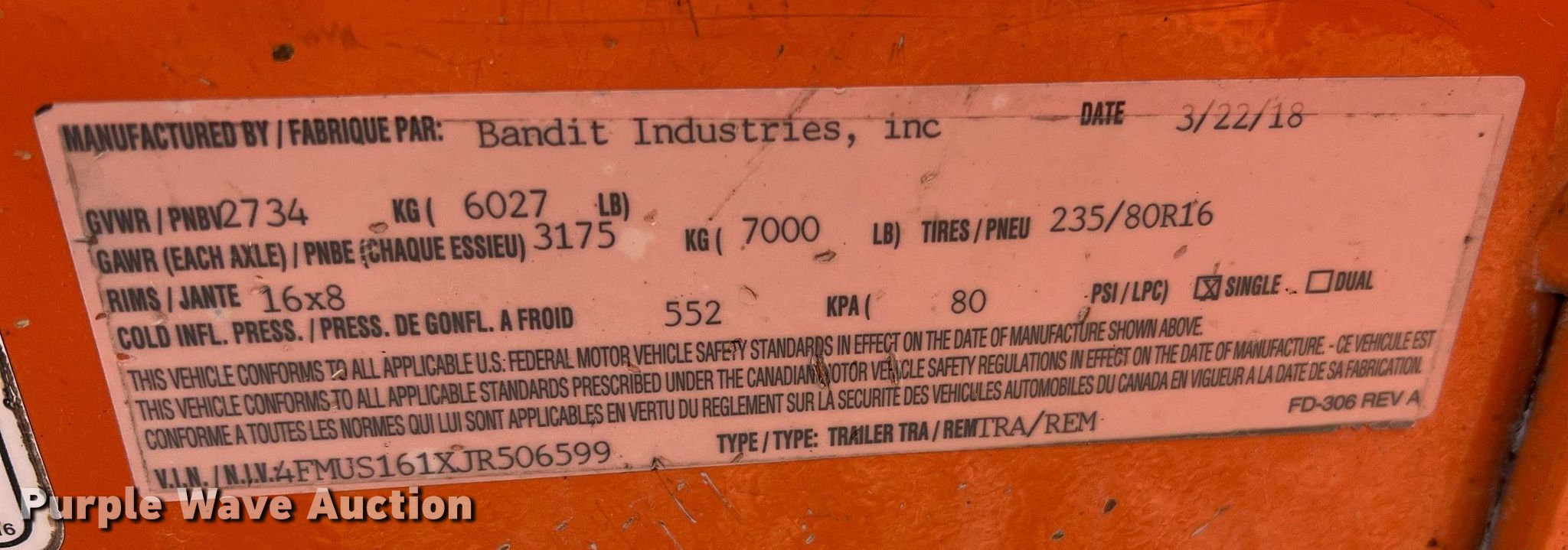 2018 Bandit Intimidator 12XP wood chipper. Hours: 2,021 on meter, VIN: 4FMUS161XJR506599. Engine PSI JPSIB04.3GLP, Displacement: 4.3L, Cylinders: 6, Fuel type: Gas. Features Capacity: 12", Throat opening: 17" x 16". Trailer Hitch: Pintle, Brakes: Electric, Axles: Single, Tire size: ST235/80R16. Transfer of ownership documentation will be a bill of sale. 4385 North Route E. Columbia, MO 65202