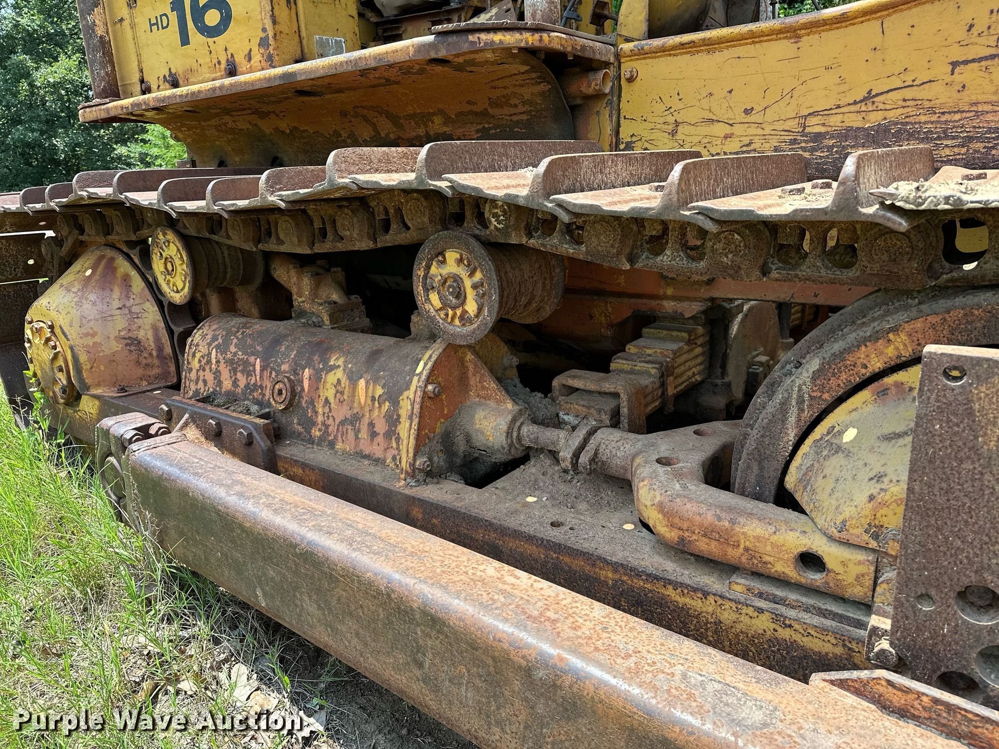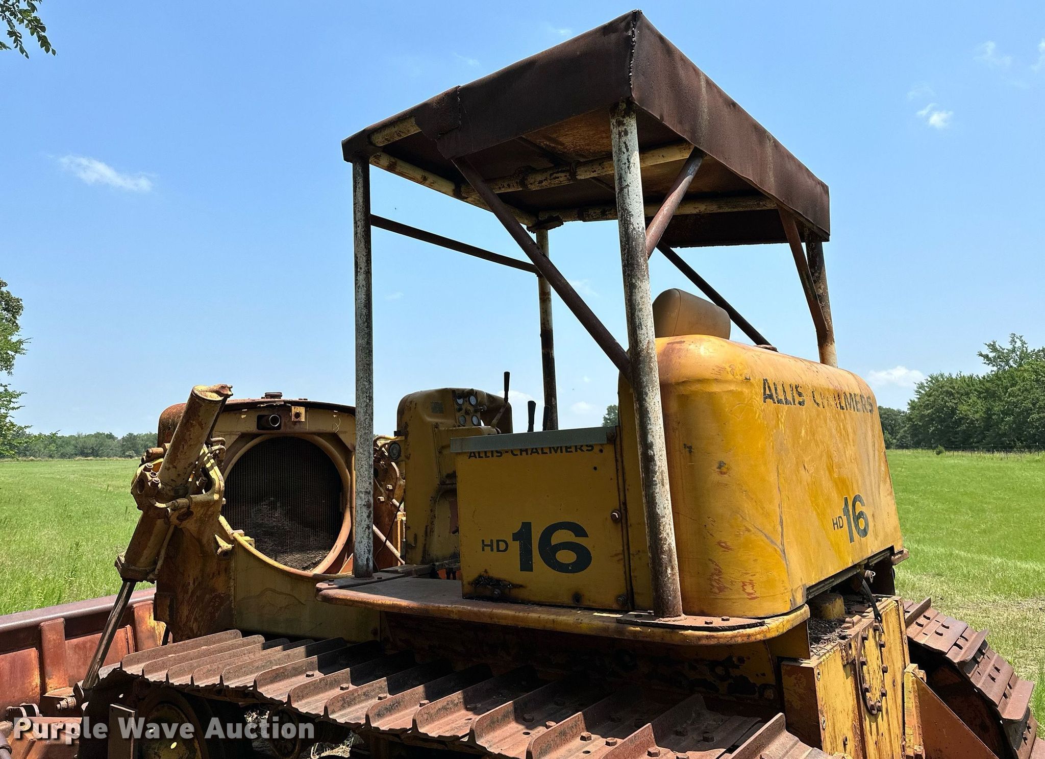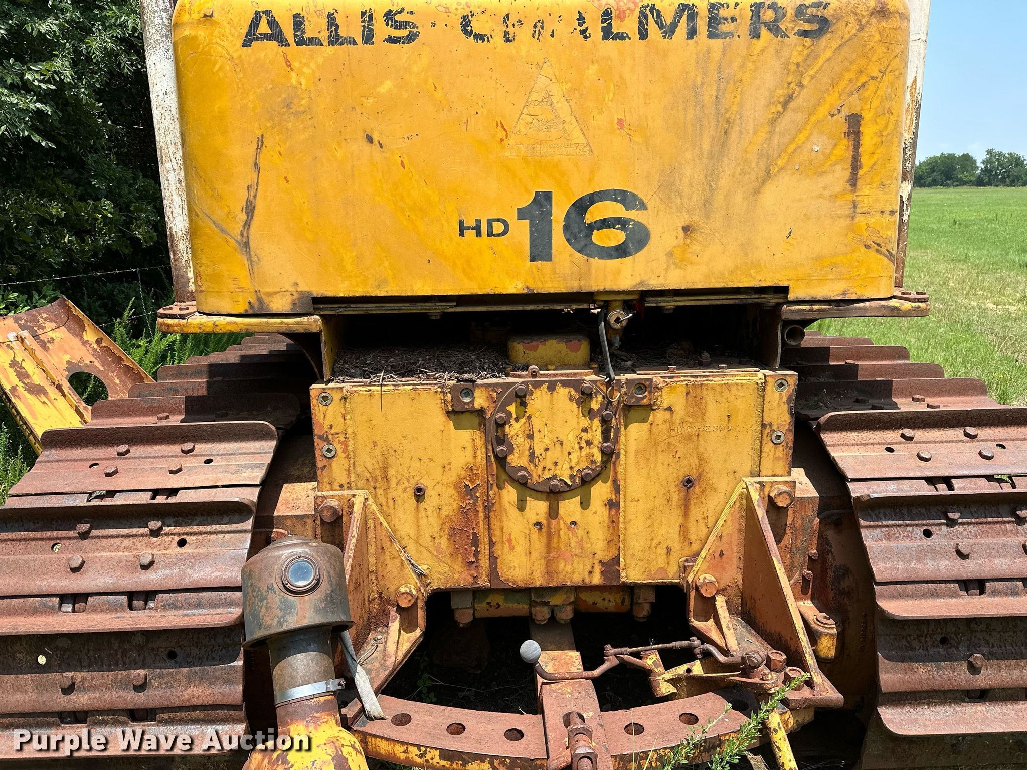 Allis-Chalmers HD16 dozer. Hours: Unknown, Serial: HD16A-2393. Engine Allis-Chalmers , Cylinders: 6, Fuel type: Diesel. Transmission Direct-drive. Operators station Canopy, Steering: Clutch brake. Features Rear drawbar, Dozer blade Type: Straight, Width: 132" W. Tracks Width: 22", Grouser pads: Single, Bottom rollers: 6, Track guards. Notes Parts may be missing, Engine removed but included , Additional engine included , Non-operational unit. 22539 Chambers Road. Earlsboro, OK 74840