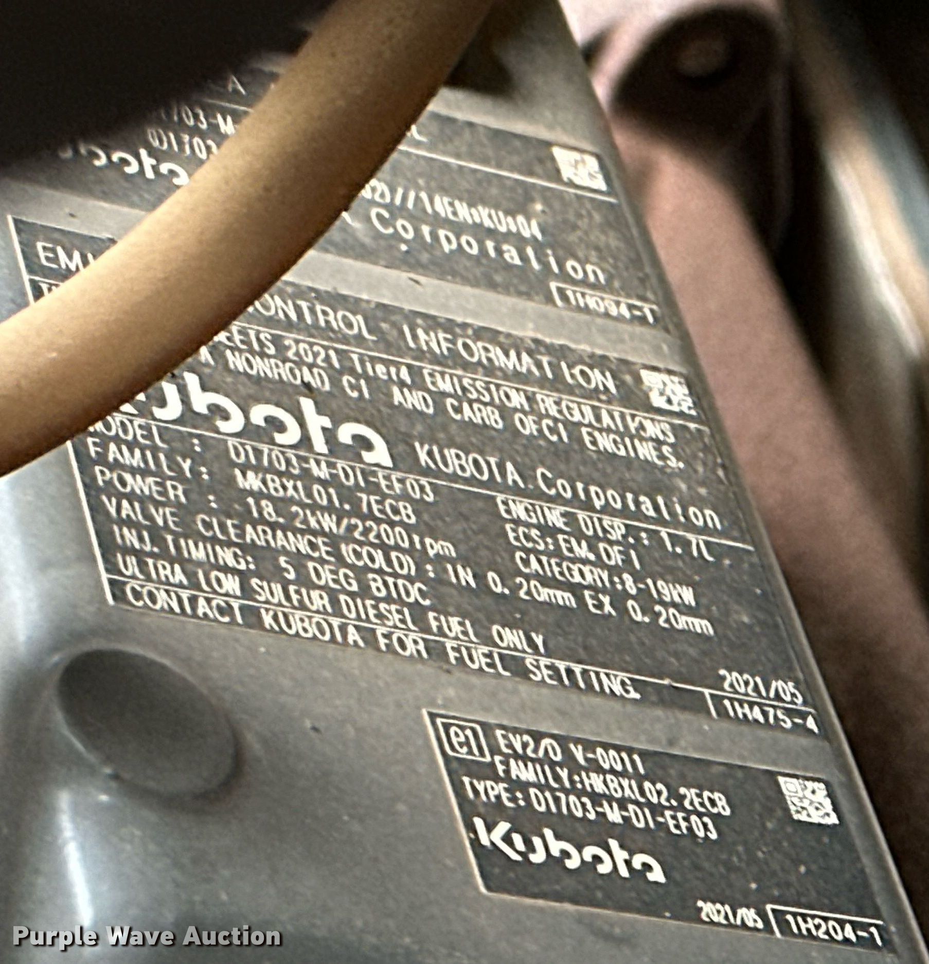 2021 Bobcat E32I mini excavator. Hours: 767 on meter, Serial: B3Y115698. Engine Kubota D1703-M-DI-EF03, Serial: MKBXL01.7ECB, Displacement: 1.7L, Cylinders: 3, Fuel type: Diesel. Transmission Hydrostatic, Two speed travel. Operators station OROPS, Pattern changer. Features Auxiliary hydraulics Standard, Backfill blade Width: 60", Boom Swing, Stick Stick length: 4' 2", Quick coupler: Mechanical, Bucket Bobcat , Width: 12", Teeth: 3. Tracks Width: 12", Rubber. Boehs Building Supply. 2002 N Main St. Fairview, OK 73737