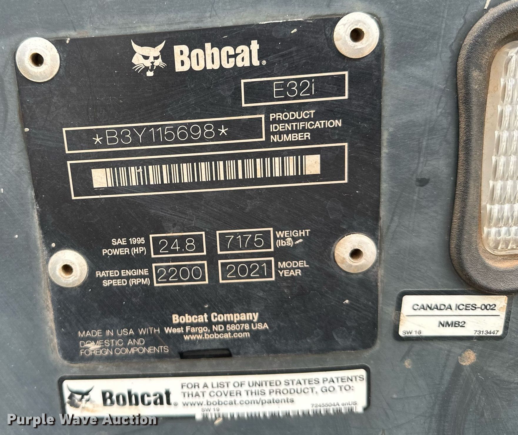 Purple Wave is selling a used Mini Excavator in Oklahoma. This item is a 2021 Bobcat E32I mini excavator with the following: Hours: 767 on meter, Serial: B3Y115698