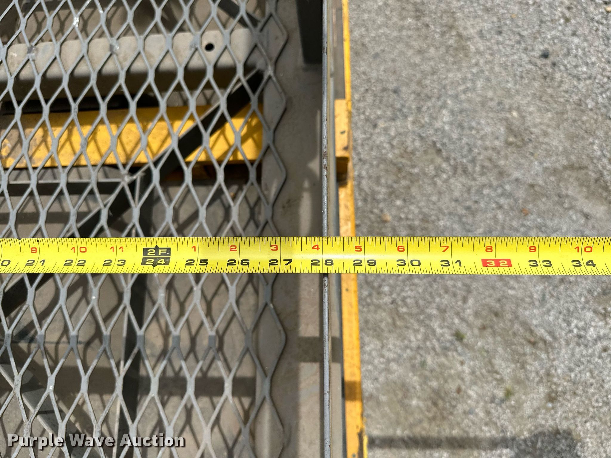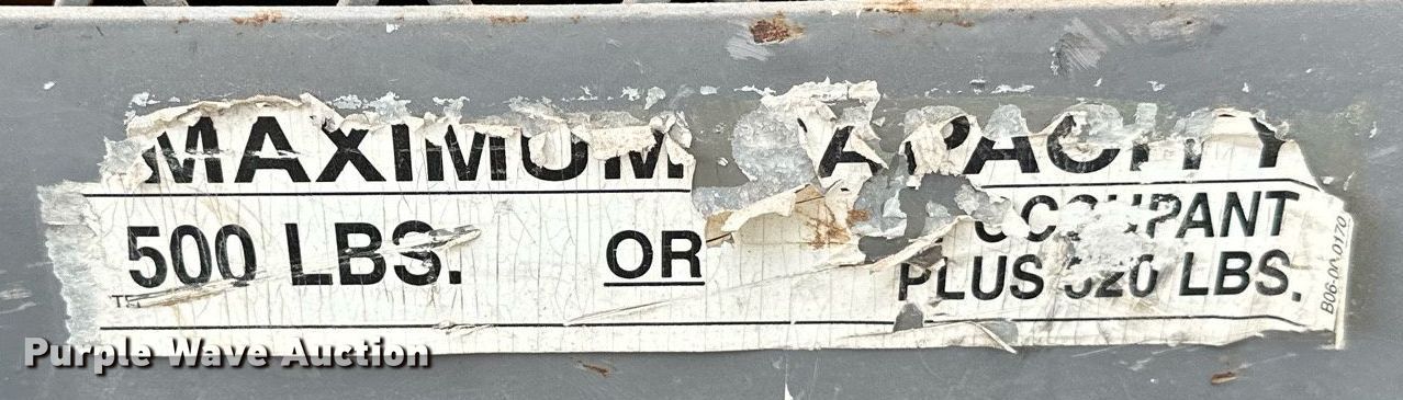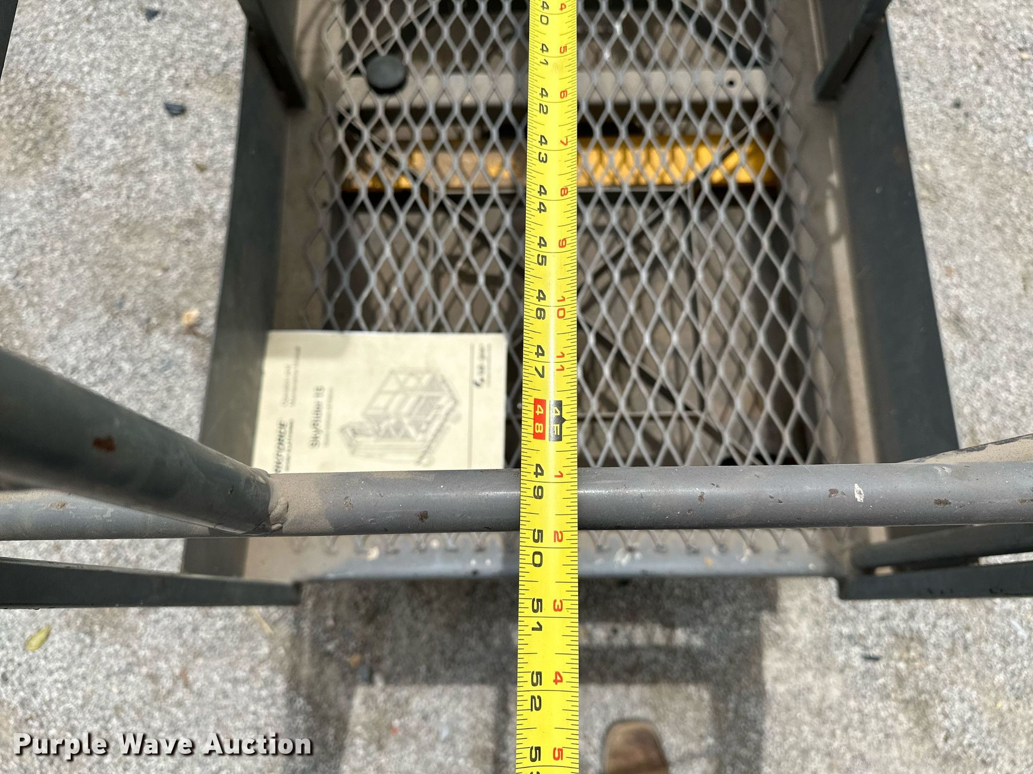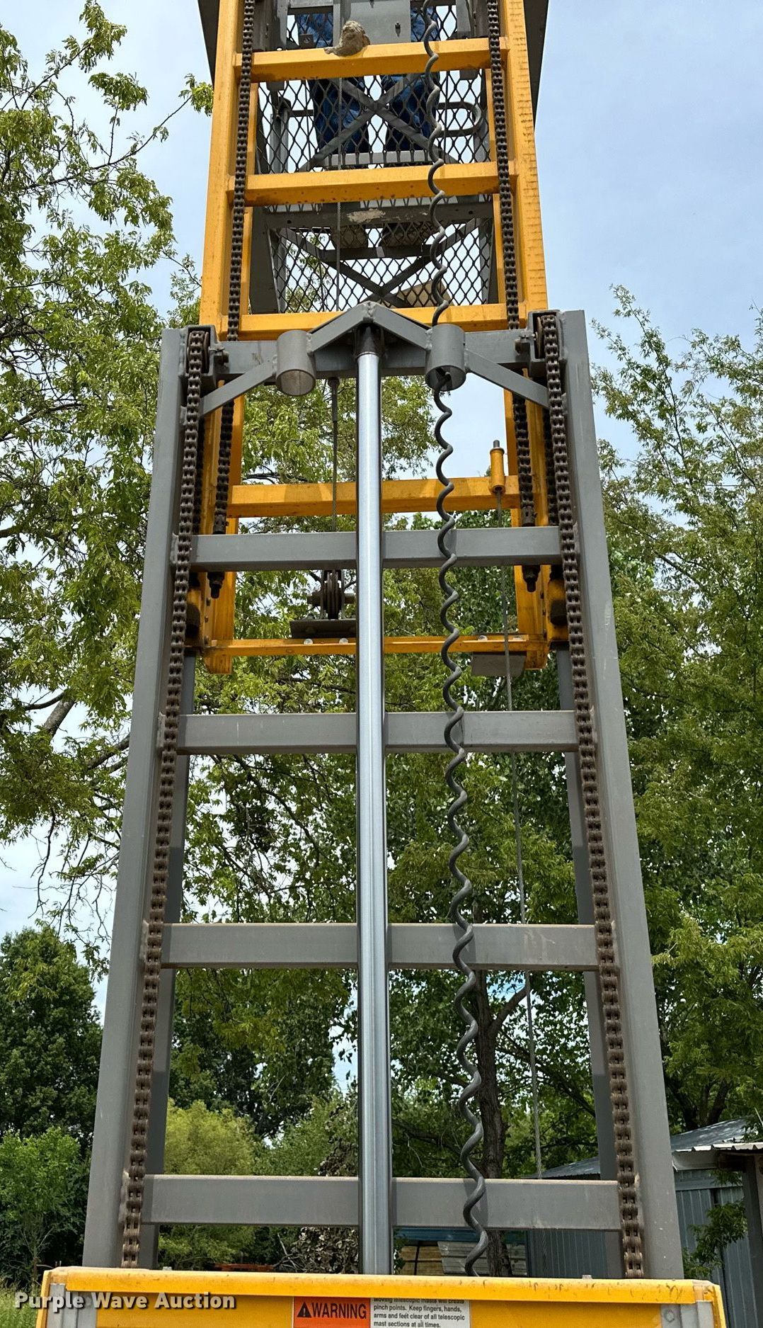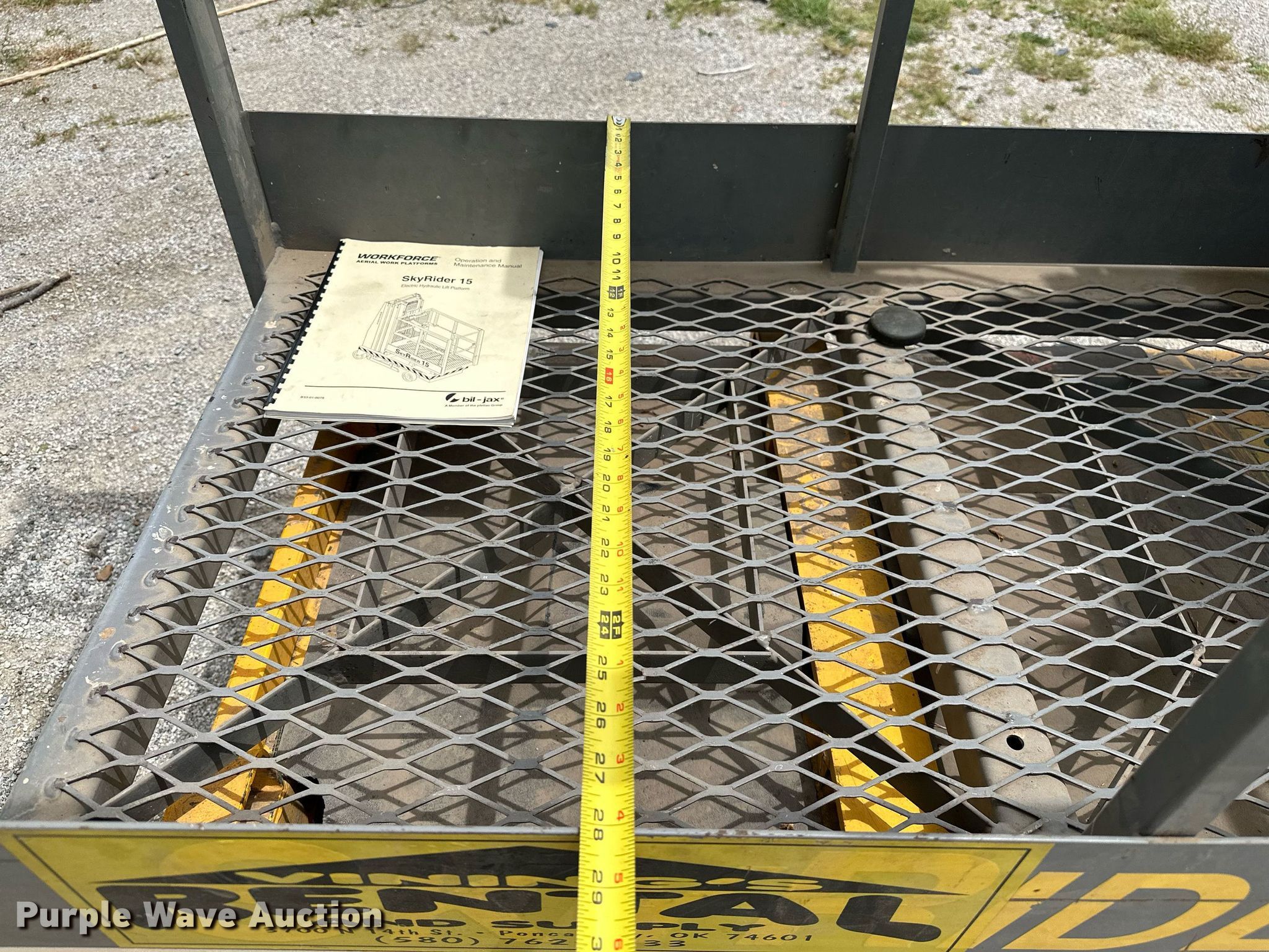 Bil-Jax SkyRider 15 vertical lift. Hours: 179 on meter, Serial: 15-0123. Features Maximum lift capacity: 500 lbs, Maximum lift height: 14' 10", Platform: 48" L x 28" W, Controls: Platform, Ground, Safety alarm. Tires Solid. 47815 OK-51B. Porter, OK 74454