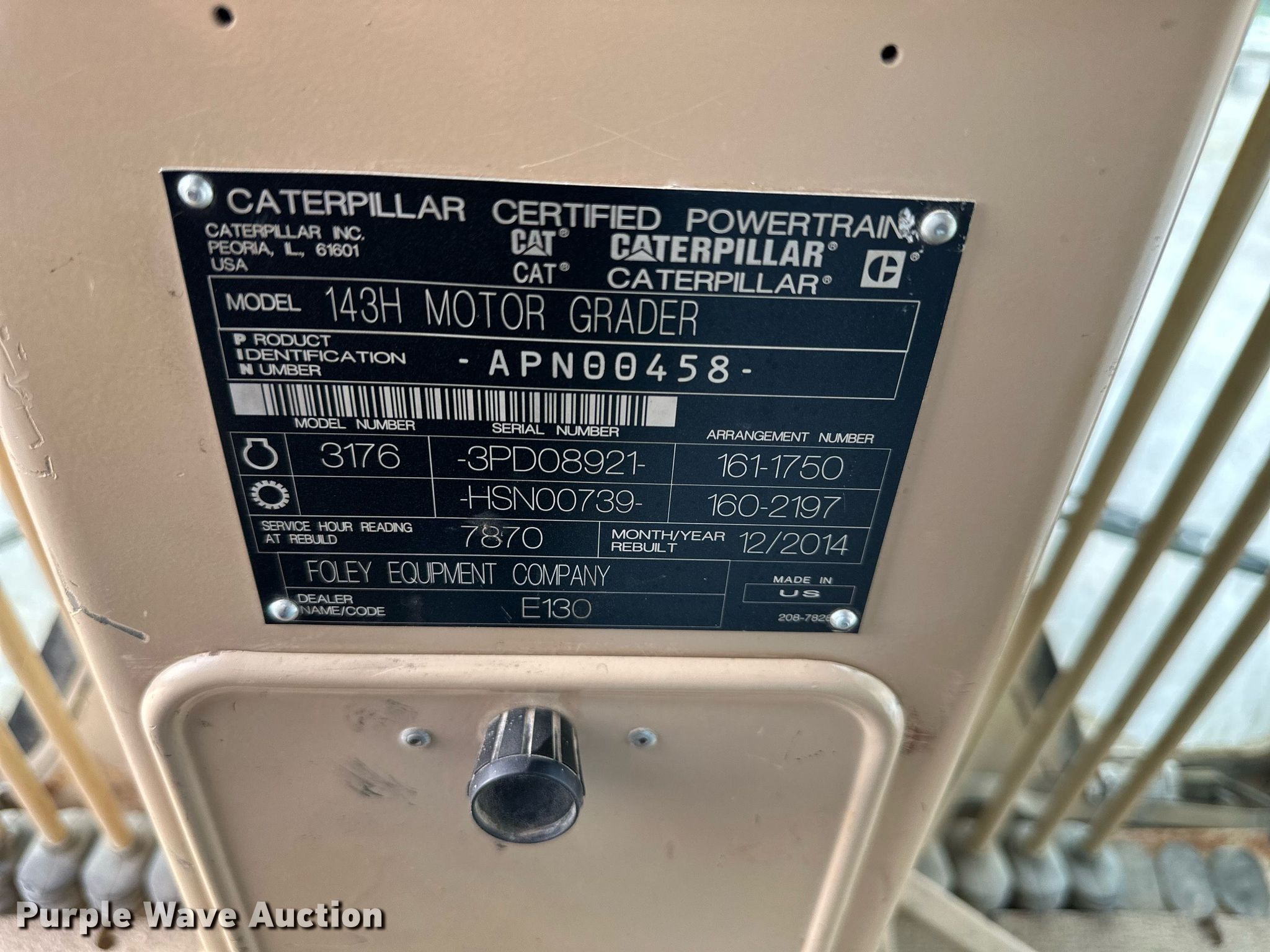 Purple Wave is selling a used Motor Grader in Kansas. This item is a 2004 Caterpillar 143H motor grader with the following: Hours: 13,739 on meter, Serial: CAT0143HCAPN00458
