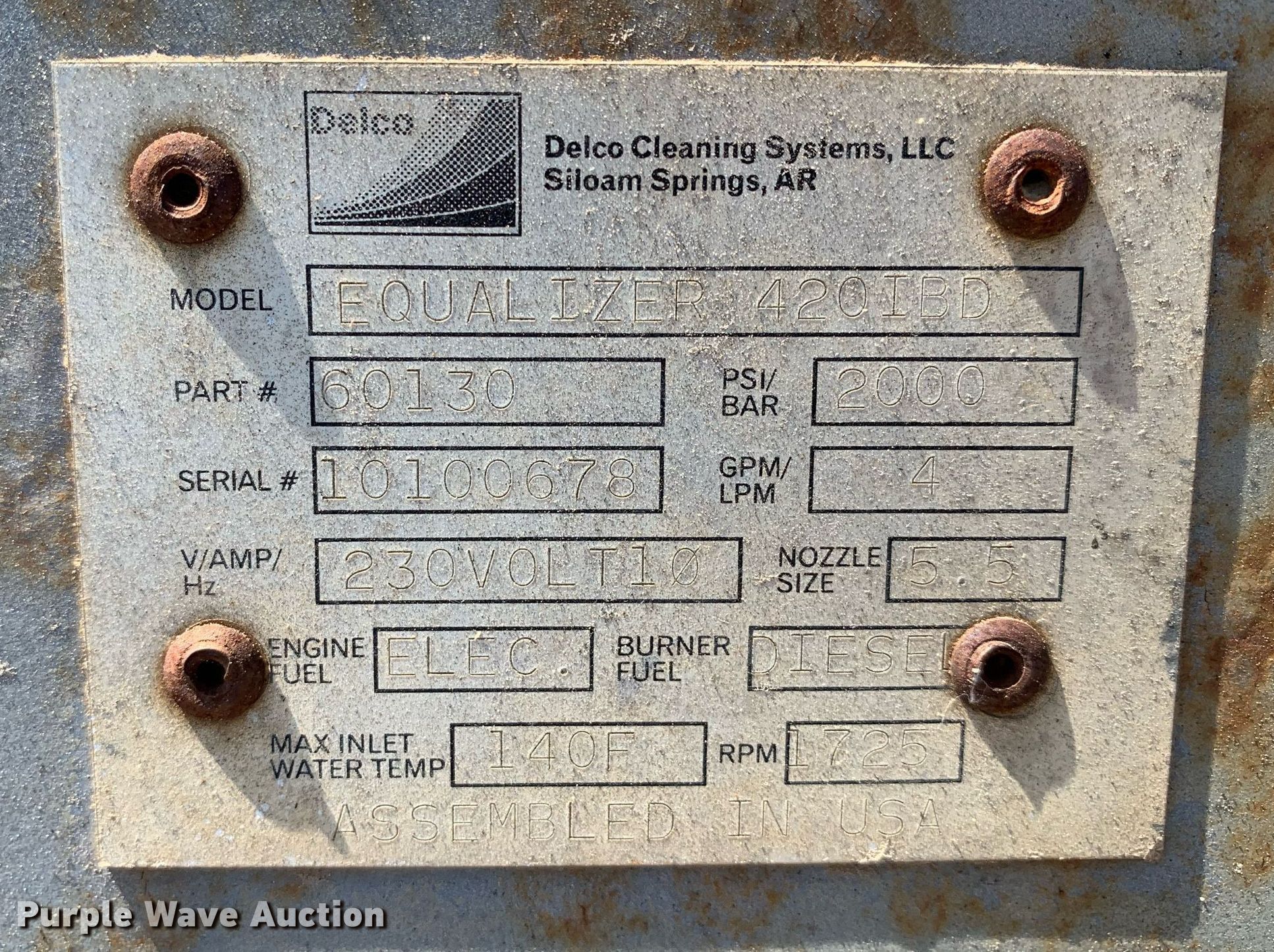 Purple Wave is selling a used Pressure Washer in Texas. This item is a Delco Equalizer 420 IBD pressure washer with the following: Serial: 10100678, Unit #: 1119