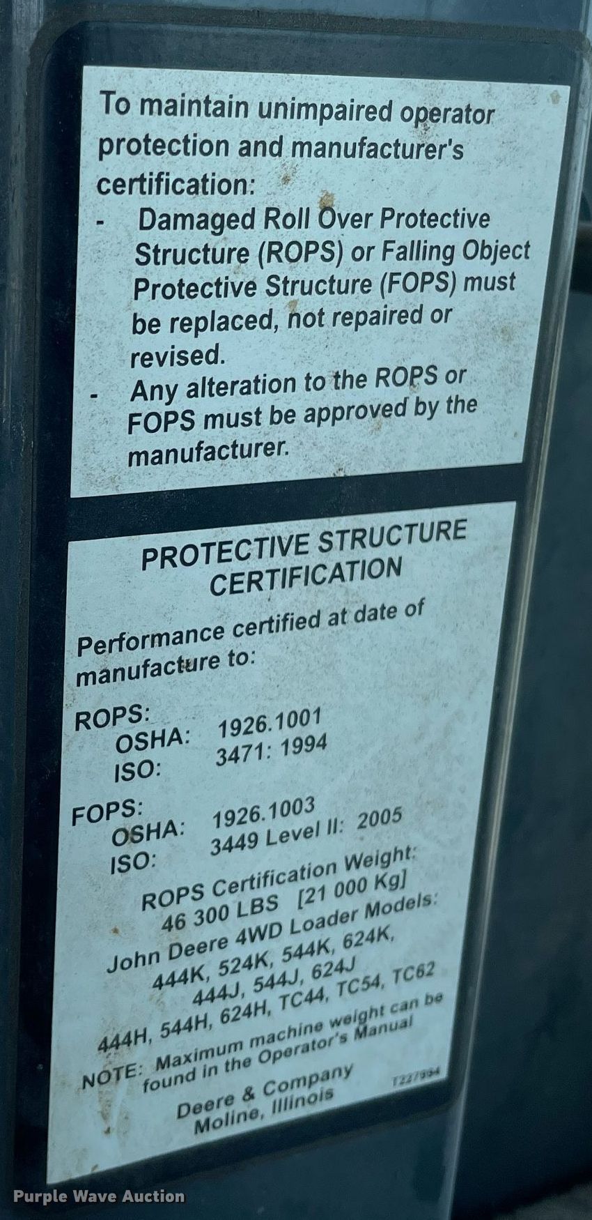 2013 John Deere 624K wheel loader. Hours: 13,735 on meter, Serial: 1DW624KZPDE652168. Engine Cylinders: 6, Fuel type: Diesel. Transmission Powershift, 4F - 3R. Chassis Differential lock: Front. Operators station EROPS, AC, Heat, Bucket controls: Joystick, Ride control. Features Bucket JRB 624K, Capacity: 3.5 cu.yd., Width: 120", Four-in-one, Cutting edge: Bolt-on. Tires Solid. Notes Fourth gear locked out in monitor. Rice County. Lyons, KS 67554