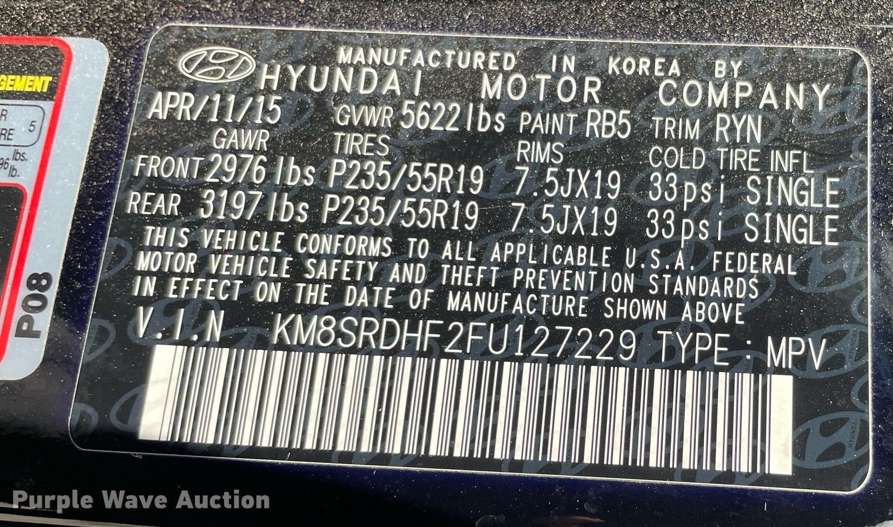 2015 Hyundai Santa Fe SUV. Miles: 111,768 on odometer, VIN: KM8SRDHF2FU127229. Engine Displacement: 3.3L V6 DOHC, Cylinders: 6, Fuel type: Gas. Transmission Automatic, All wheel drive. Interior AC, Heat, Seat: Heated, Cooled, Power driver, Power passenger, Power windows, Power locks, Cruise control, Backup camera, Powered sunroof. Tires Size: 235/55R19. Notes Engine issues. Kansas title. Title distribution may be delayed up to 14 days from verification of funds. Wichita Police Department. Wichita, KS 67217