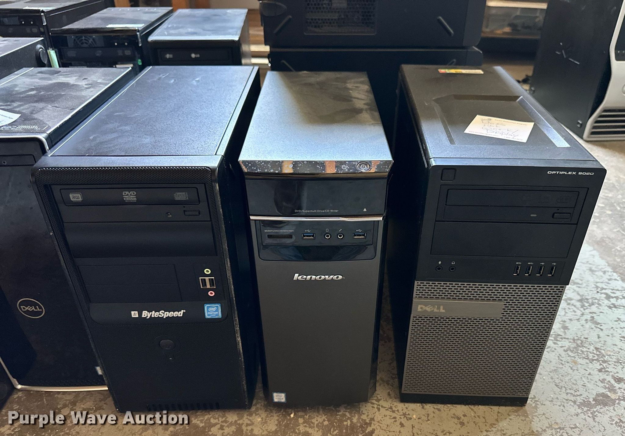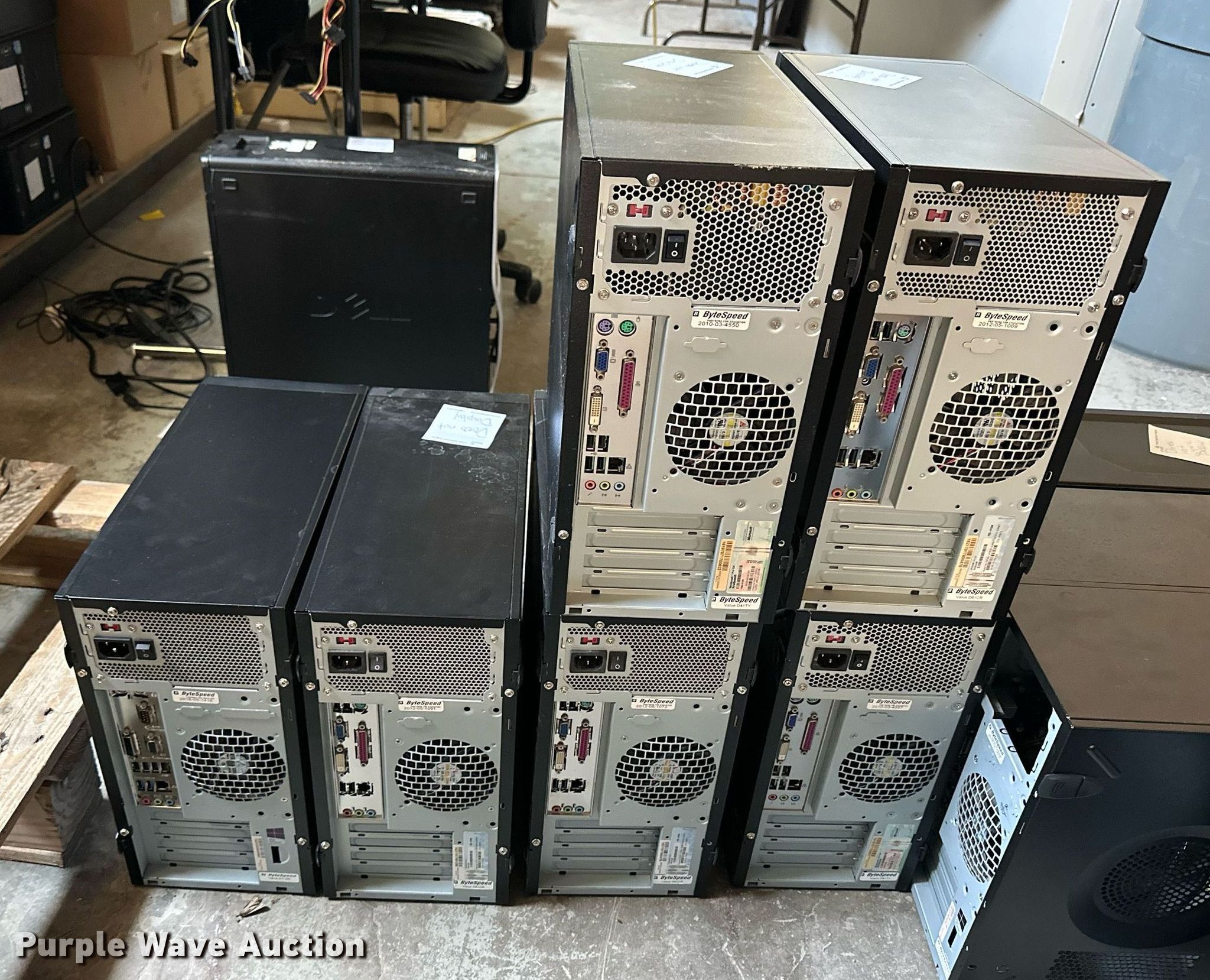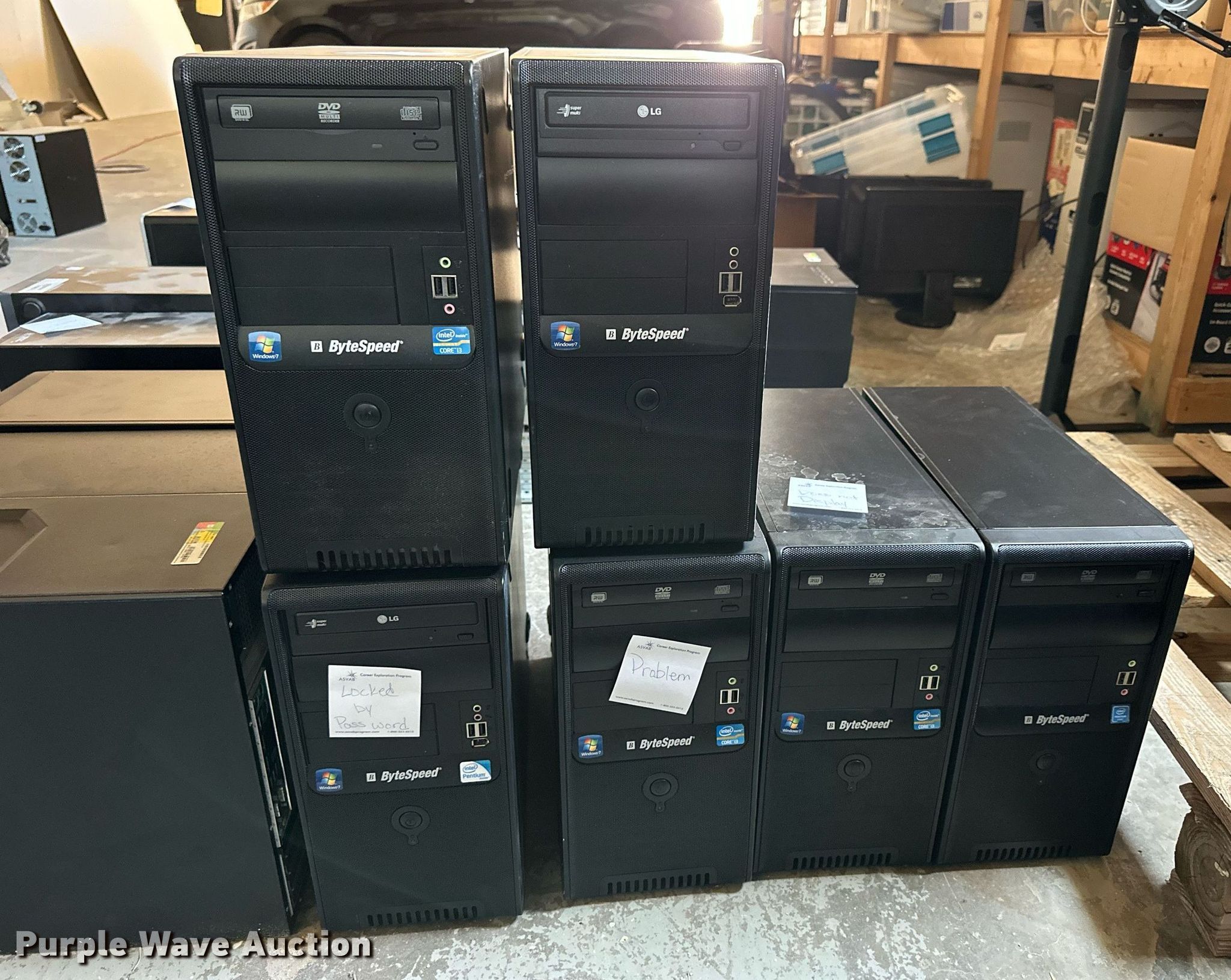 Purple Wave is selling a used Electronics in Kansas. This item is a Electronics with the following: (17) computer towers, View Sonic monitor, (7) laptops, Speakers, Printers, Scanners, Mice