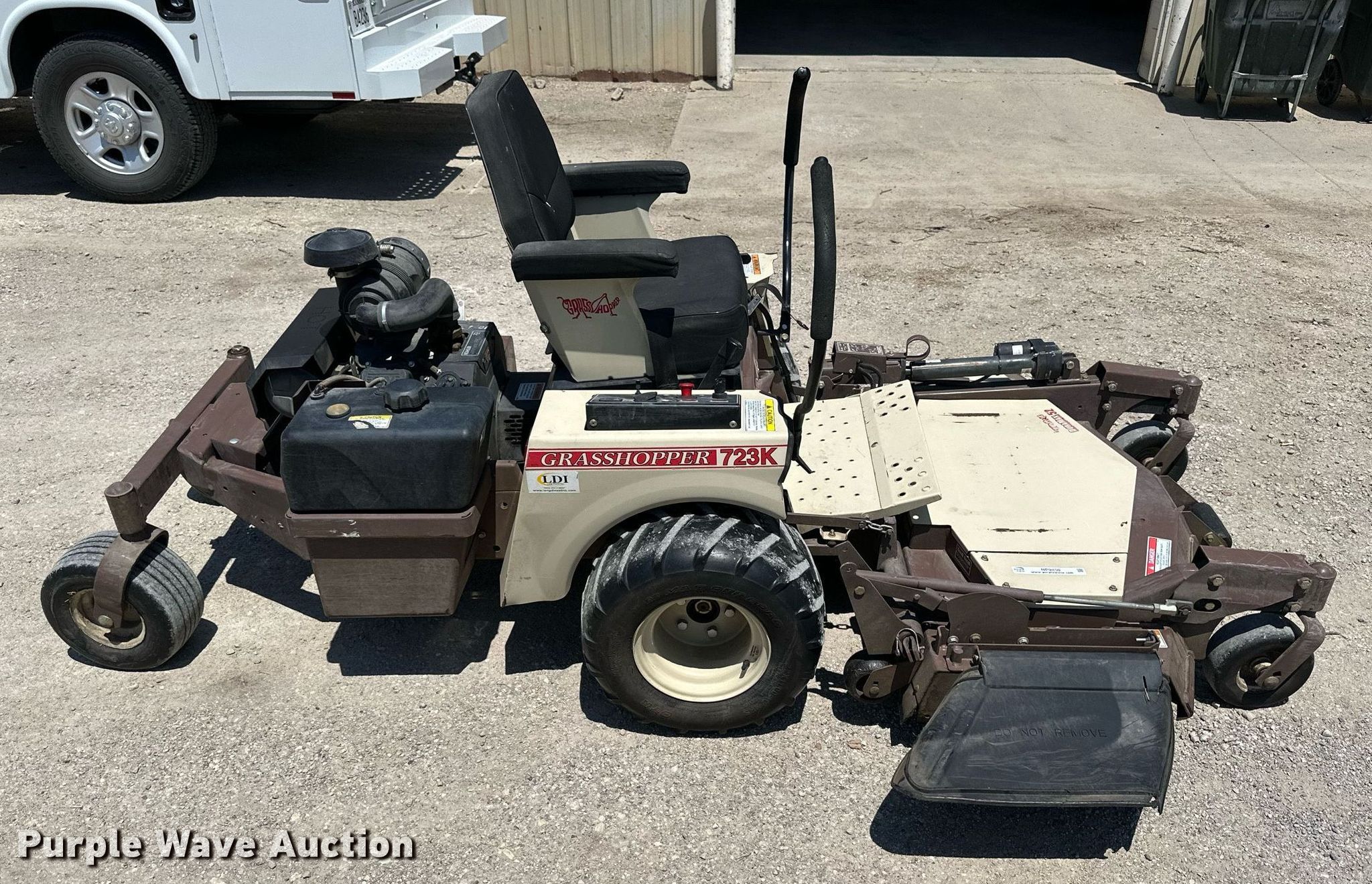 Purple Wave is selling a used Lawn Mower in Kansas. This item is a Grasshopper 723K ZTR lawn mower with the following: Hours: 1,008 on meter, Cutting width: 52", Serial: 6314515