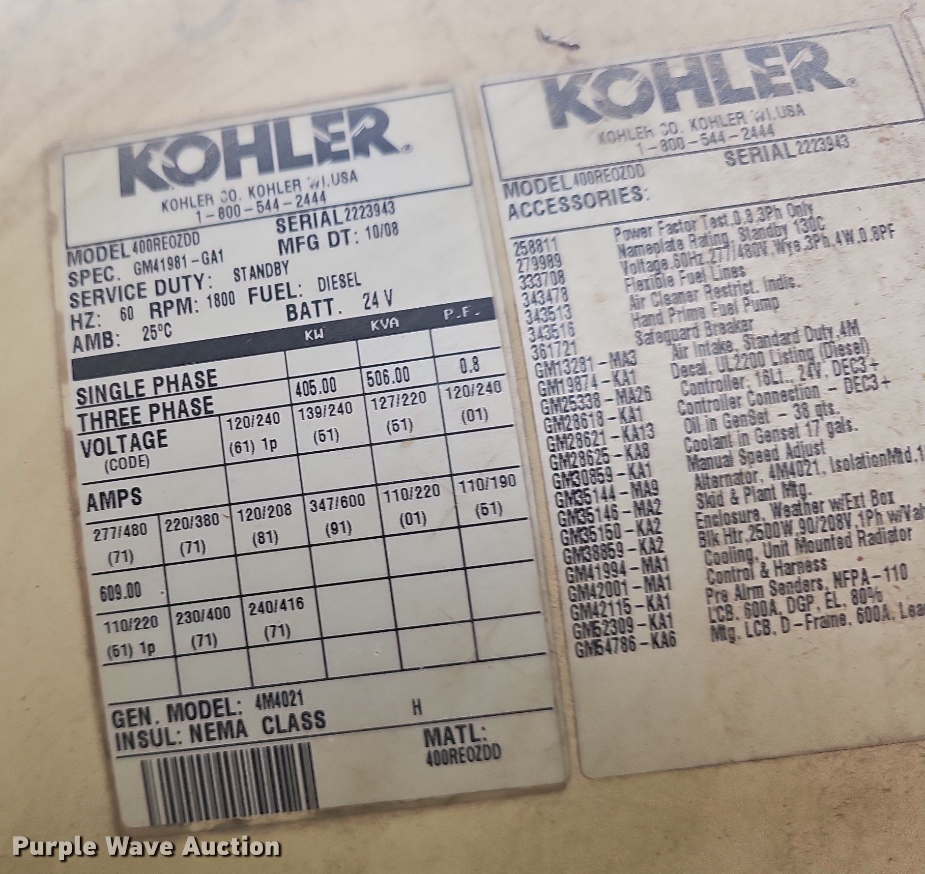This 2008 Kohler 400 generator will sell to the highest bidder regardless of price.