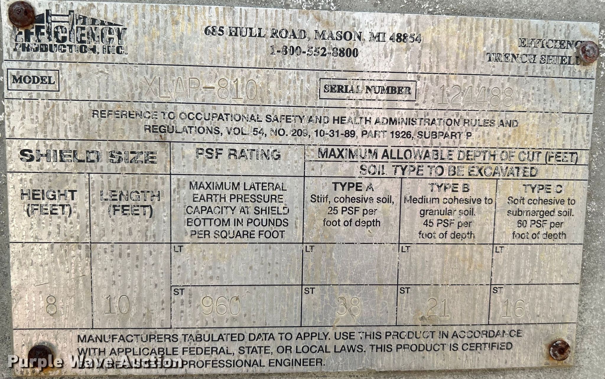Purple Wave is selling a used Underground Safety or Shoring in Missouri. This item is a Efficiency XLAP-810 trench box with the following: 10'L x 8'H, Serial: 124488