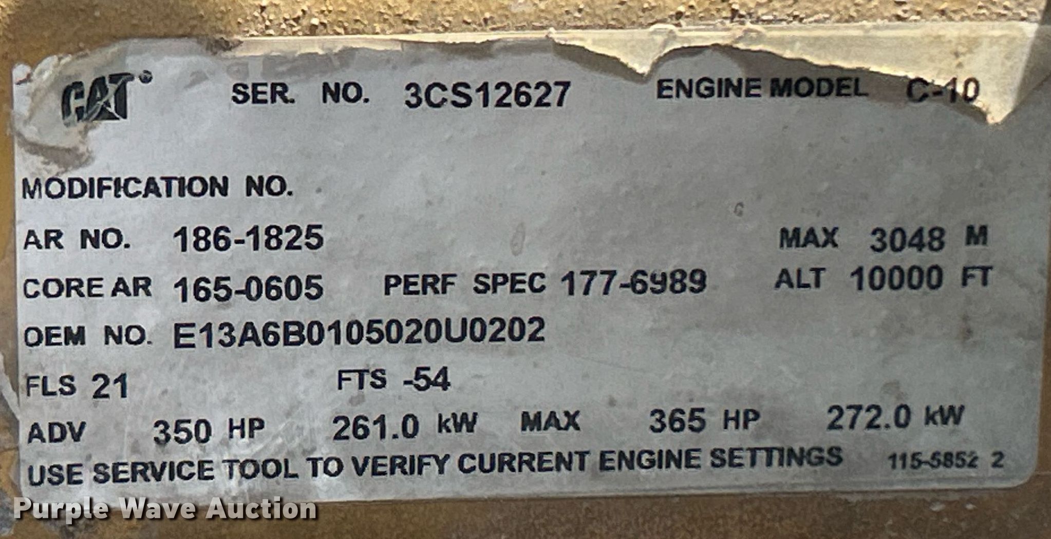 2000 Peterbilt 378 semi truck. Miles: 410,700 on odometer, Hours: 6,288 on meter, VIN: 1XPFDT9X0YD536613. Engine Caterpillar C-10, Serial: 3CS12627, Displacement: 10.3L, Cylinders: 6, Fuel type: Diesel, HP: 365, kW: 272, Engine brake. Transmission Manual, Speed: 10. Chassis Axles: Tandem, Differential lock: Full, Suspension: Air, Brakes: Air, PTO, Wet kit, GVWR: 52,000 lbs FAWR: 12,000 lbs, IAWR: 20,000 lbs, RAWR: 20,000 lbs. Interior AC, Heat, Heated mirrors. Features Fifth wheel type: Fixed, Fuel tank: Dual. Tires Size: 11R22.5. Oklahoma title. Title distribution may be delayed up to 14 days from verification of funds. D-Kerns Construction, Inc. Inola, OK 74036
