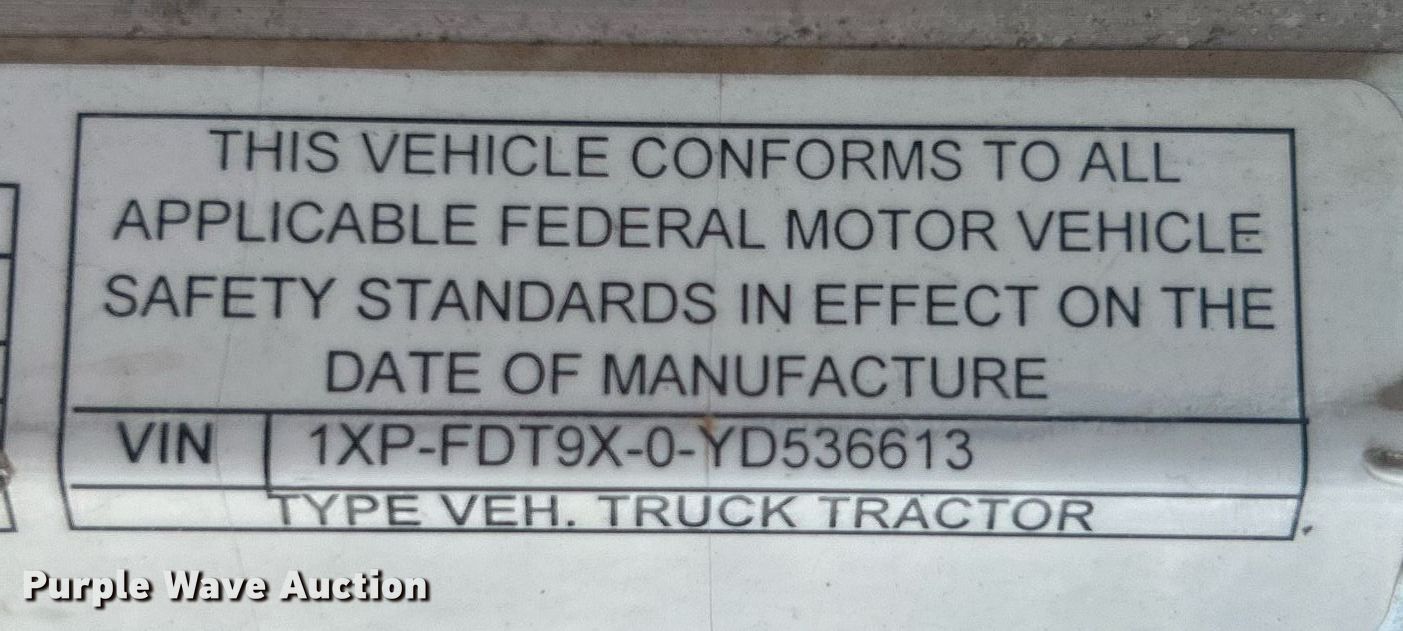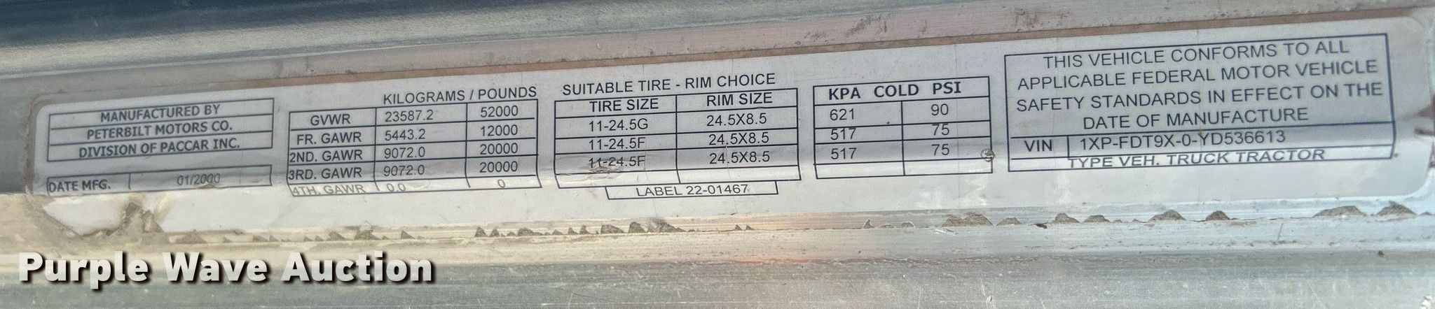 Purple Wave is selling a used Truck Tractor in Oklahoma. This item is a 2000 Peterbilt 378 semi truck with the following: Miles: 410,700 on odometer, Hours: 6,288 on meter, VIN: 1XPFDT9X0YD536613