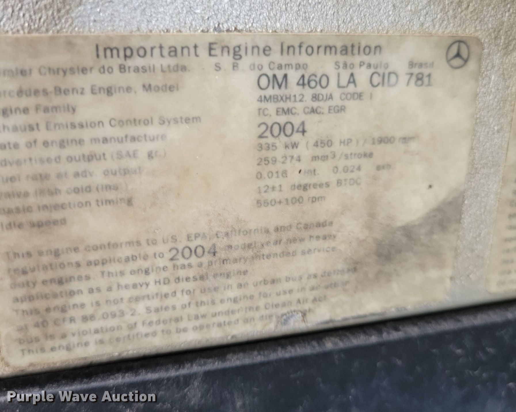 2005 Sterling LT9500 truck cab and chassis. Miles: 296,544 on odometer, VIN: 2FZHAZCV45AN65216. Engine Mercedes Benz, Displacement: 781 C.I.D., Cylinders: 6, Fuel type: Diesel, HP: 450, Engine brake. Transmission Eaton Fuller Roadranger, Manual, Speed: 10. Chassis Axles: Tandem, Differential lock: Full, Suspension: Spring over walking beam, Brakes: Air, PTO, Truck chassis: 24' 5", GVWR: 66,000 lbs FAWR: 20,000 lbs, IAWR: 23,000 lbs, RAWR: 23,000 lbs. Interior AC, Heat, Heated mirrors, Cruise control, Air ride cab. Features Fuel tank: Dual. Tires Front: 425/65R22.5, Rear: 11R22.5. Iowa title. Seller is an Iowa licensed motor vehicle dealer. The buyer may be required to pay sales tax and/or registration fees to the dealer prior to taking possession. Buyers may be required to provide identification to the licensed dealer to comply with Iowa state laws. Title will be assigned and distributed by the dealer. Please contact the seller for distribution questions. Diamond Trail Sales. 5850 S 112th Ave W. Monroe, IA 50170