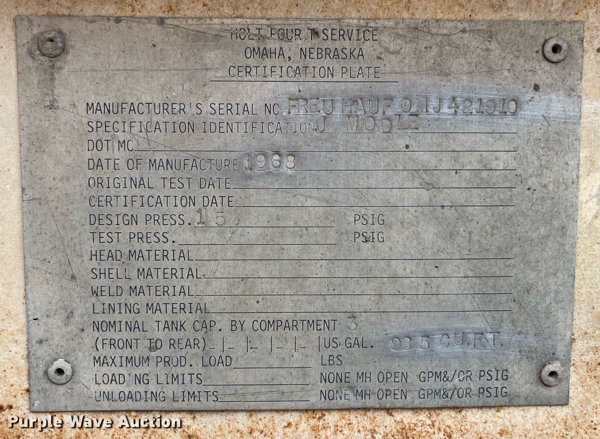 Purple Wave is selling a used Tank Trailer in Missouri. This item is a 1968 Fruehauf pneumatic dry bulk trailer with the following: VIN: FREUHAUFOMJ421910, Unit #: 87-306