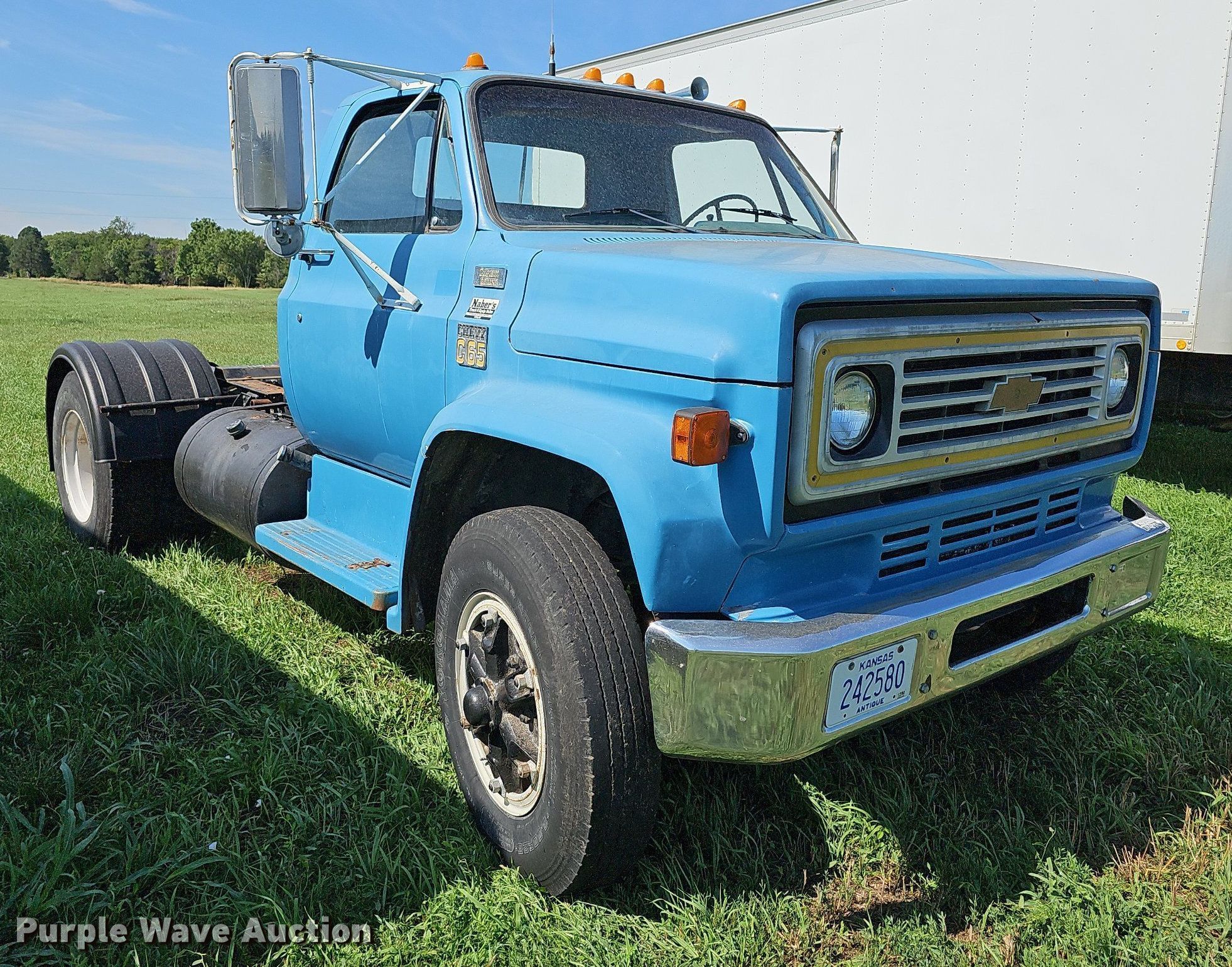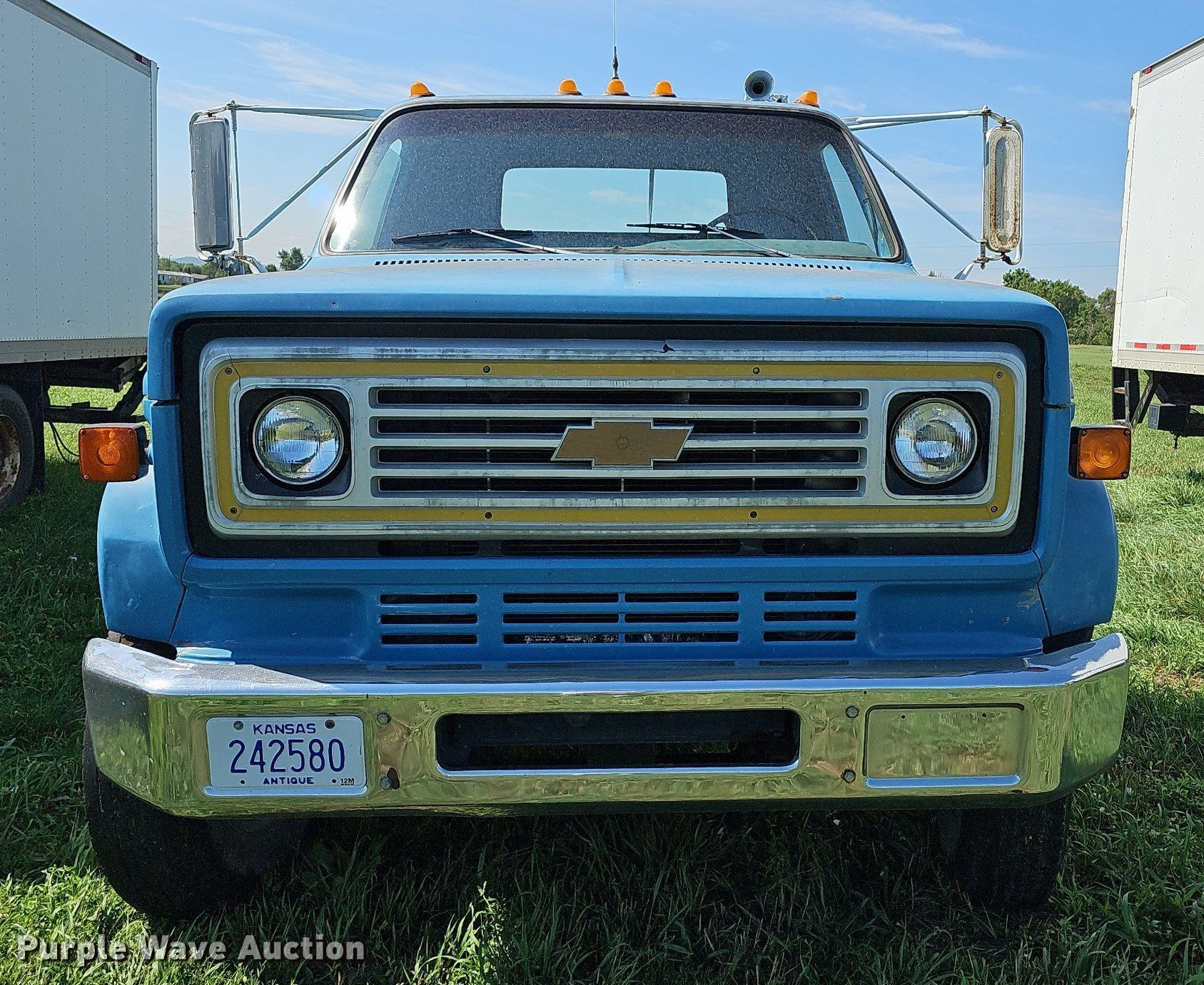 1978 Chevrolet Custom Deluxe 65 truck cab and chassis. Miles: 5,729 on odometer, VIN: CCE668V121160. Engine Cylinders: 8, Fuel type: Gas. Transmission Manual, Speed: 5, plus 2. Chassis Axles: Single, Suspension: Spring, Brakes: Air, Truck chassis: 9' 7", GVWR: 23,160 lbs FAWR: 7,000 lbs, RAWR: 16,160 lbs, Wheelbase: 152". Interior Heat. Features Ball Hitch: 2 5/16" , Fuel tank: Single. Tires Front: 9.00R20, Rear: 11R22.5. Notes Windshield chipped or cracked. Kansas antique title. Title distribution may be delayed up to 14 days from verification of funds. R&P Express. Alma, KS 66401