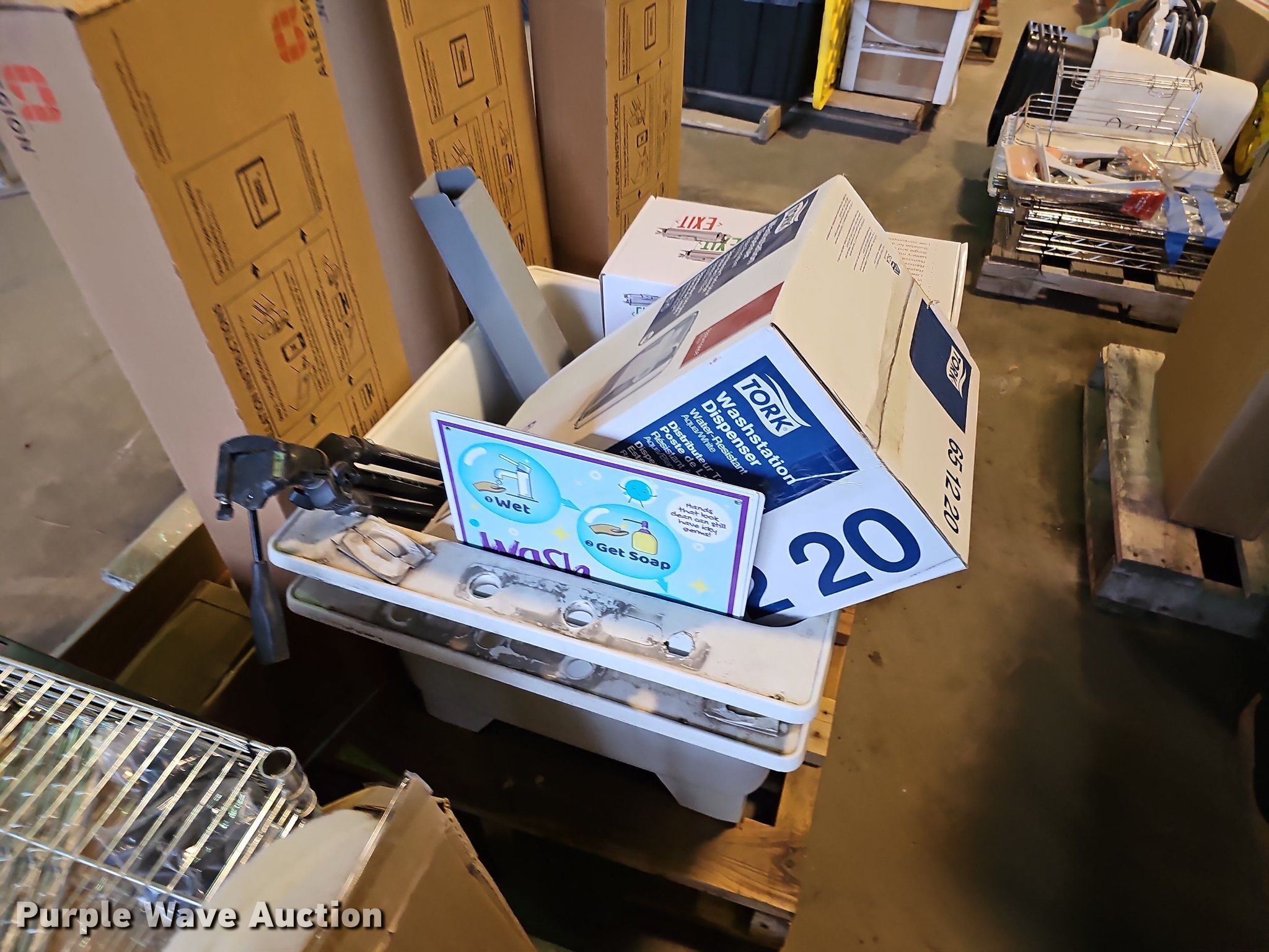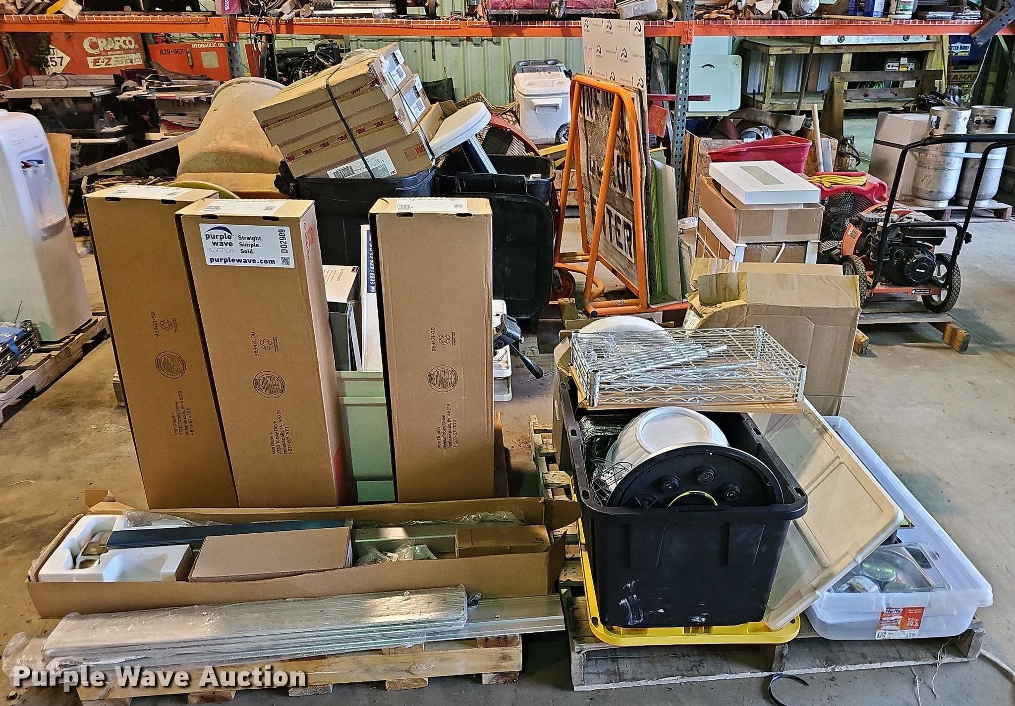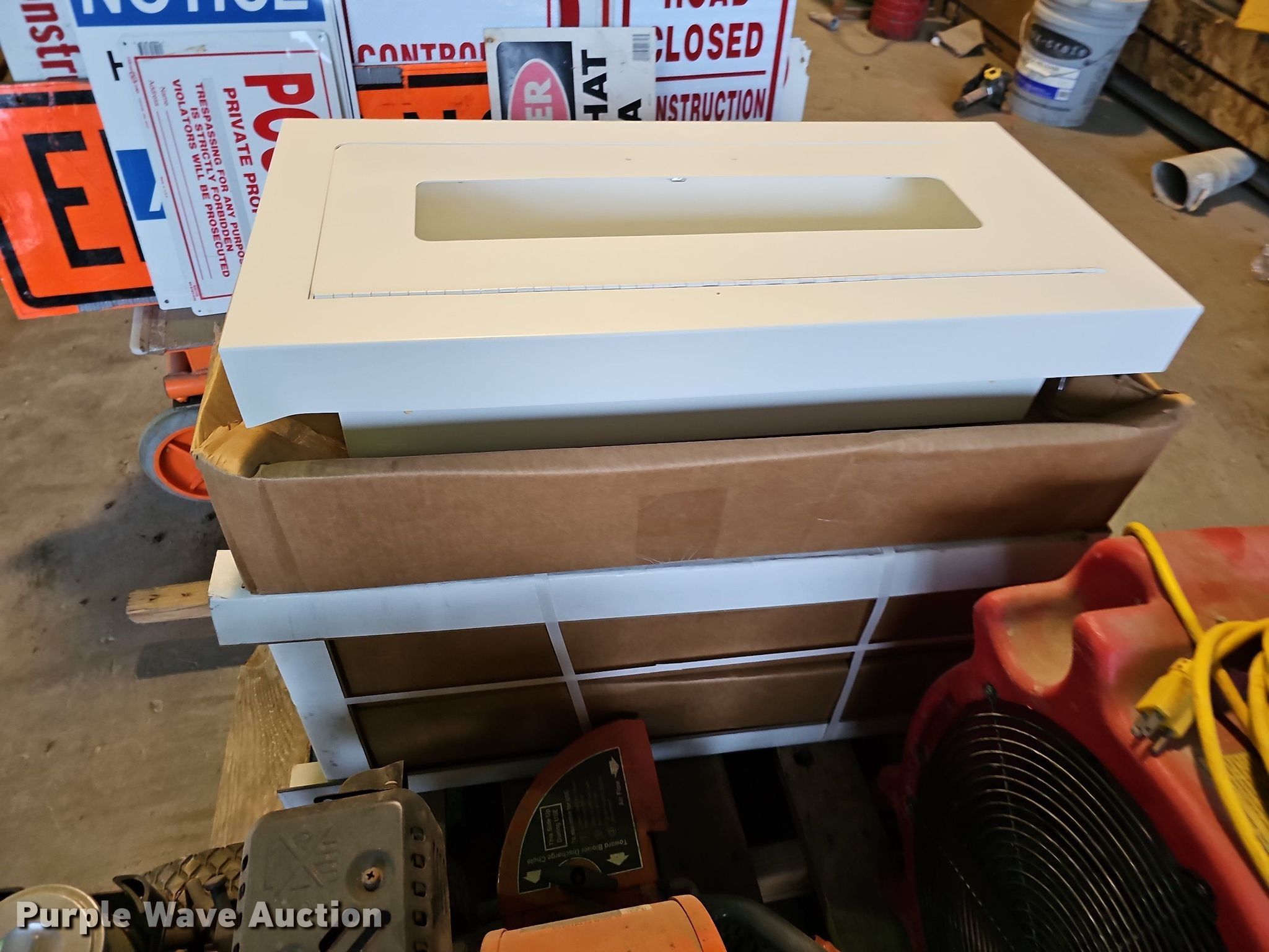 Purple Wave is selling a used Tools in Nebraska. This item is a Tools with the following: (4) 36" L to 48" L door jambs, (4) emergency door handles, Hubbell electric reel, Exit sign, Wash station dispenser, Kitchenware, (9) boxes of buffer pads, Powermate Cyclone leaf blower, Single cylinder gas engine, (3) fire extinguisher cabinets, Cart, Signs, (2) shop fans, Comfee AC unit, Mortar mixer