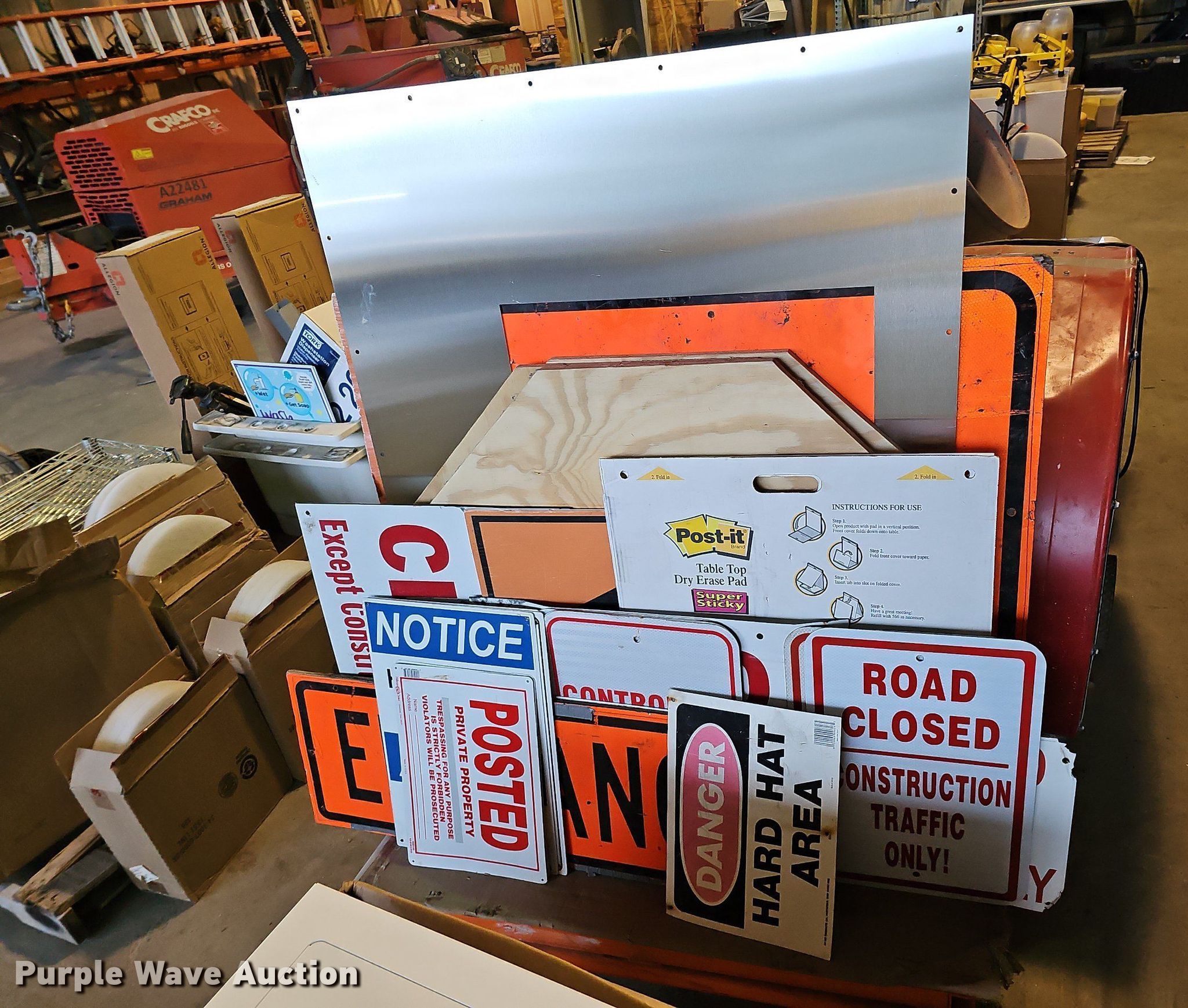 Tools. (4) 36" L to 48" L door jambs, (4) emergency door handles, Hubbell electric reel, Exit sign, Wash station dispenser, Kitchenware, (9) boxes of buffer pads, Powermate Cyclone leaf blower Single cylinder gas engine, (3) fire extinguisher cabinets , Cart Signs, (2) shop fans, Comfee AC unit, Mortar mixer. Graham Construction, Inc.. 2209 North 88th Street. Omaha, NE 68134