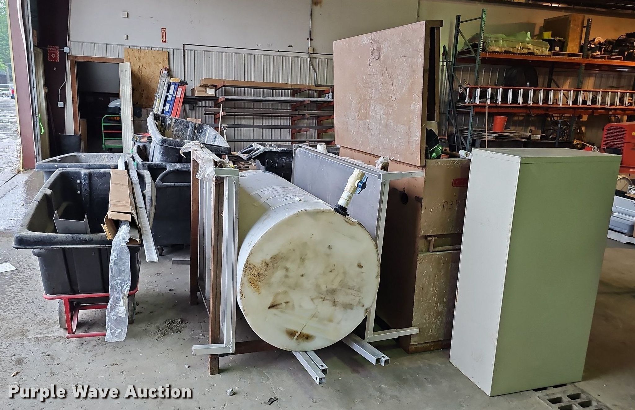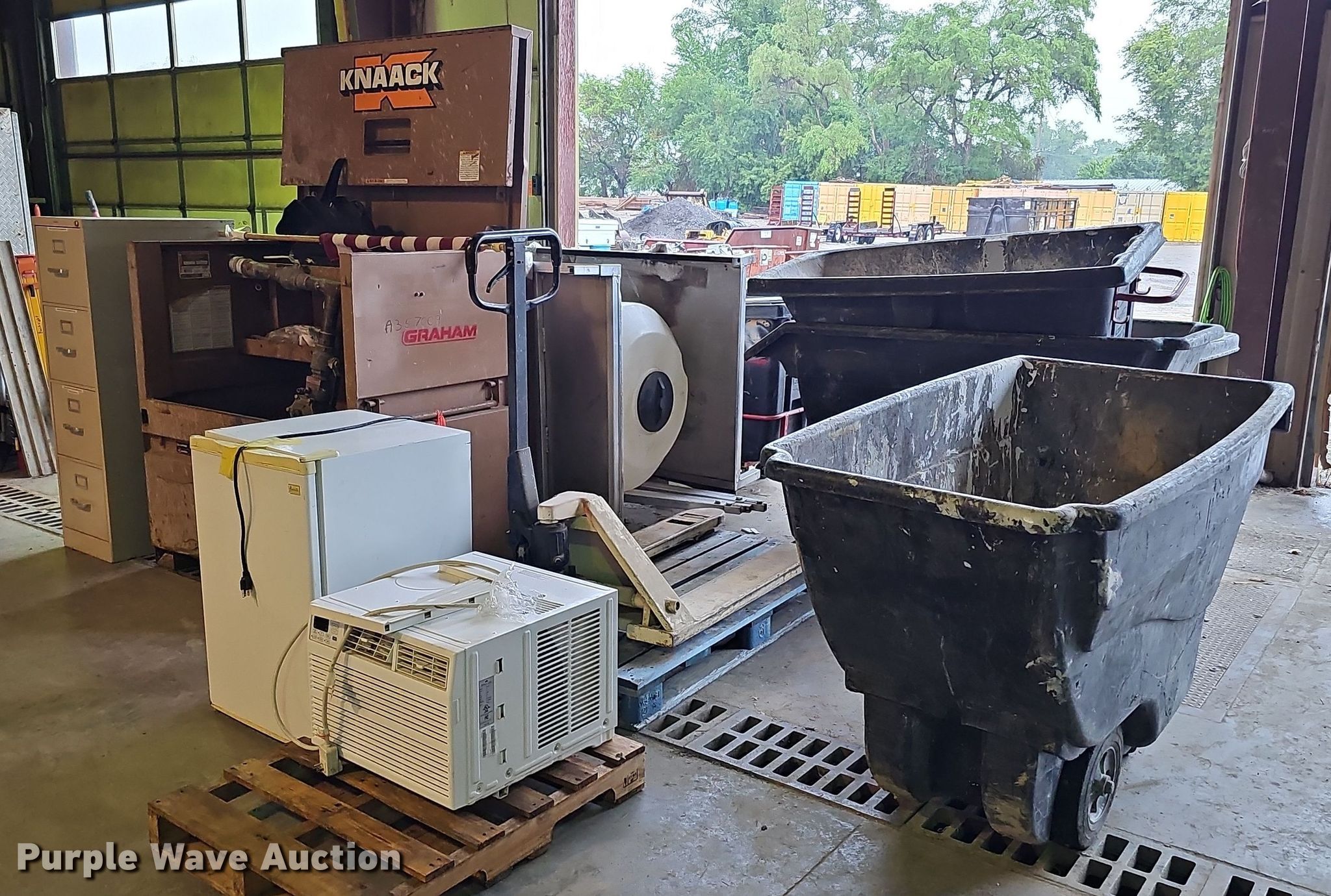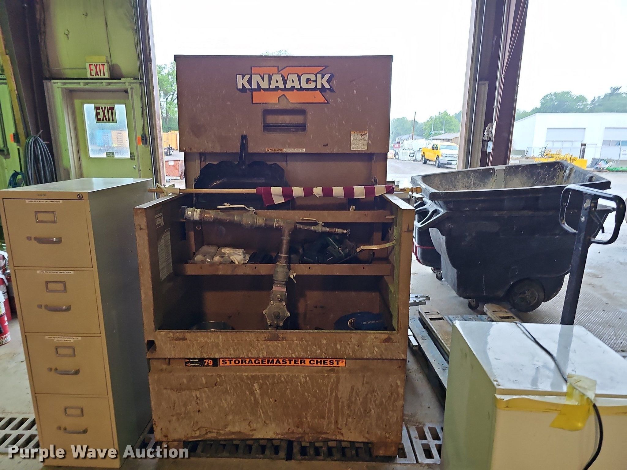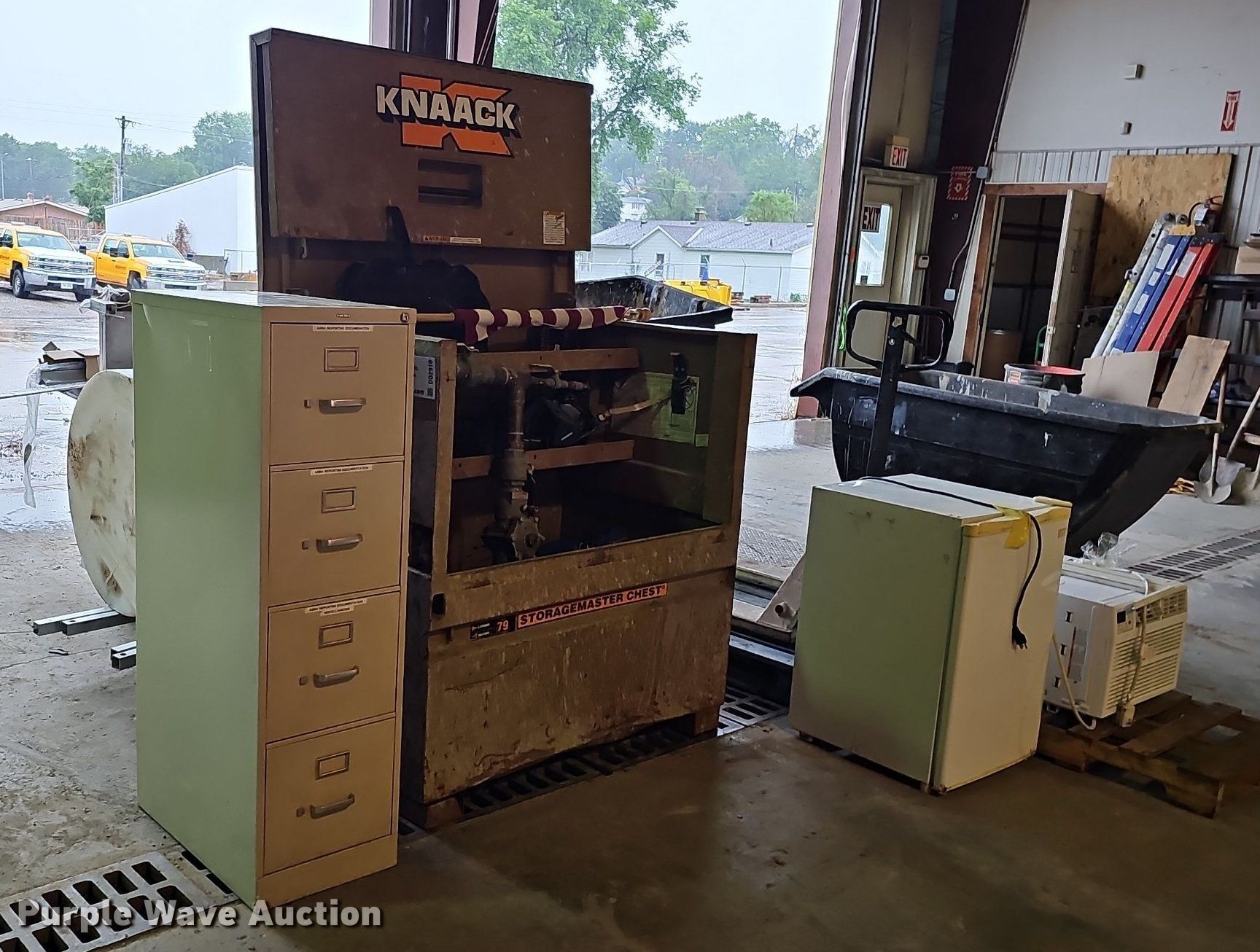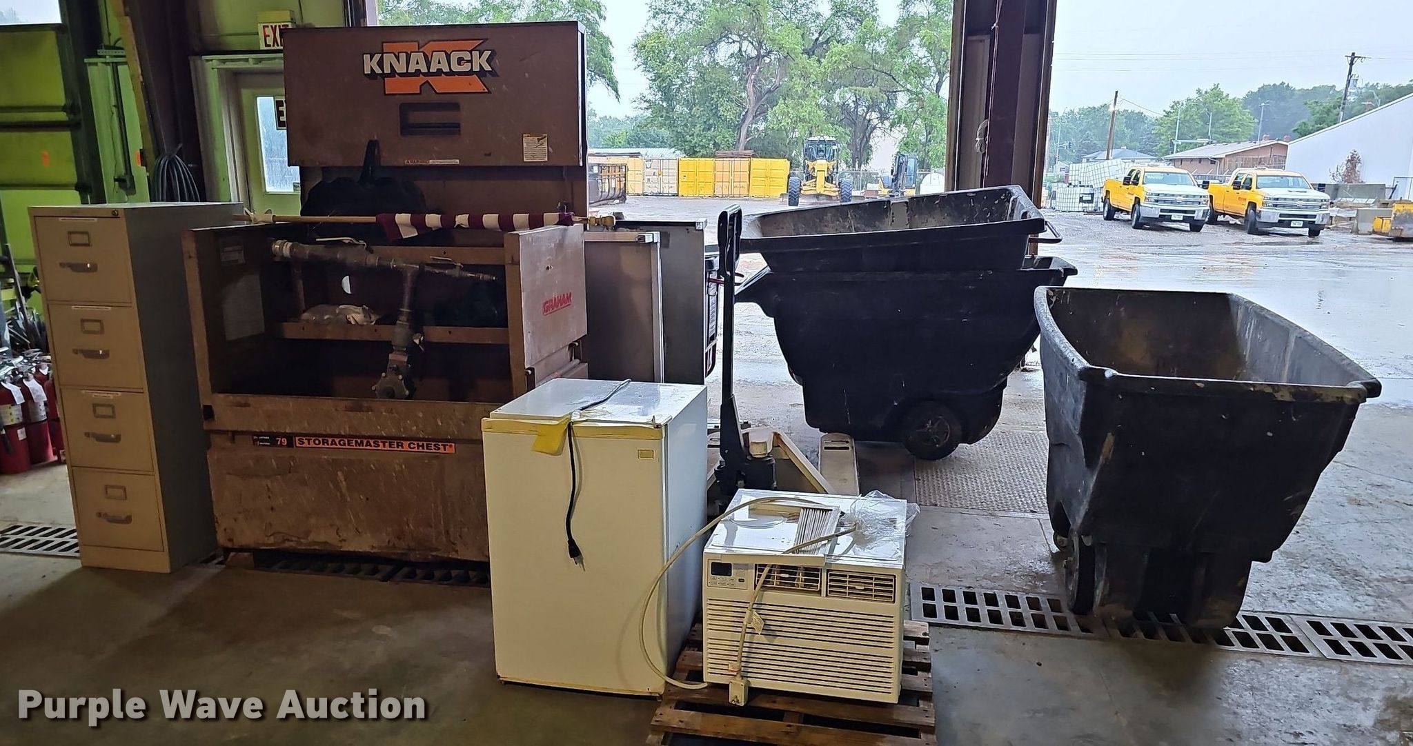 Purple Wave is selling a used Tools in Nebraska. This item is a Tools with the following: Knaack 79 tool box, 48"W x 30"D x 49"H, Contents included, 15"W x 25"D x 52"H filing cabinet, Avanti mini fridge, Volts: 110, Jet 48"L pallet dolly, (5) Rubbermaid refuse carts, 175 gallon poly tank, 54" H x 32" D, (2) stands, 60"L x 40"W x 5"H