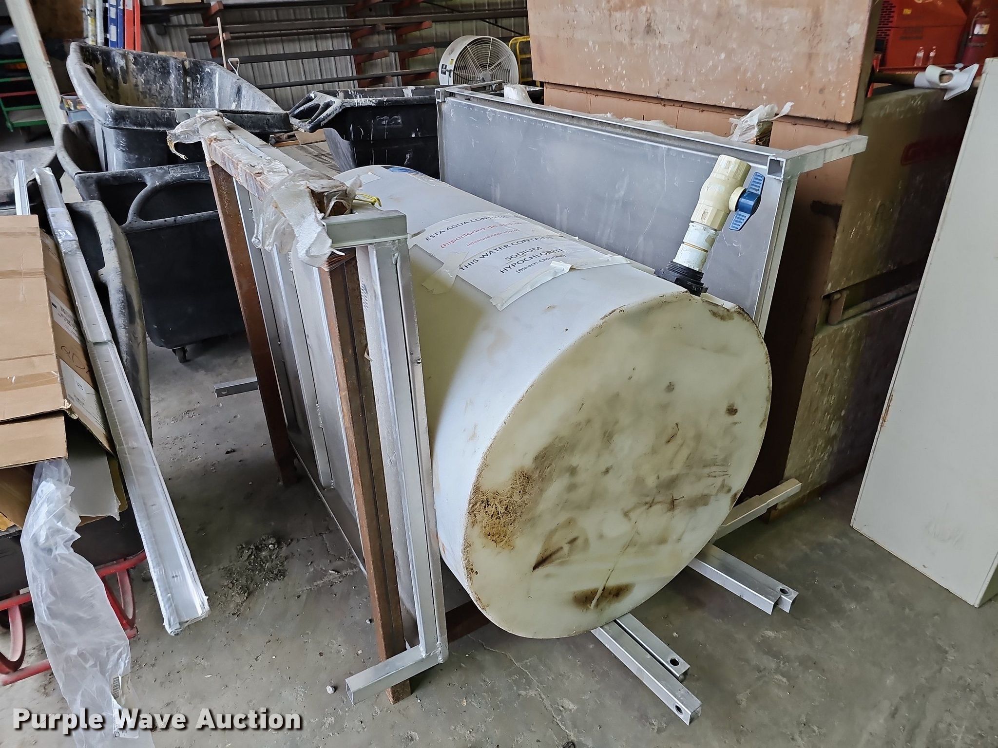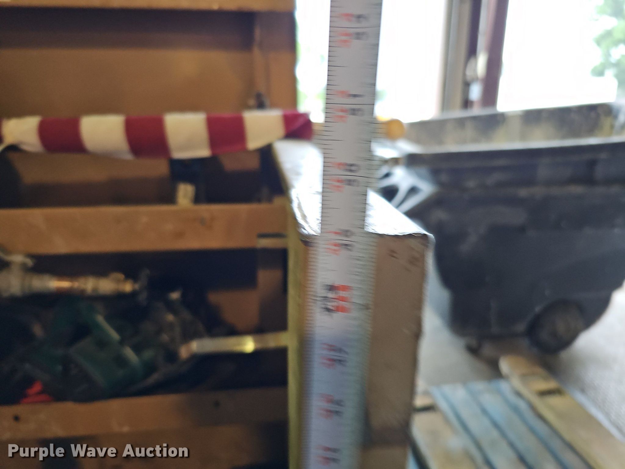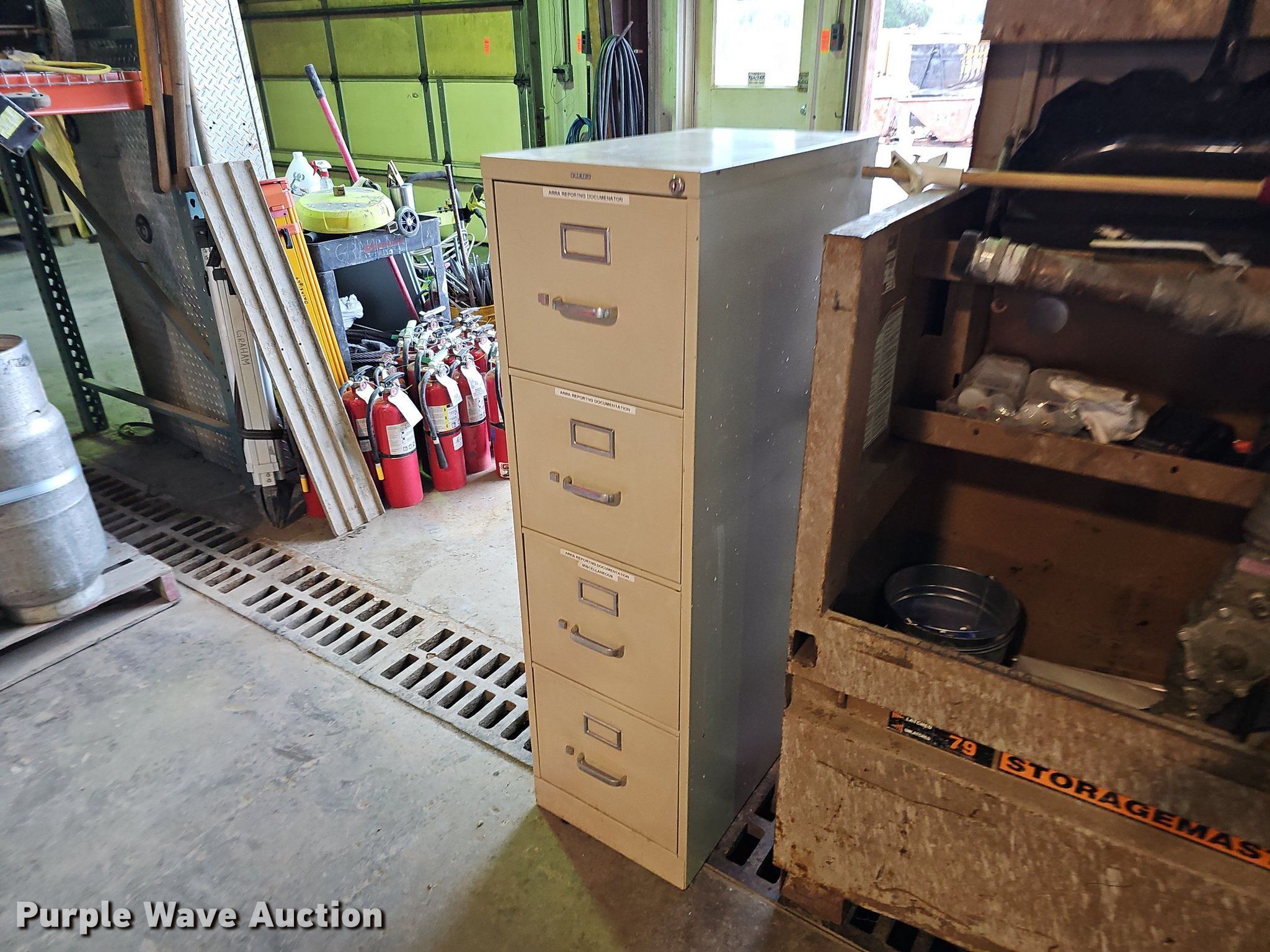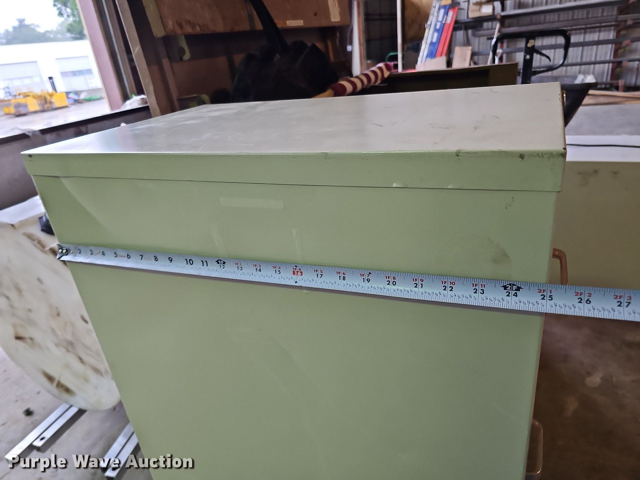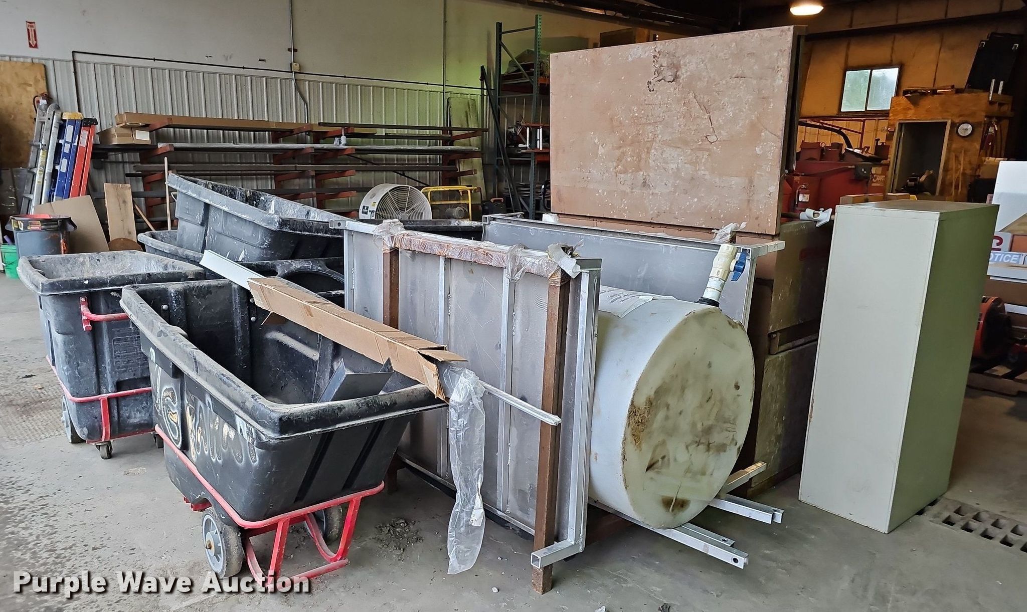 Purple Wave is selling a used Tools in Nebraska. This item is a Tools with the following: Knaack 79 tool box, 48"W x 30"D x 49"H, Contents included, 15"W x 25"D x 52"H filing cabinet, Avanti mini fridge, Volts: 110, Jet 48"L pallet dolly, (5) Rubbermaid refuse carts, 175 gallon poly tank, 54" H x 32" D, (2) stands, 60"L x 40"W x 5"H