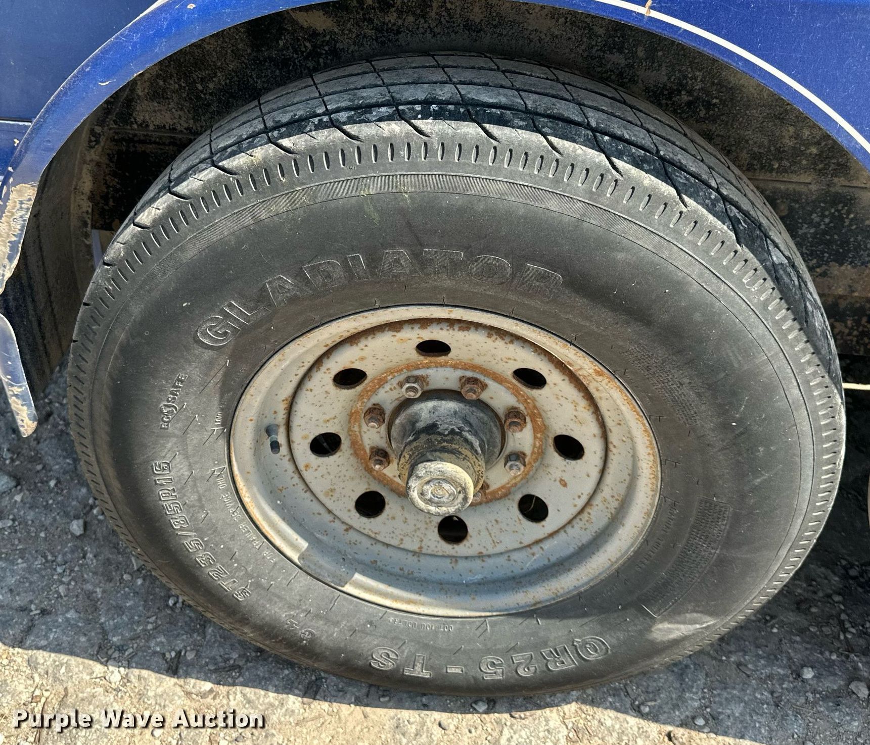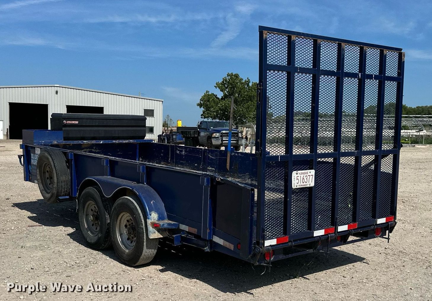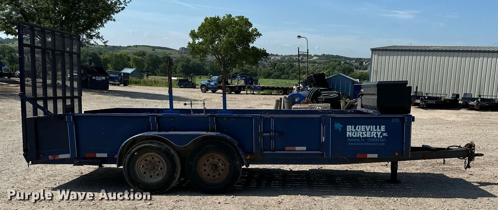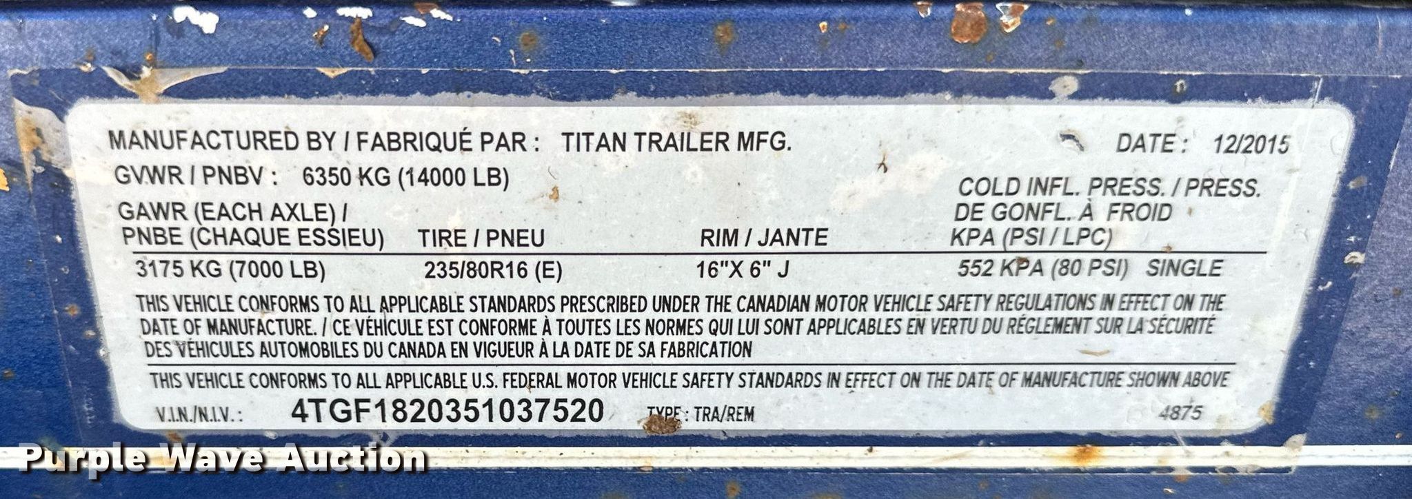 2005 Titan 4875 utility trailer. VIN: 4TGF1820351037520. Dimensions Overall: 22' L x 102" W, Deck: 16' L x 81" W, Tail length: 2', Ramps: Manual Length: 6'. Features Deck type: Wood. Chassis Hitch: Pintle, Landing gear: Single, Suspension: Spring, Brakes: Electric, Axles: Tandem, GVWR: 14,000 lbs. Tires Steel wheels, Size: 235/85R16. Kansas title. Title distribution may be delayed up to 14 days from verification of funds. Blueville Landscape. 4539 Anderson Avenue. Manhattan, KS 66503