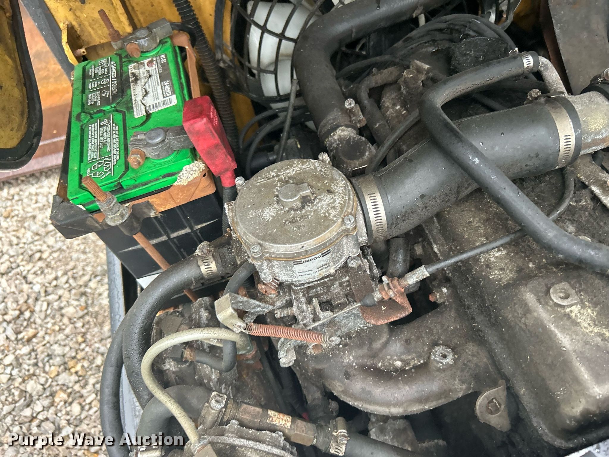2000 Caterpillar GC18K forklift. Hours: 7,432 on meter, Serial: AT81C-02633. Engine Cylinders: 4, Fuel type: LPG LP bottle: Not included. Transmission Powershift. Operators station Canopy. Features Maximum lift capacity: 2,700 lbs, Maximum lift height: 188", Mast stages: 3, Side shift, Mast tilt, Fork length: 42". Tires Front: 18X6X12, Rear: 14x4x8, Solid. Notes Non-operational unit. 15107 North 137th East Avenue. Collinsville, OK 74021