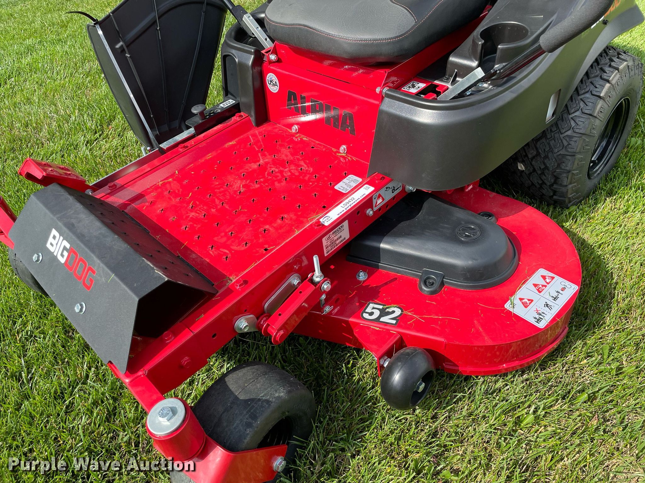 Purple Wave is selling a used Lawn Mower in Kansas. This item is a Big Dog Alpha ZTR lawn mower with the following: Hours: 0.2 on meter, Cutting width: 52", Serial: 22043298