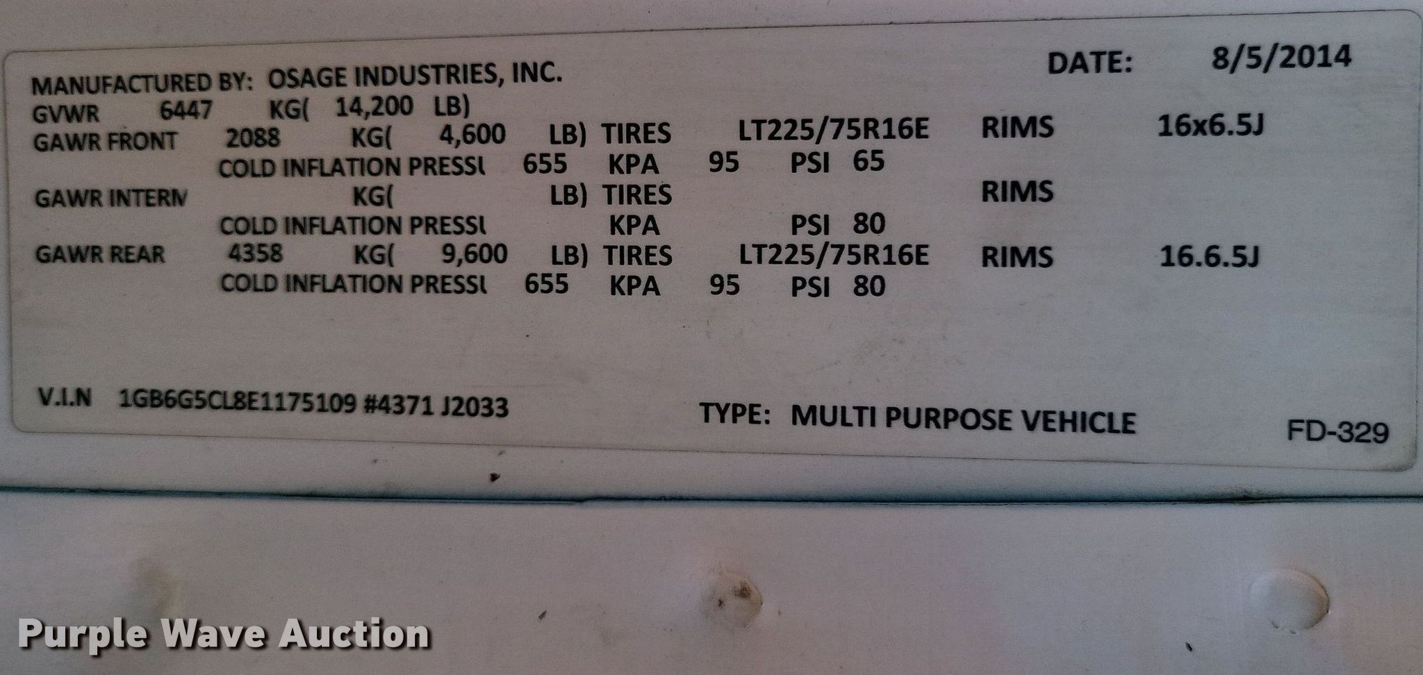 2014 Chevrolet Express G4500 van cab and chassis. Miles: 176,473 on odometer, VIN: 1GB6G5CL8E1175109. Engine Displacement: 6.6L, Cylinders: 8, Fuel type: Diesel. Transmission Automatic. Chassis Axles: Single, Suspension: Spring, Brakes: Hydraulic, Truck chassis: 14', GVWR: 14,200 lbs FAWR: 4,600 lbs, RAWR: 9,600 lbs. Interior AC, Heat, Heated mirrors, Power windows, Power locks, Cruise control. Tires Size: LT225/75R16. Indiana title. Seller is a Missouri licensed motor vehicle dealer. Title will be assigned and distributed by the dealer. Please contact the seller for distribution questions. Title distribution may be delayed up to 14 days from verification of funds. South 61 LLC. 111 S Kingshighway. Perryville, MO 63775