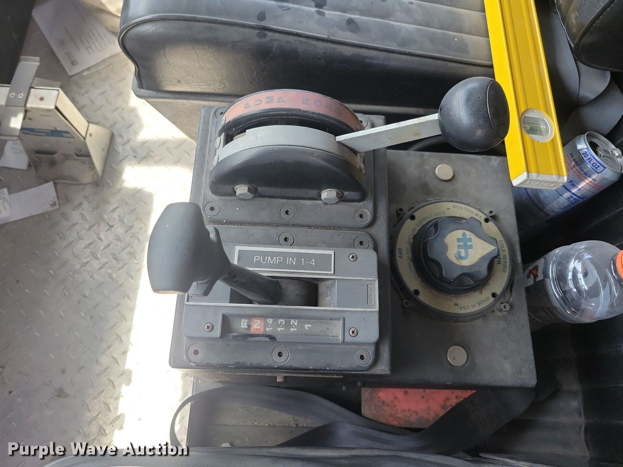 1984 Sutphen TS-1004 aerial platform fire truck. Miles: 15,997 on odometer, Hours: 263 on meter, VIN: 1S9A3JFEXE1003218. Engine Detroit Diesel 8V-92TA, Serial: 8VF-085286, Displacement: 736 C.I.D., Cylinders: 8, Fuel type: Diesel, HP: 445. Transmission Automatic. Chassis Axles: Tandem, Suspension: Spring, Brakes: Air. Interior Auxiliary controls. Features Fire truck body Aerial Sutphen TS-100, Hours: 17 on meter, Maximum height: 100', Maximum lift capacity: 700 lbs, Stabilizers Quantity: 2, Pump 1,500 gpm, Ground ladder, Generator Onan 6.0DJE-3CR/96AG, kW: 5, PA/ siren controls. Tires Front: 315/80R22.5, Rear: 10.00-20. Iowa title. Seymour, IA 52590