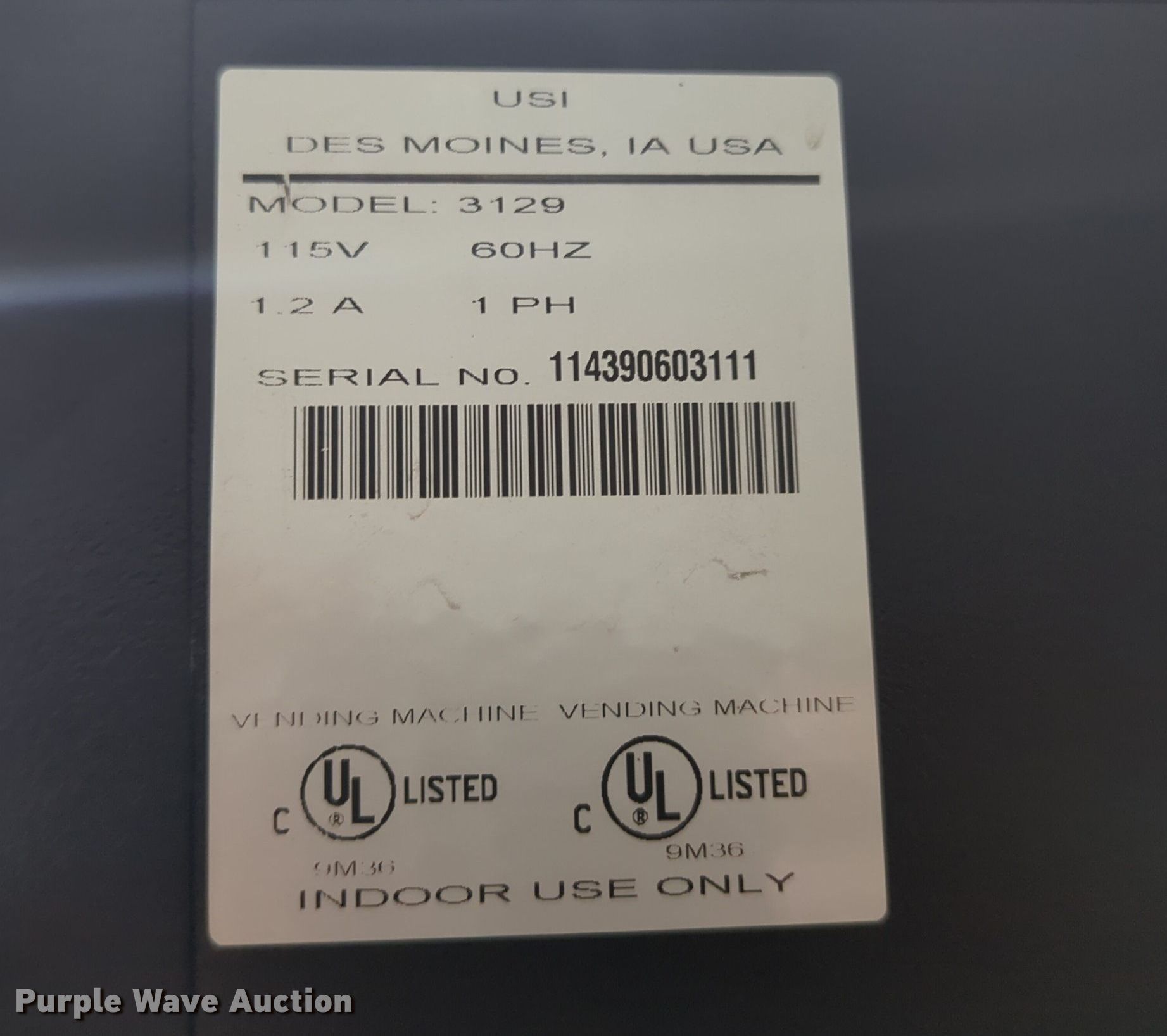 Purple Wave is selling a used Retail Displays in Oklahoma. This item is a USI 3129 vending machine with the following: Serial: 114390603111, Volts: 115V, Hz: 60, Phase: Single