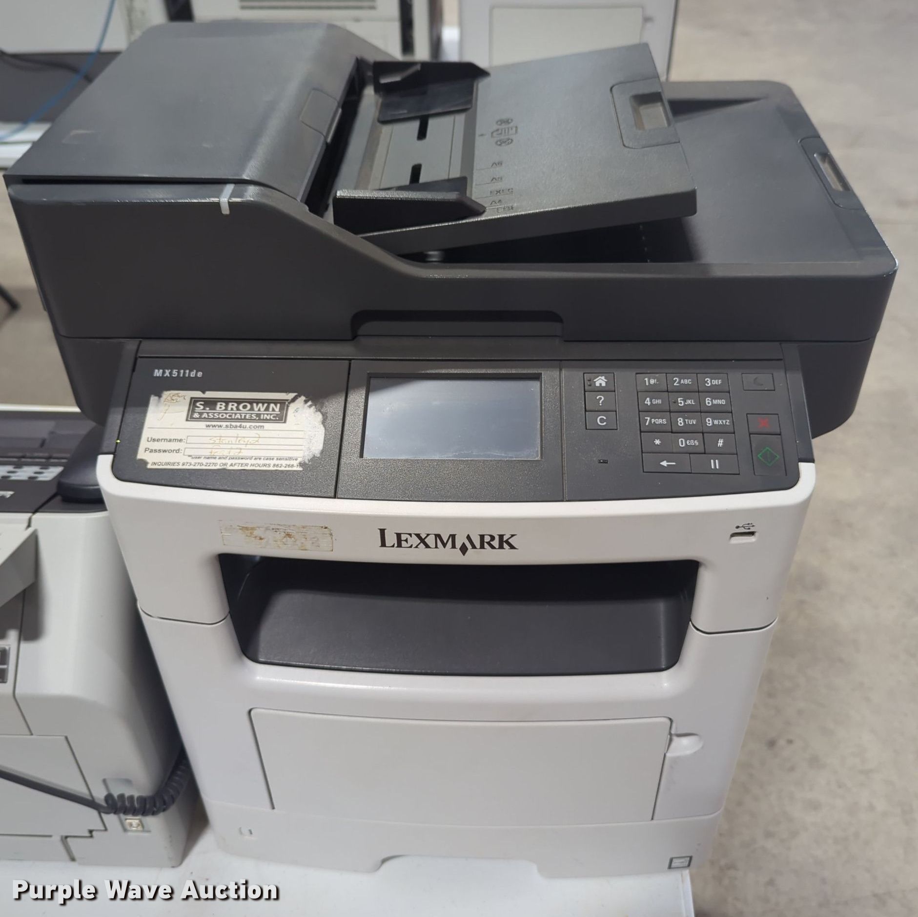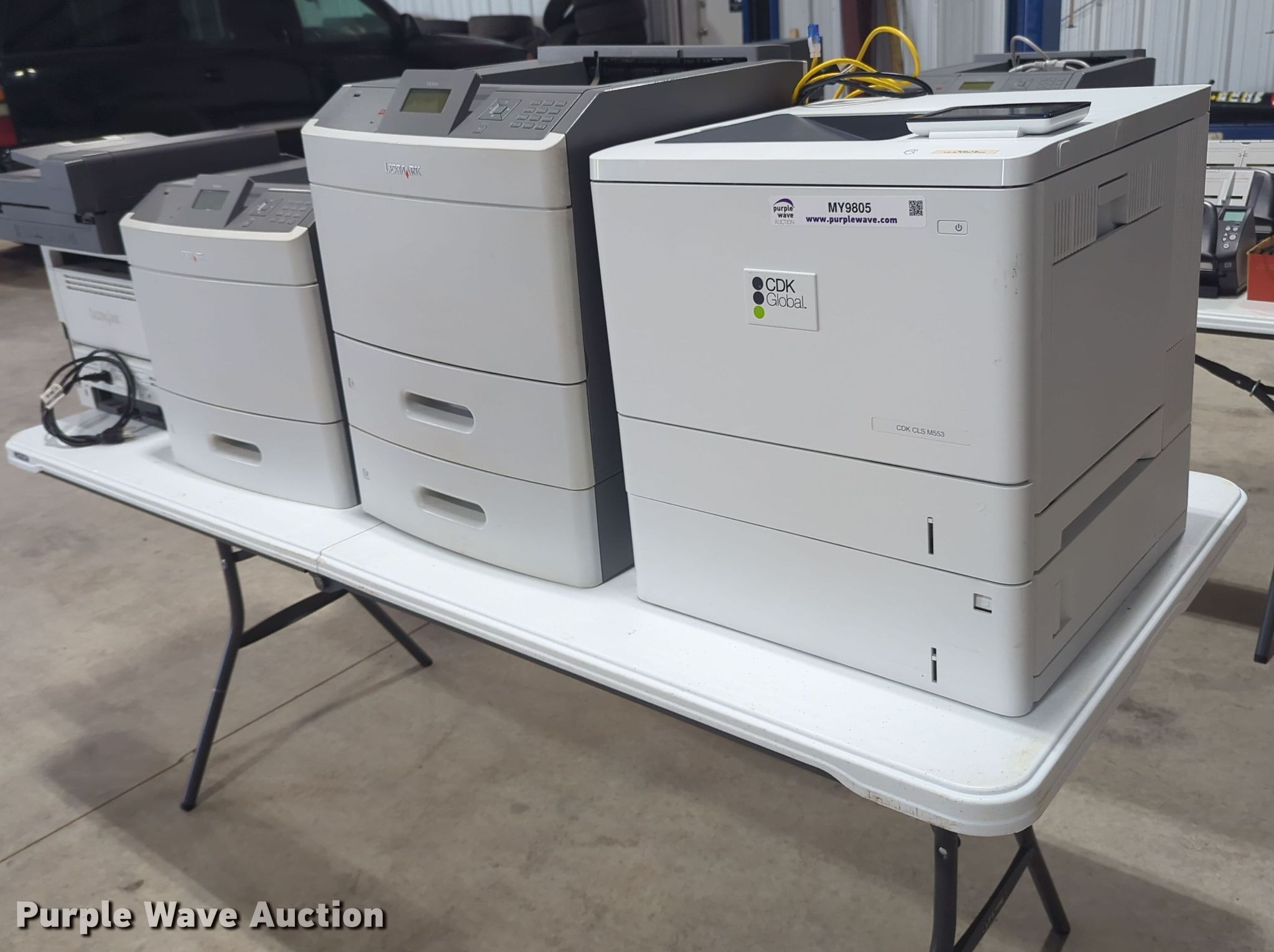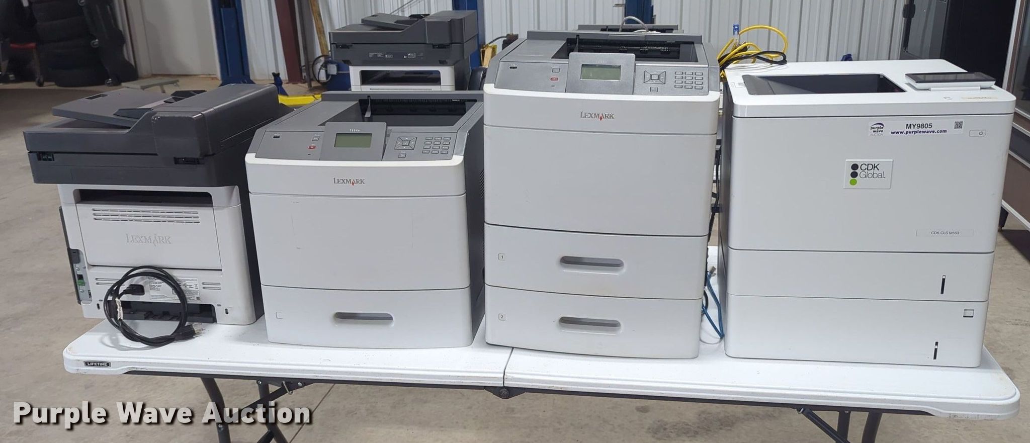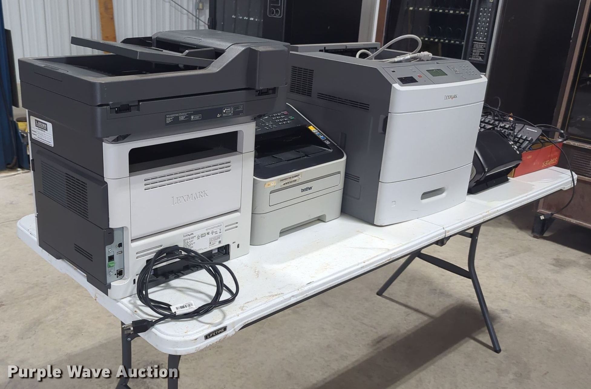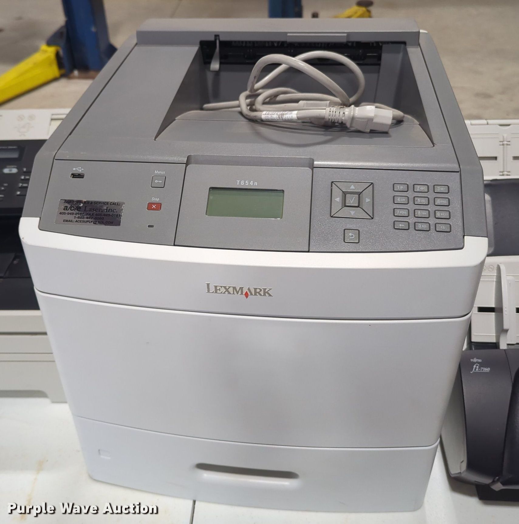 Purple Wave is selling a used Copy or Printing Machine in Oklahoma. This item is a Office supplies with the following: (2) Fujitsu F-7160 scanner, Brother 2840 fax machine, Multifunction printer/copiers, Lexmark T654N, Lexmark 7015-6470, Lexmark 7015-470, (2) Lexmark 4062-41A, CDK CLS M553