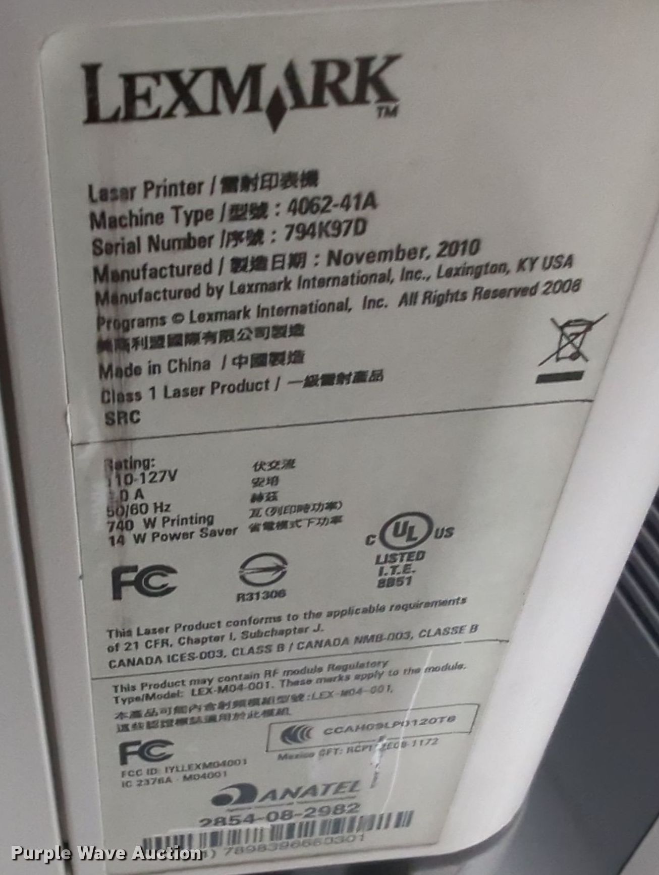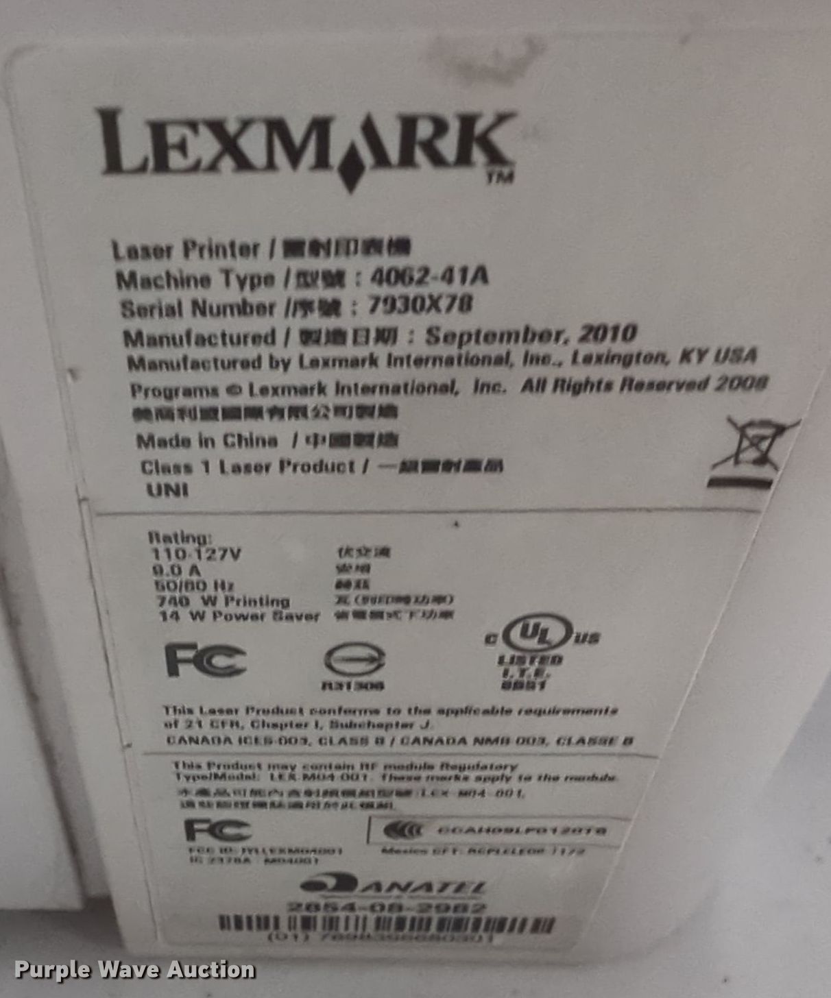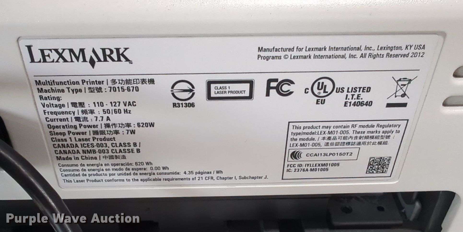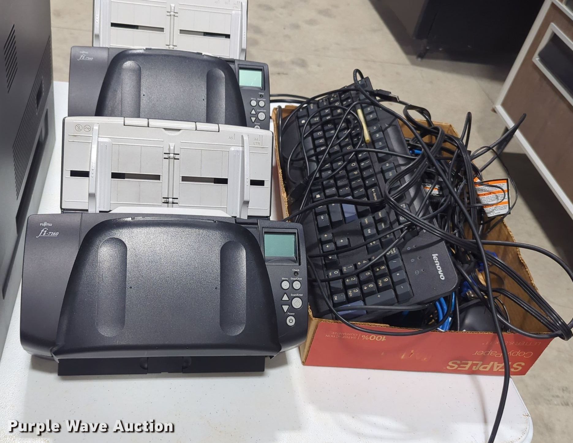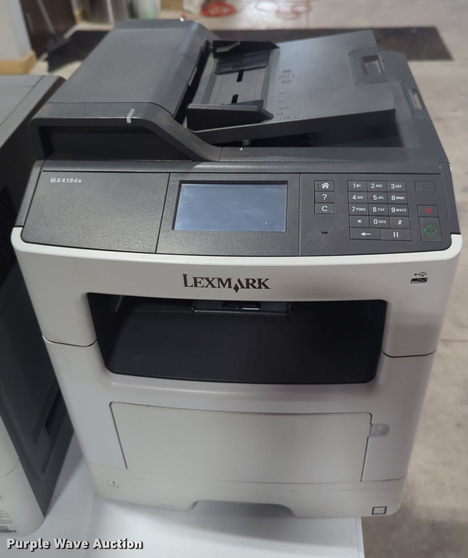 Purple Wave is selling a used Copy or Printing Machine in Oklahoma. This item is a Office supplies with the following: (2) Fujitsu F-7160 scanner, Brother 2840 fax machine, Multifunction printer/copiers, Lexmark T654N, Lexmark 7015-6470, Lexmark 7015-470, (2) Lexmark 4062-41A, CDK CLS M553