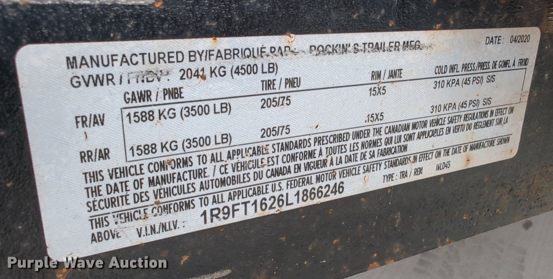 2020 Rocking S utility trailer. VIN: 1R9FT1626L1866246. Dimensions Overall: 20' L x 96" W, Deck: 16' L x 78" W. Features Deck type: Wood. Chassis Ball hitch: 2", Landing gear: Single, Suspension: Spring, Axles: Tandem, GVWR: 4,500 lbs, GAWR: 3,500 lbs. Tires Size: 205/75R15. Transfer of ownership documentation will be a bill of sale. Asher Auto Sales and Rental LLC. 16502 North Pennsylvania Avenue. Edmond, OK 73012