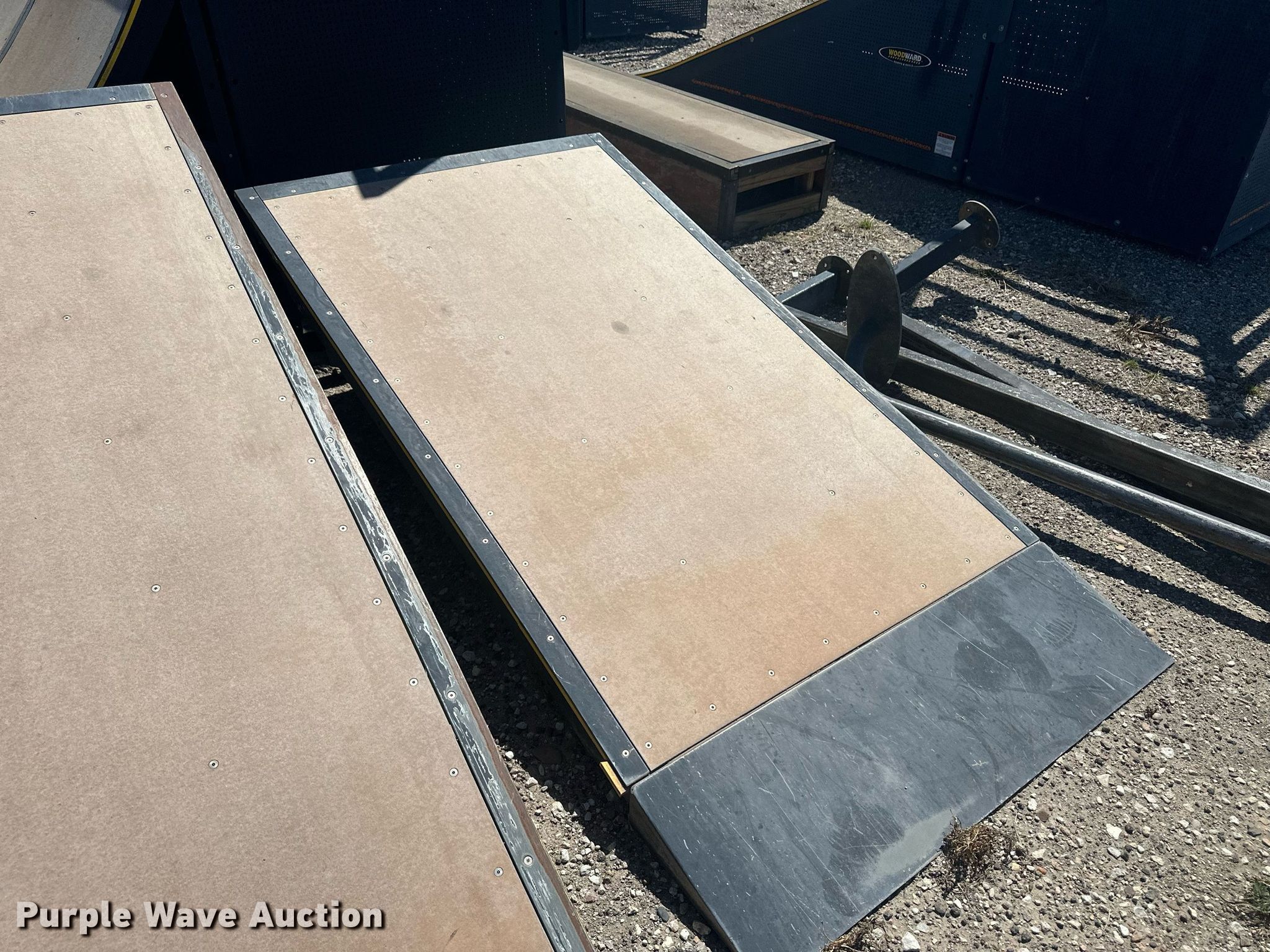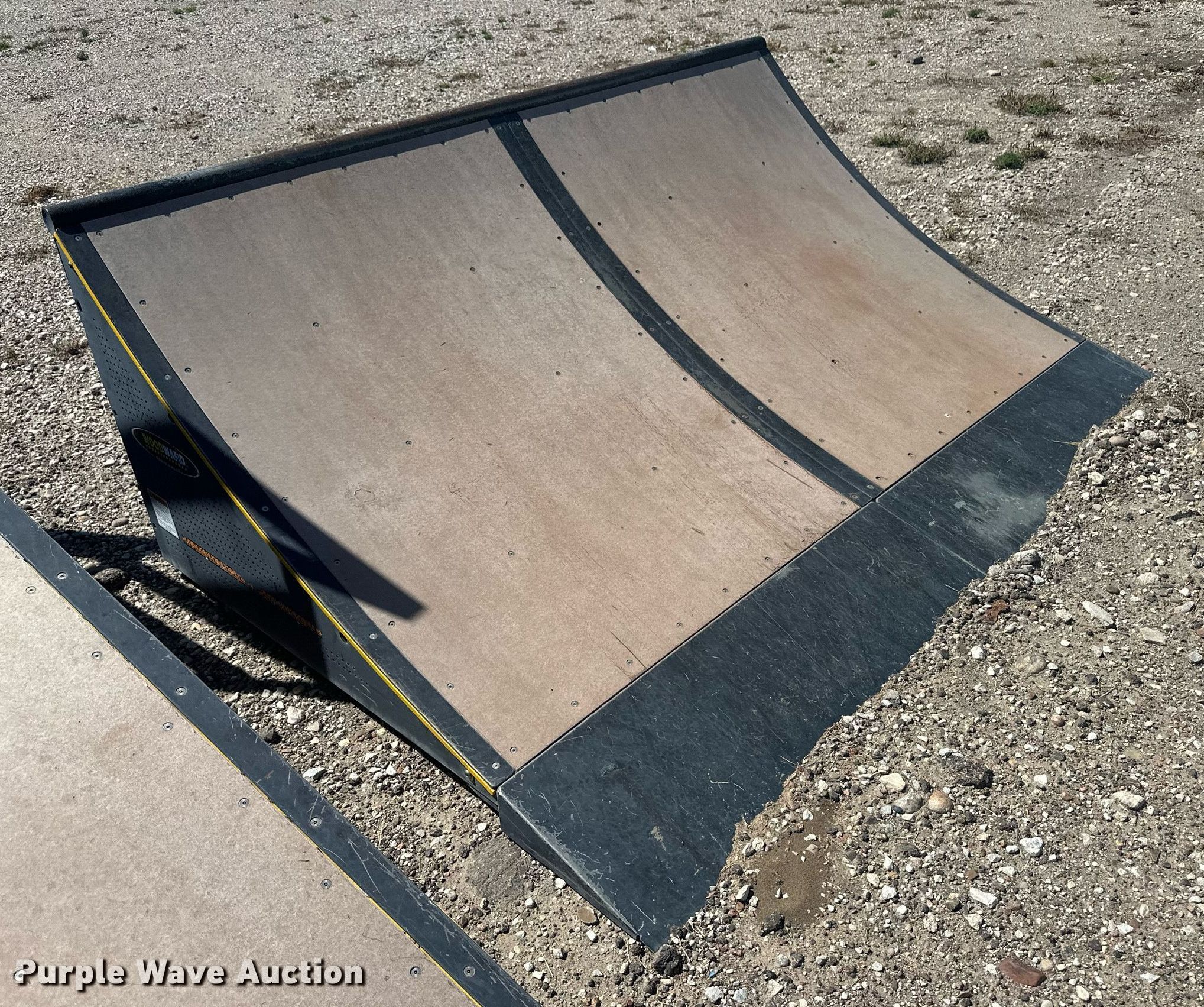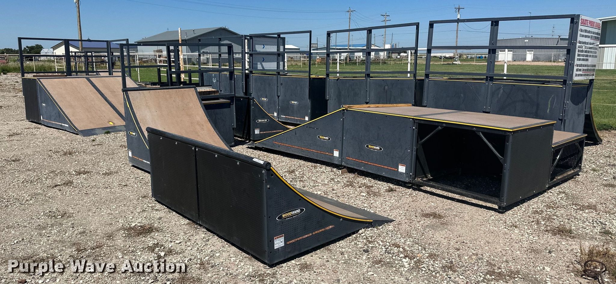 Purple Wave is selling a used Sporting Goods in Kansas. This item is a Woodward skate park equipment with the following: 22' W x 4' H half pipe, (2) 3' quarter pipes, 4' straight ramp with quarter pipe, 3' straight ramp, 2' to 3' step up ramp with quarter pipe, 3' curved ramp, 8' L x 15" H grinding rail, 16' L grinding rail, 12" to 24" H, 17.5' L round tube grinding rail, 12" to 24" H, 8' L x 12" H grinding box, Skateboard rack, Board capacity: 10, Disassembled