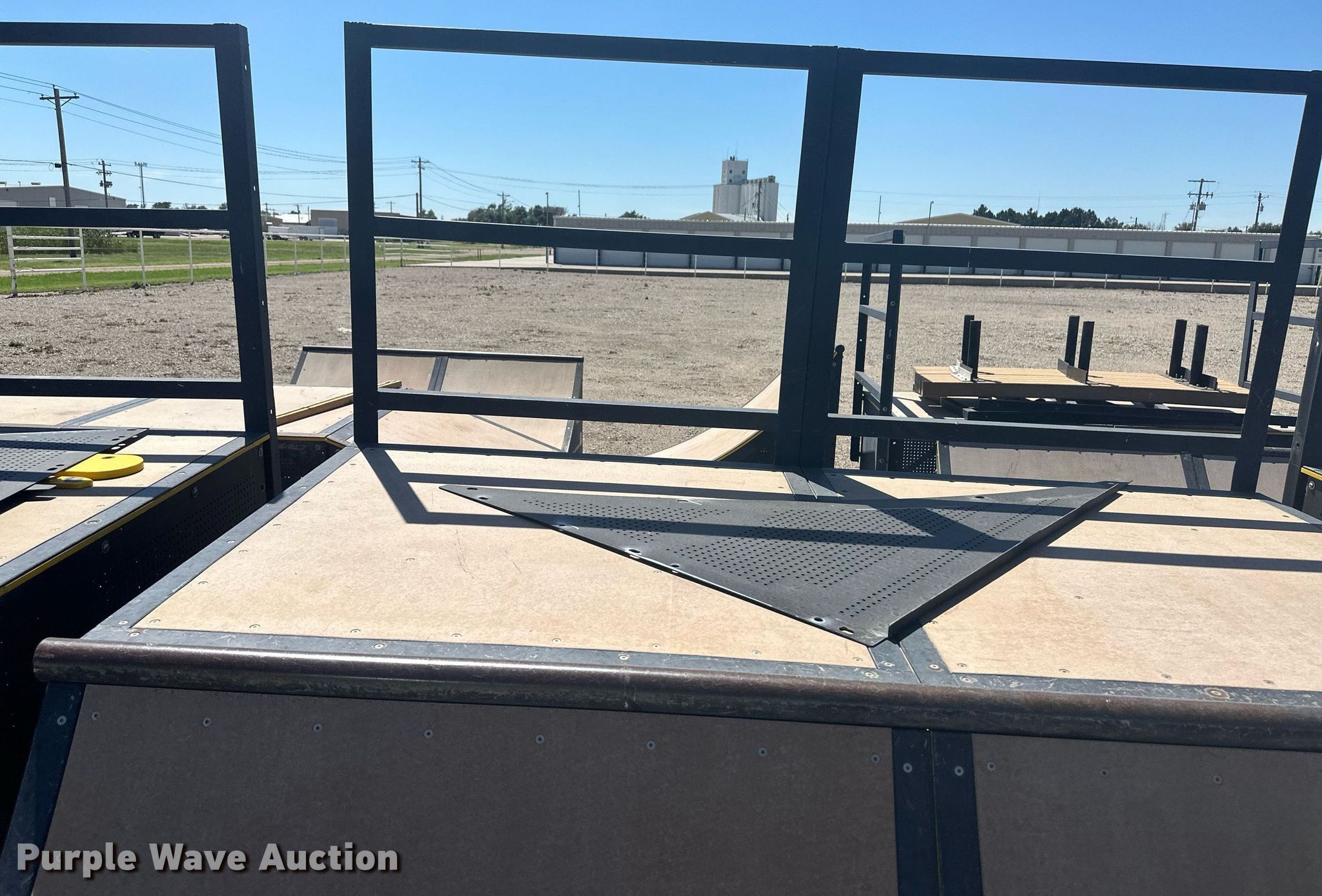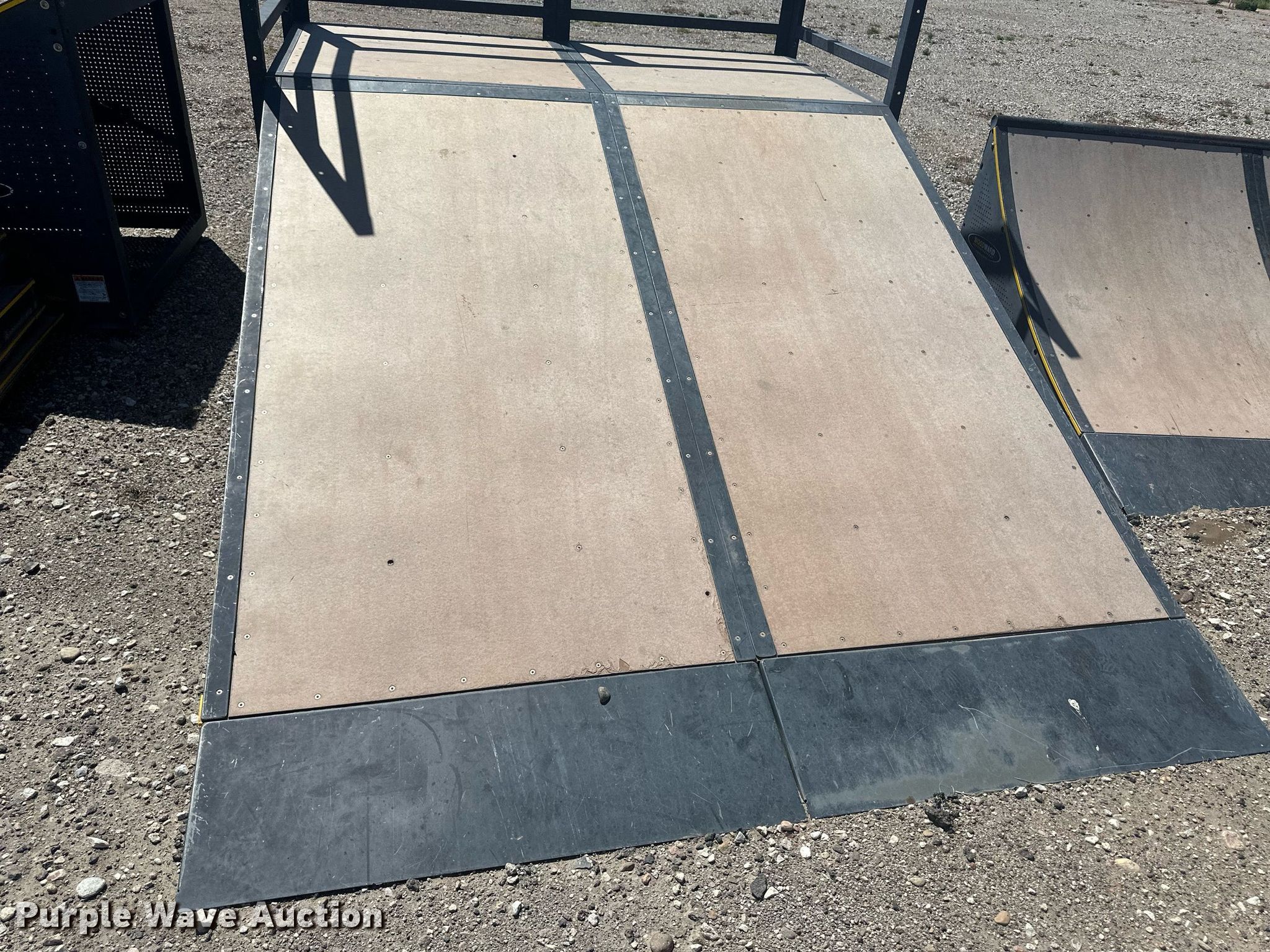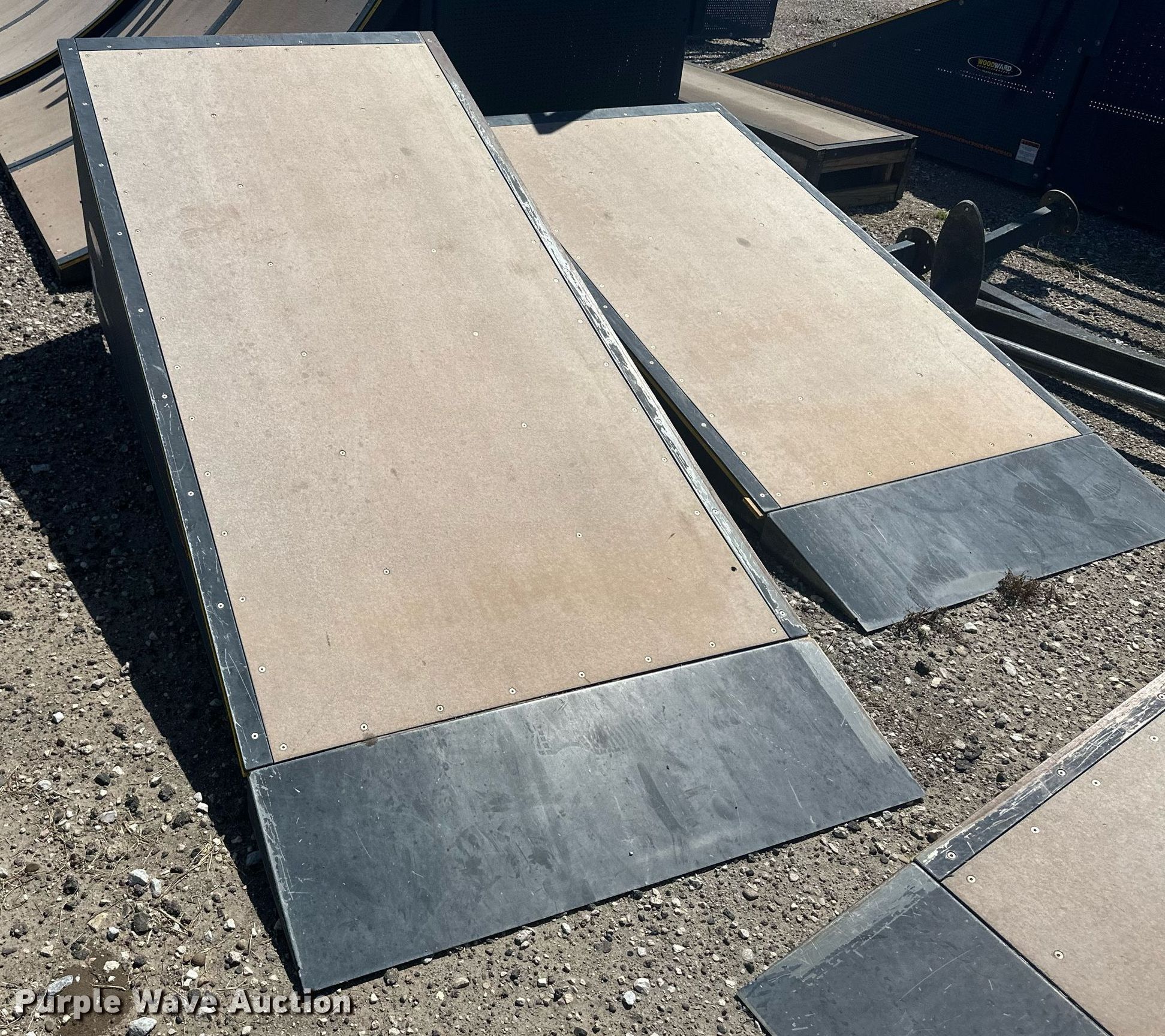 Purple Wave is selling a used Sporting Goods in Kansas. This item is a Woodward skate park equipment with the following: 22' W x 4' H half pipe, (2) 3' quarter pipes, 4' straight ramp with quarter pipe, 3' straight ramp, 2' to 3' step up ramp with quarter pipe, 3' curved ramp, 8' L x 15" H grinding rail, 16' L grinding rail, 12" to 24" H, 17.5' L round tube grinding rail, 12" to 24" H, 8' L x 12" H grinding box, Skateboard rack, Board capacity: 10, Disassembled