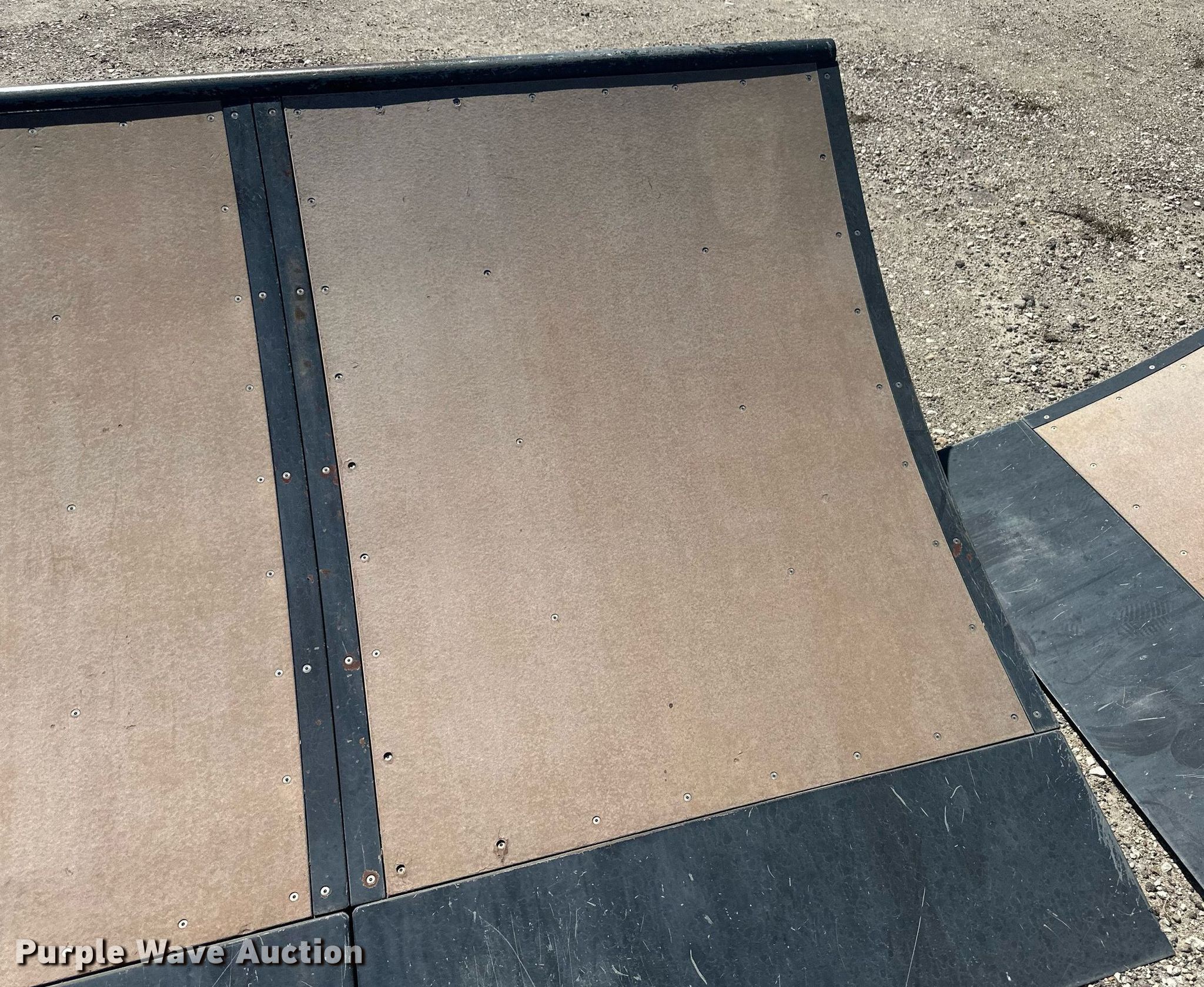 Woodward skate park equipment. 22' W x 4' H half pipe, (2) 3' quarter pipes, 4' straight ramp with quarter pipe, 3' straight ramp, 2' to 3' step up ramp with quarter pipe, 3' curved ramp, 8' L x 15" H grinding rail, 16' L grinding rail 12" to 24" H, 17.5' L round tube grinding rail 12" to 24" H, 8' L x 12" H grinding box, Skateboard rack Board capacity: 10, Disassembled. Ulysses, KS 67880