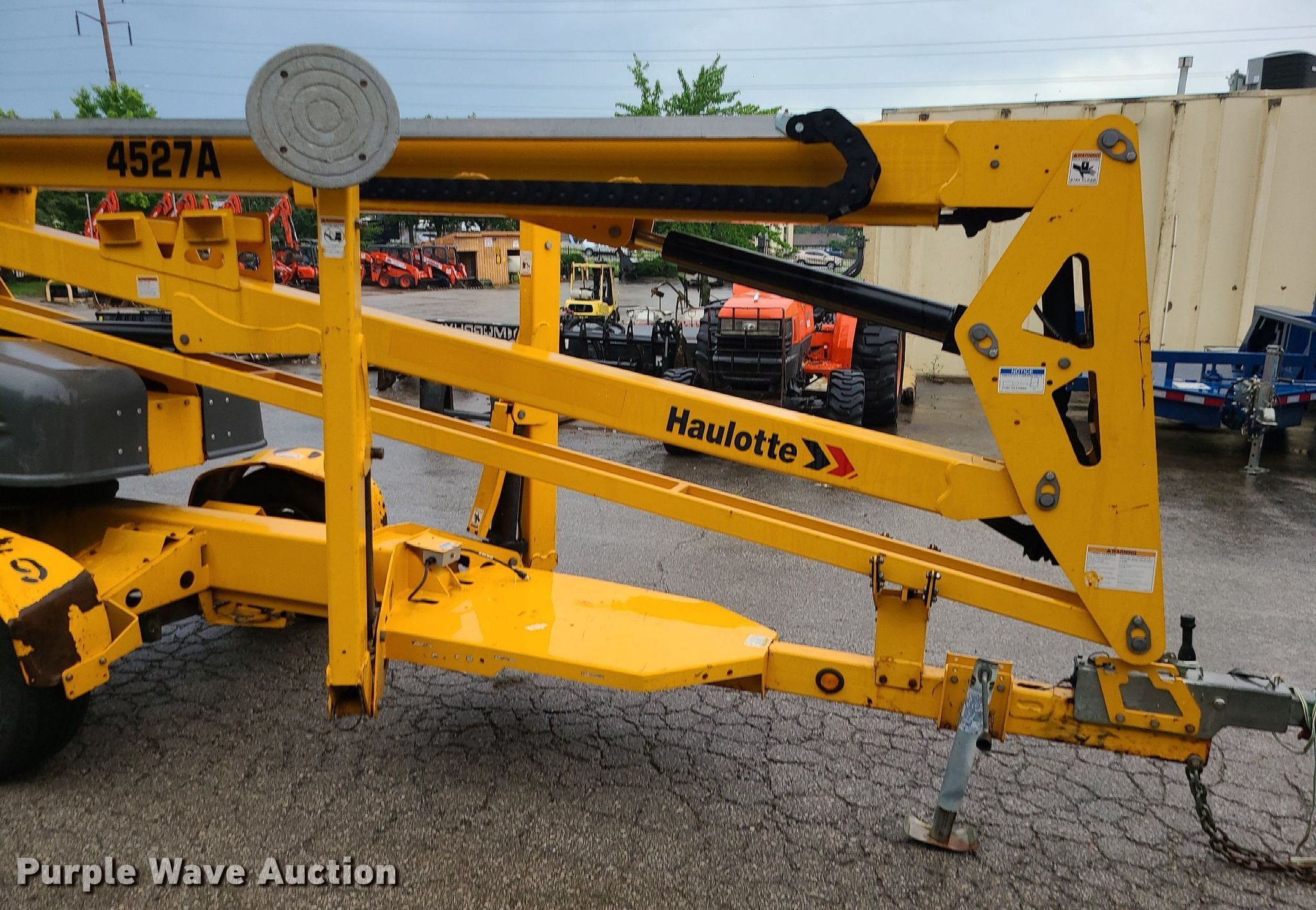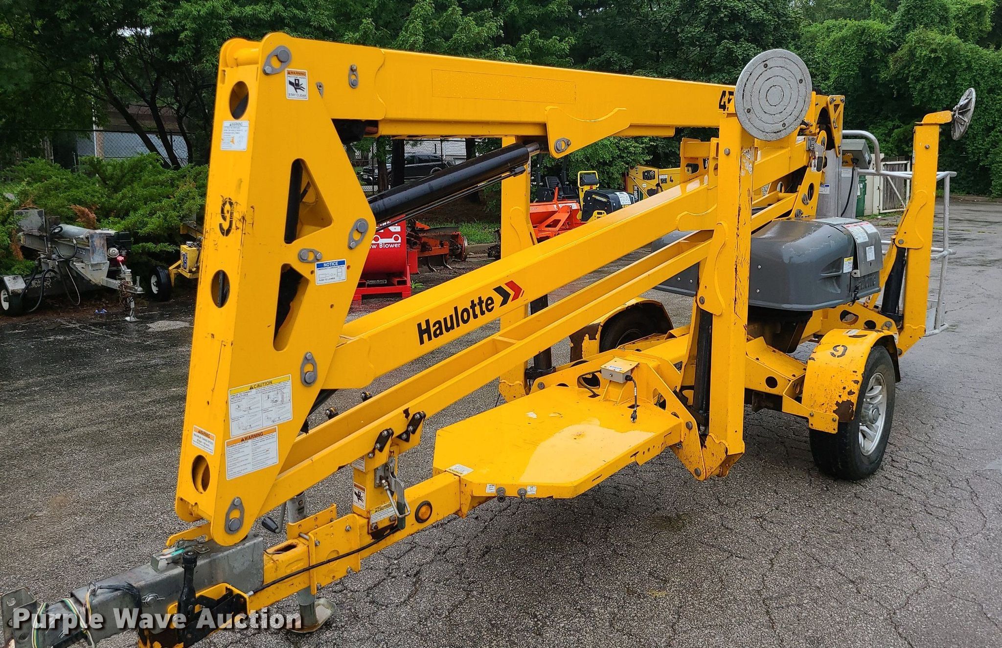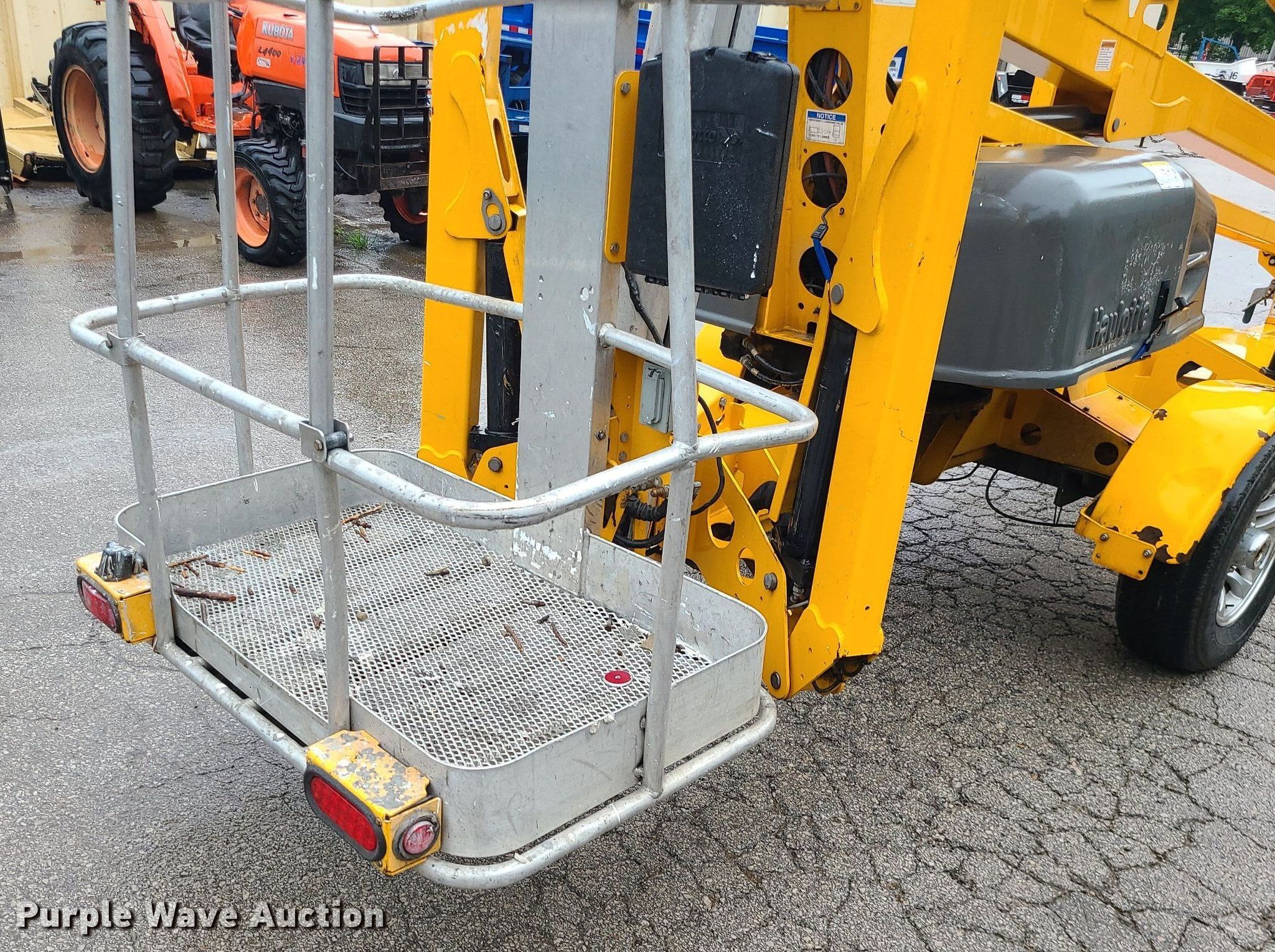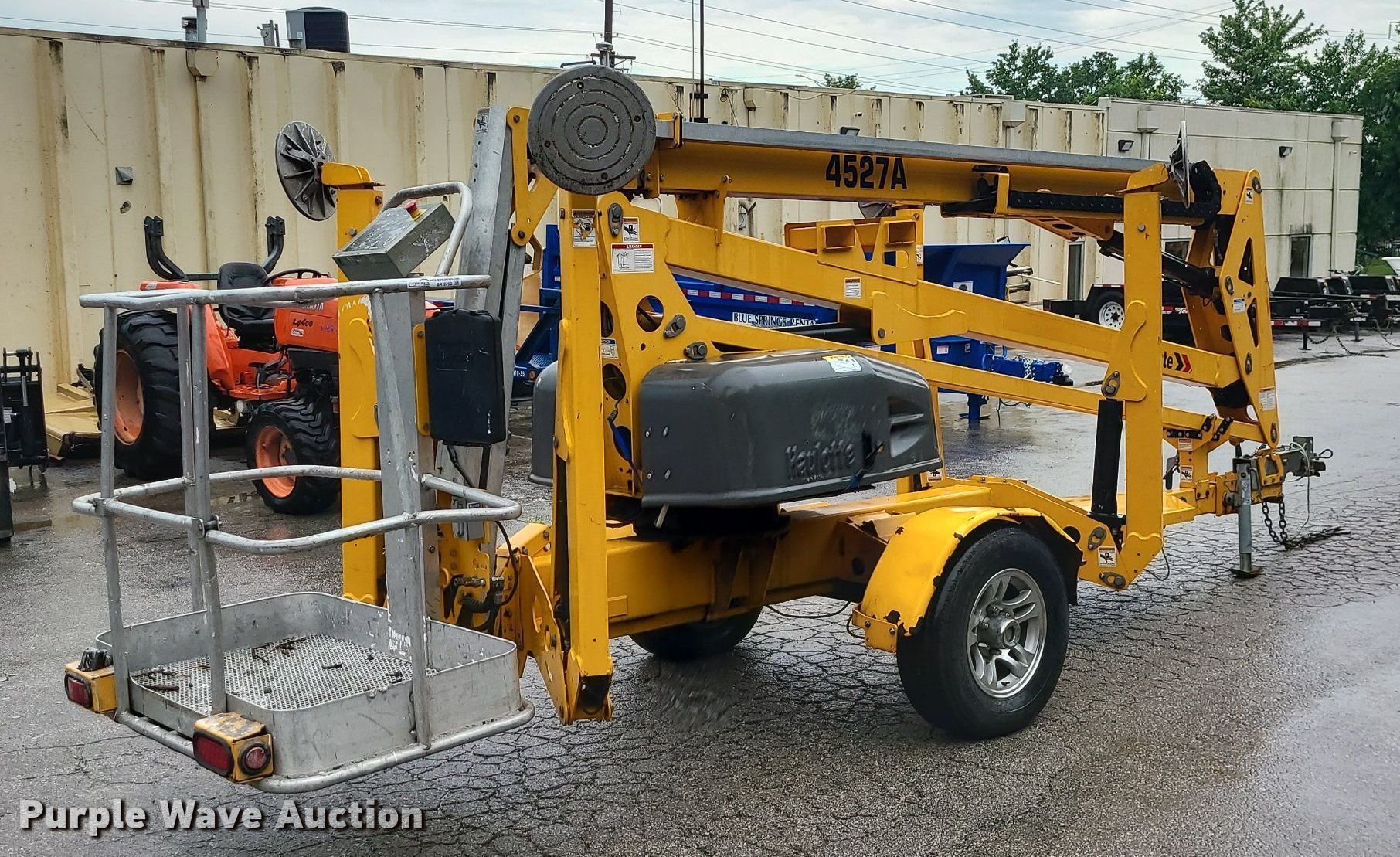 2017 Haulotte 4527A boom lift. VIN: 5CUAJ2015HA000080. Electric Motor Volts: 24. Features Articulating boom, Tow behind, Maximum lift capacity: 500 lbs, Maximum reach length: 27', Maximum lift height: 45', Platform: 28" L x 48" W, Controls: Platform, Ground. Tires Tire size: 225/75R15. This is worksite support equipment and will not come with a title. Transfer of ownership documentation will be a bill of sale. Blue Springs Rental. 1615 SW US 40 Hwy. Blue Springs, MO 64015