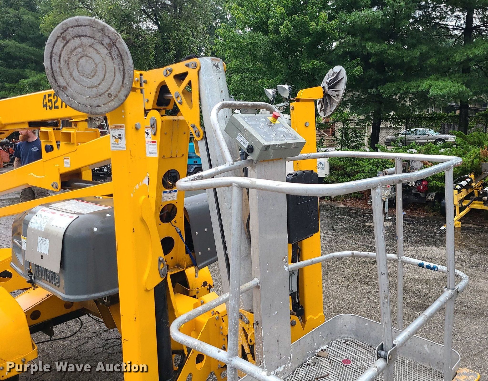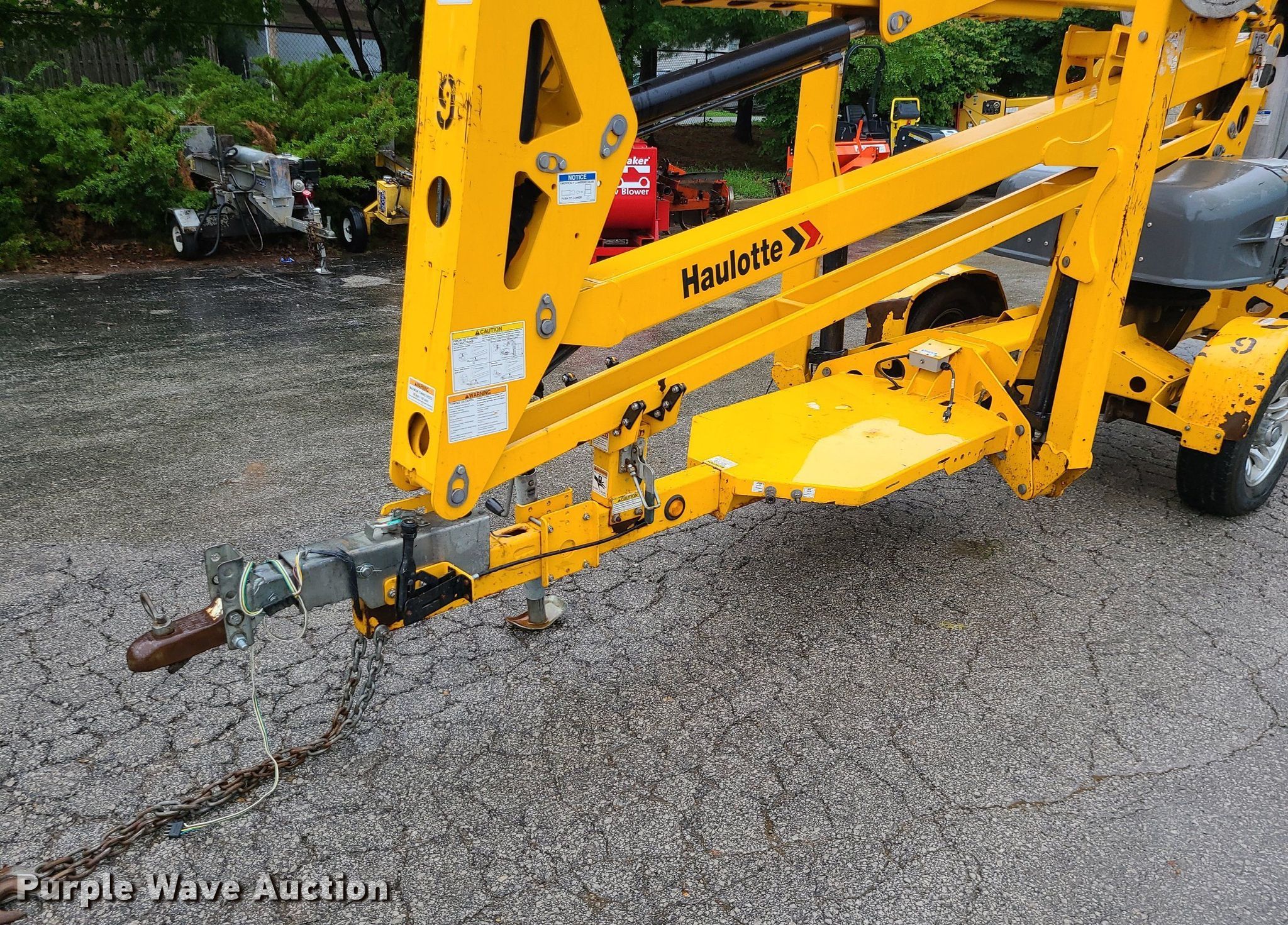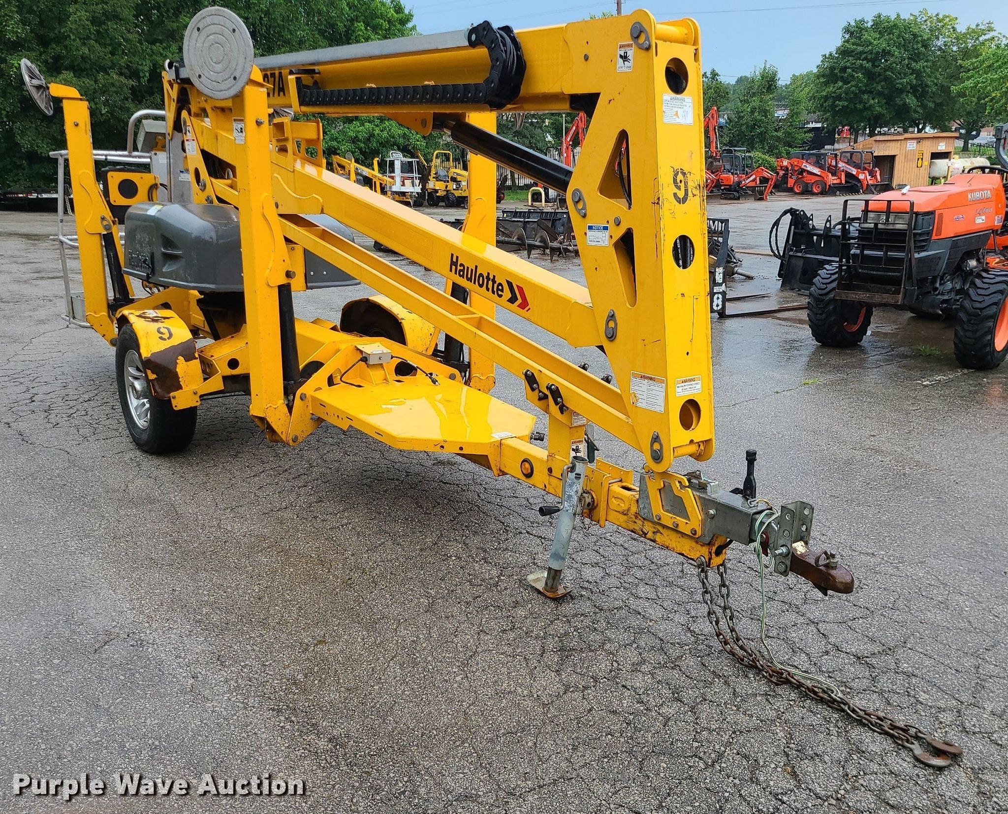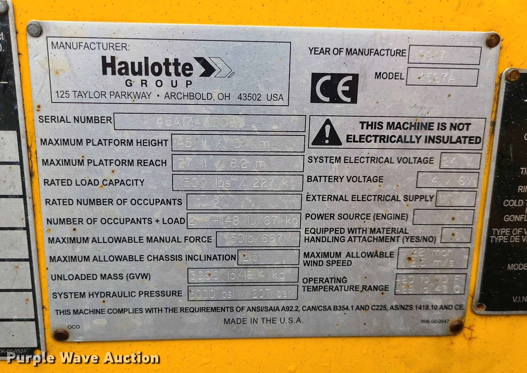2017 Haulotte 4527A boom lift. VIN: 5CUAJ2015HA000080. Electric Motor Volts: 24. Features Articulating boom, Tow behind, Maximum lift capacity: 500 lbs, Maximum reach length: 27', Maximum lift height: 45', Platform: 28" L x 48" W, Controls: Platform, Ground. Tires Tire size: 225/75R15. This is worksite support equipment and will not come with a title. Transfer of ownership documentation will be a bill of sale. Blue Springs Rental. 1615 SW US 40 Hwy. Blue Springs, MO 64015