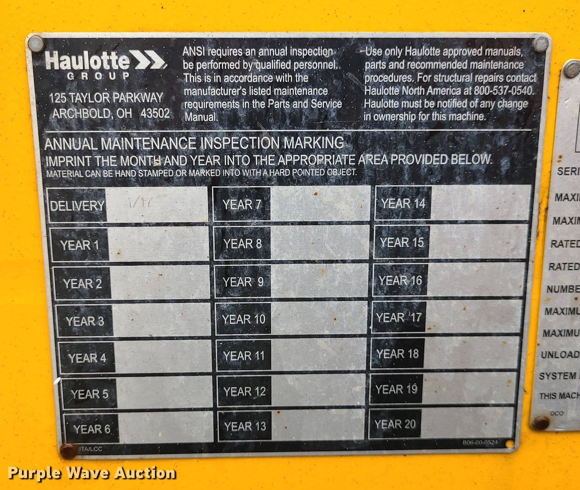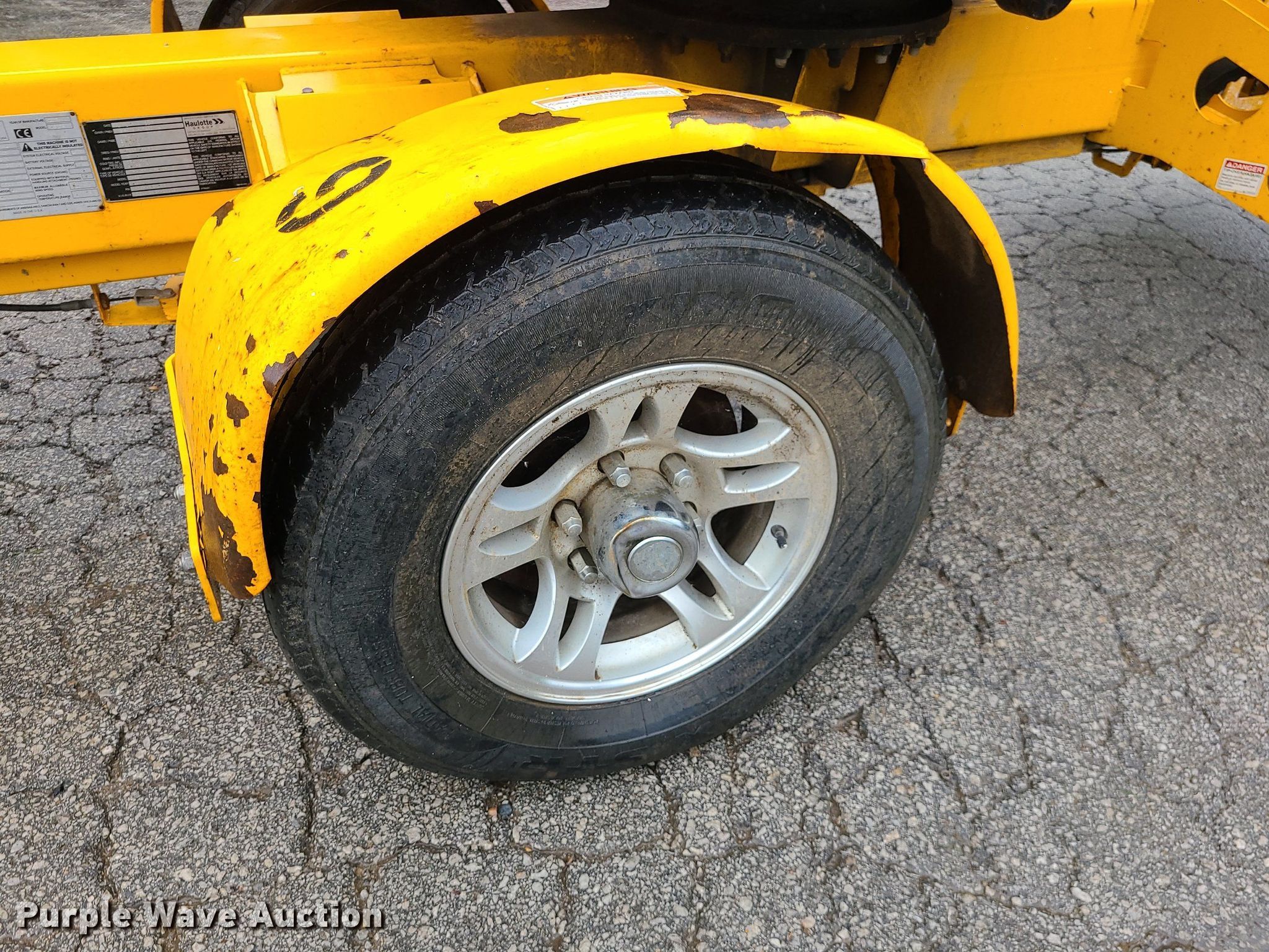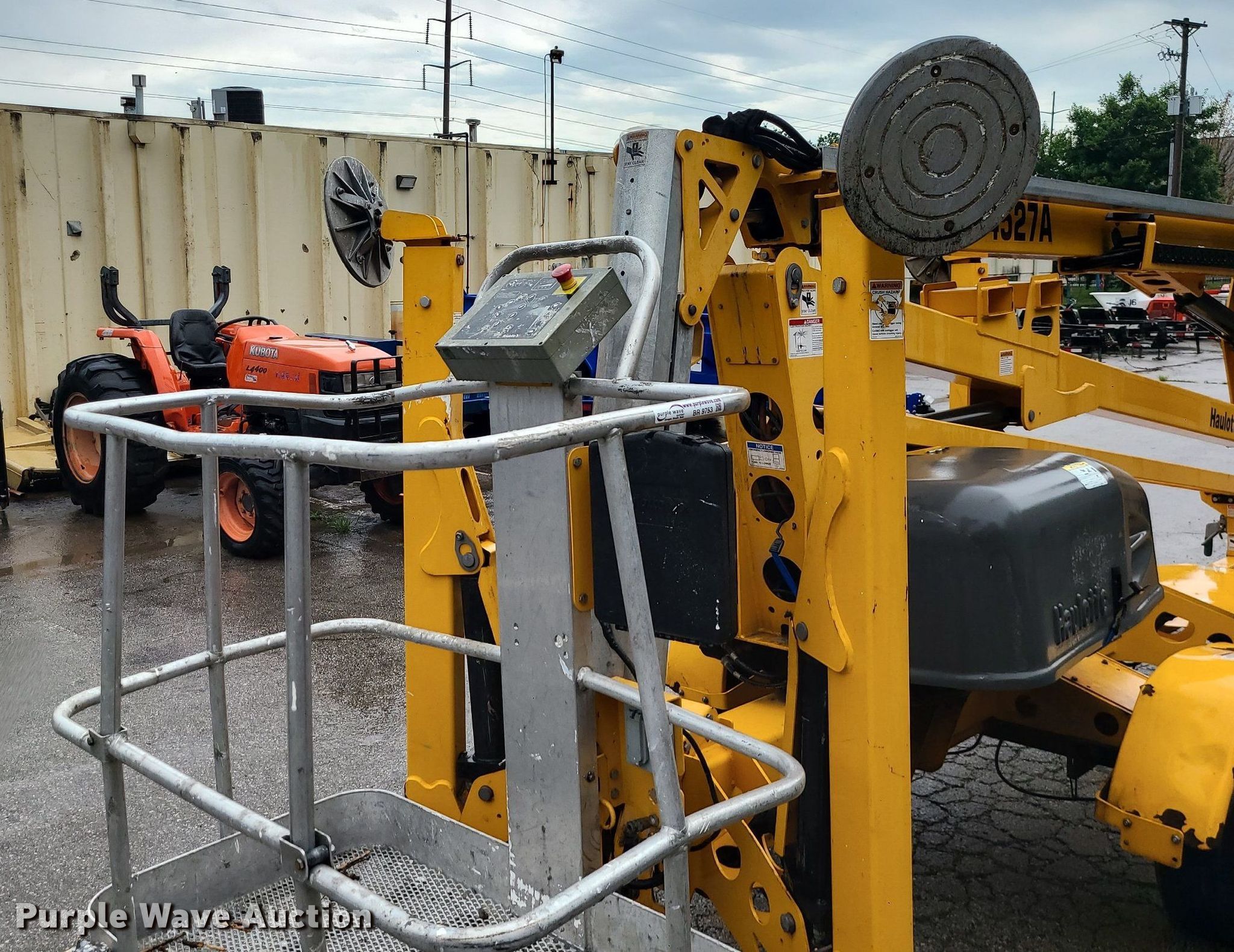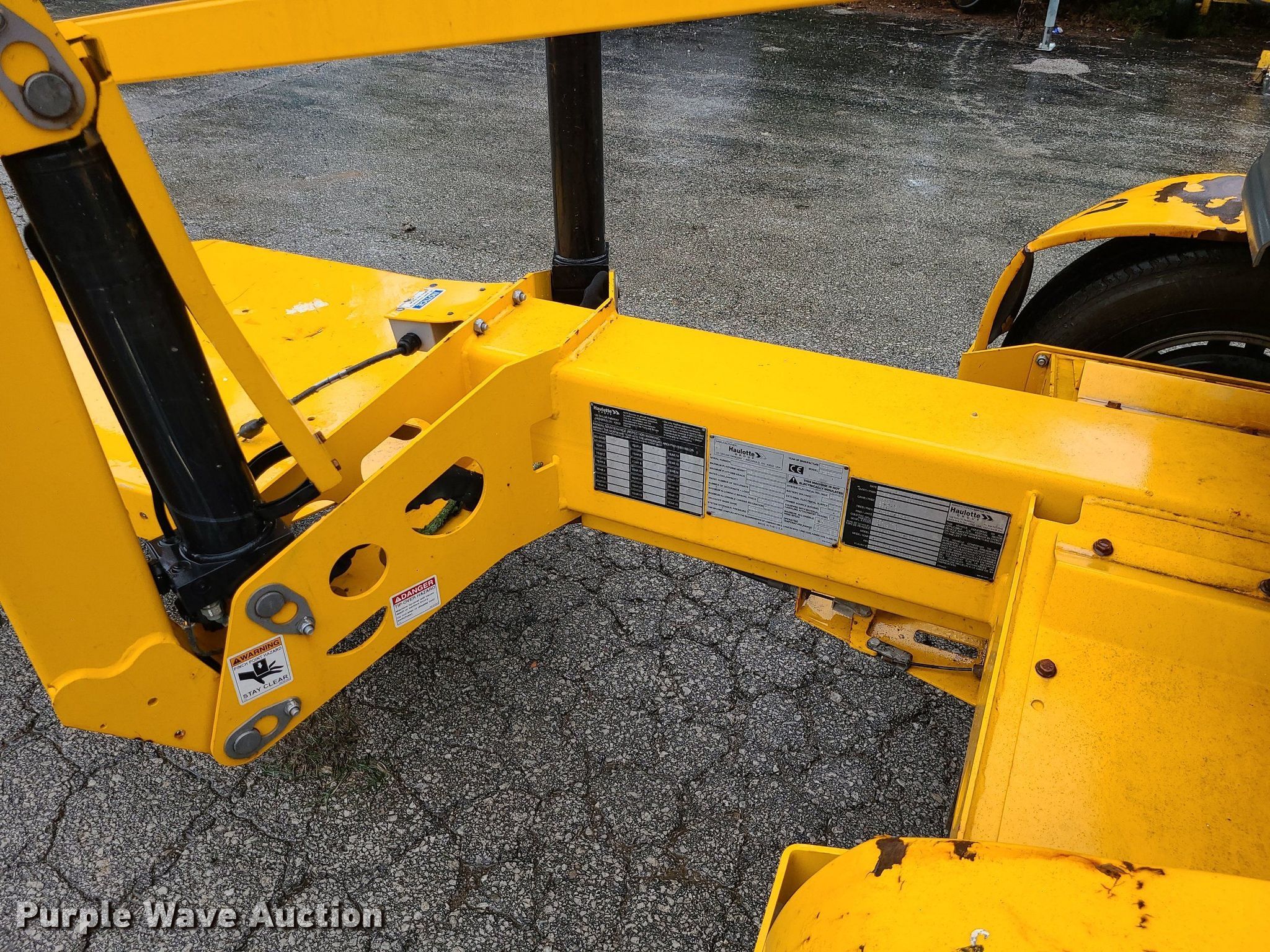 2017 Haulotte 4527A boom lift. VIN: 5CUAJ2015HA000080. Electric Motor Volts: 24. Features Articulating boom, Tow behind, Maximum lift capacity: 500 lbs, Maximum reach length: 27', Maximum lift height: 45', Platform: 28" L x 48" W, Controls: Platform, Ground. Tires Tire size: 225/75R15. This is worksite support equipment and will not come with a title. Transfer of ownership documentation will be a bill of sale. Blue Springs Rental. 1615 SW US 40 Hwy. Blue Springs, MO 64015