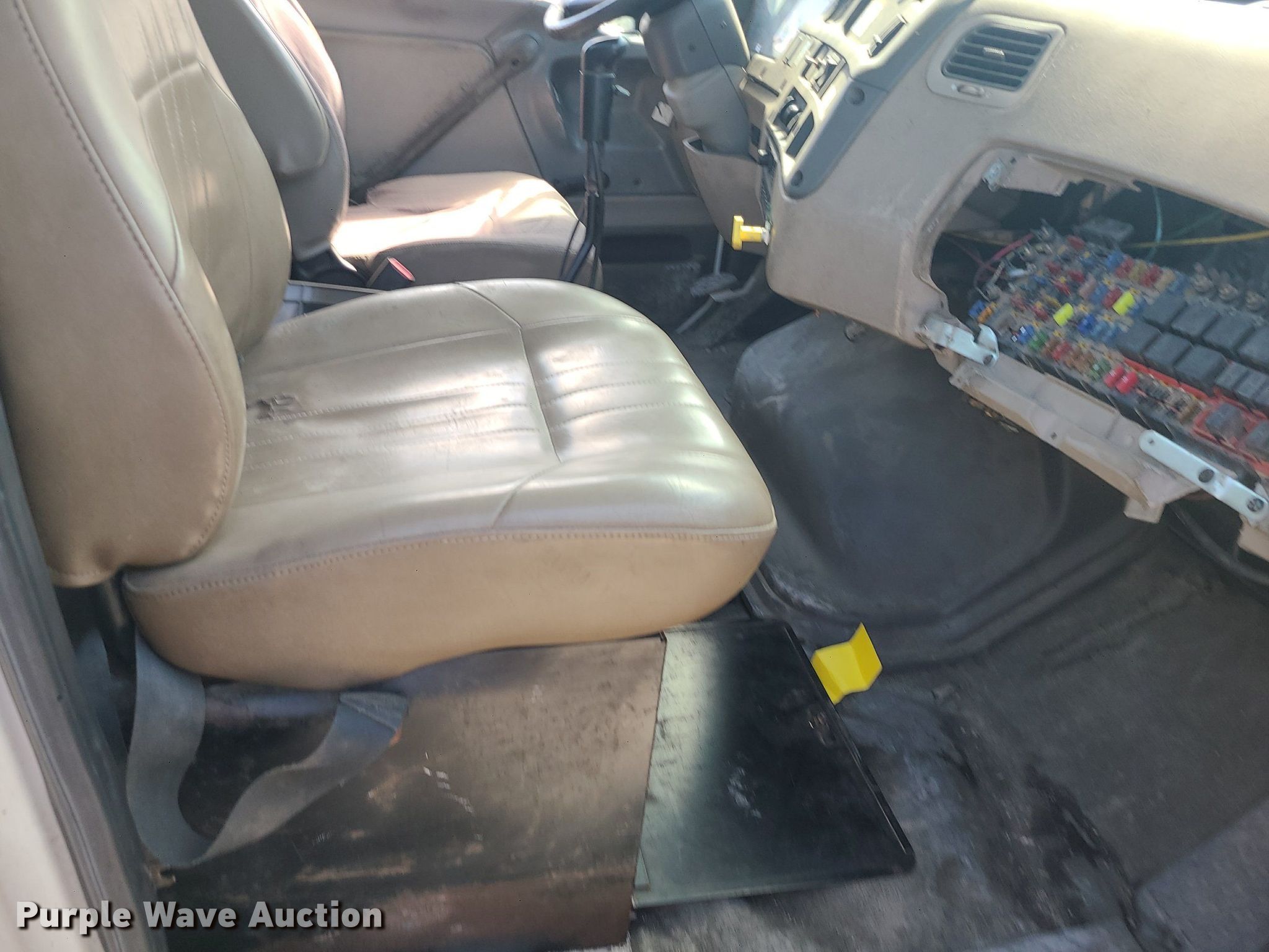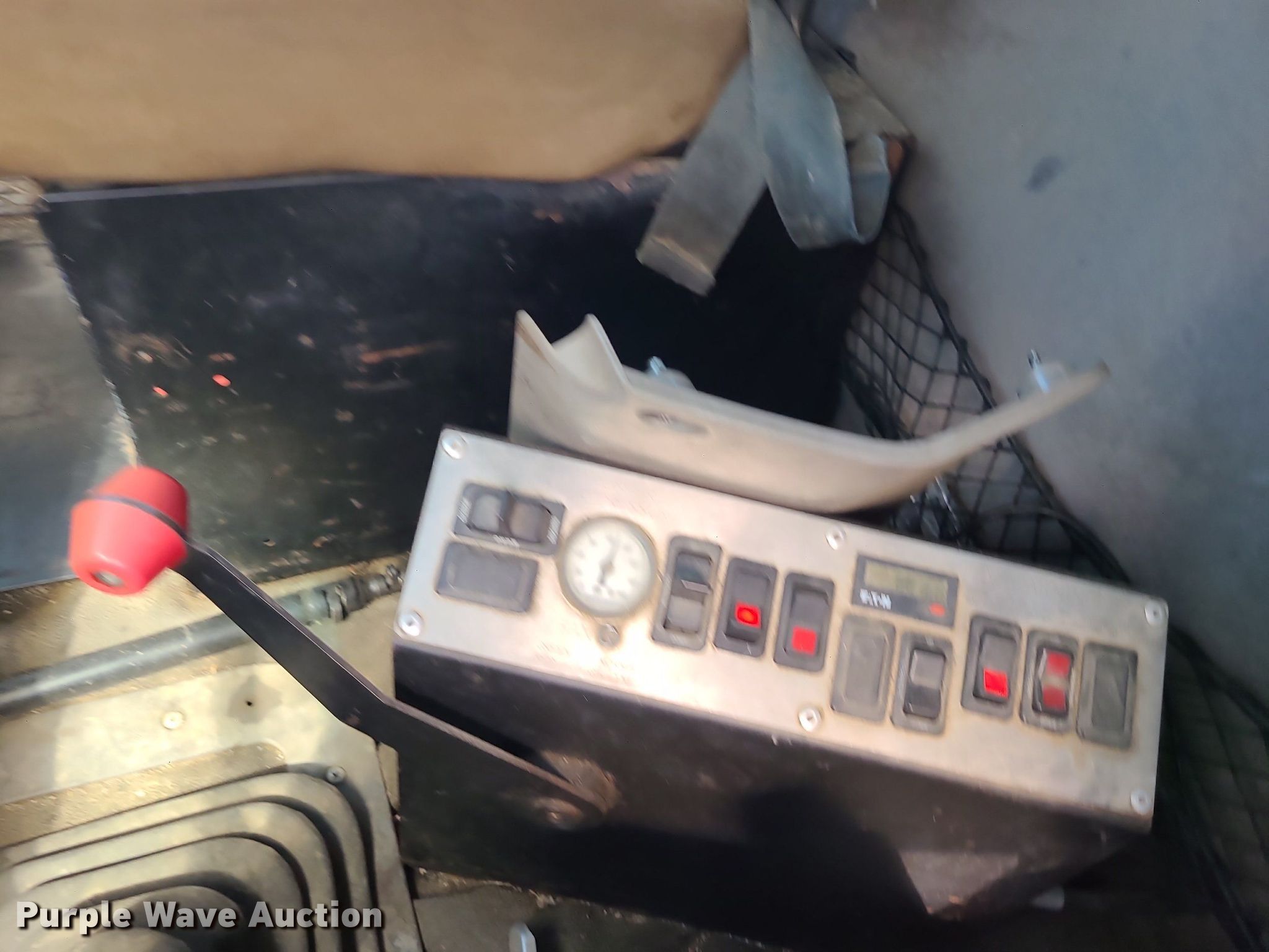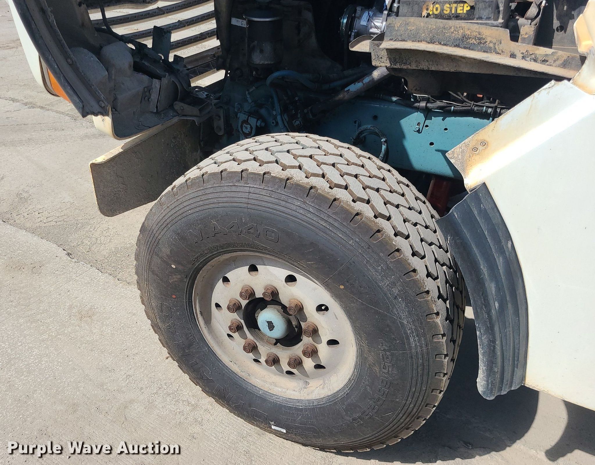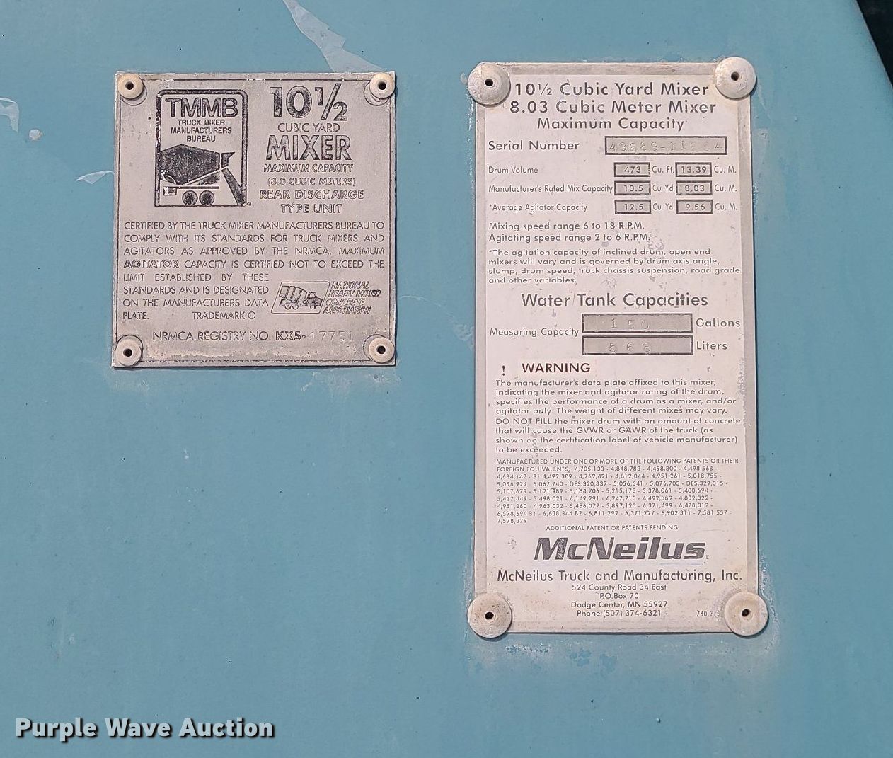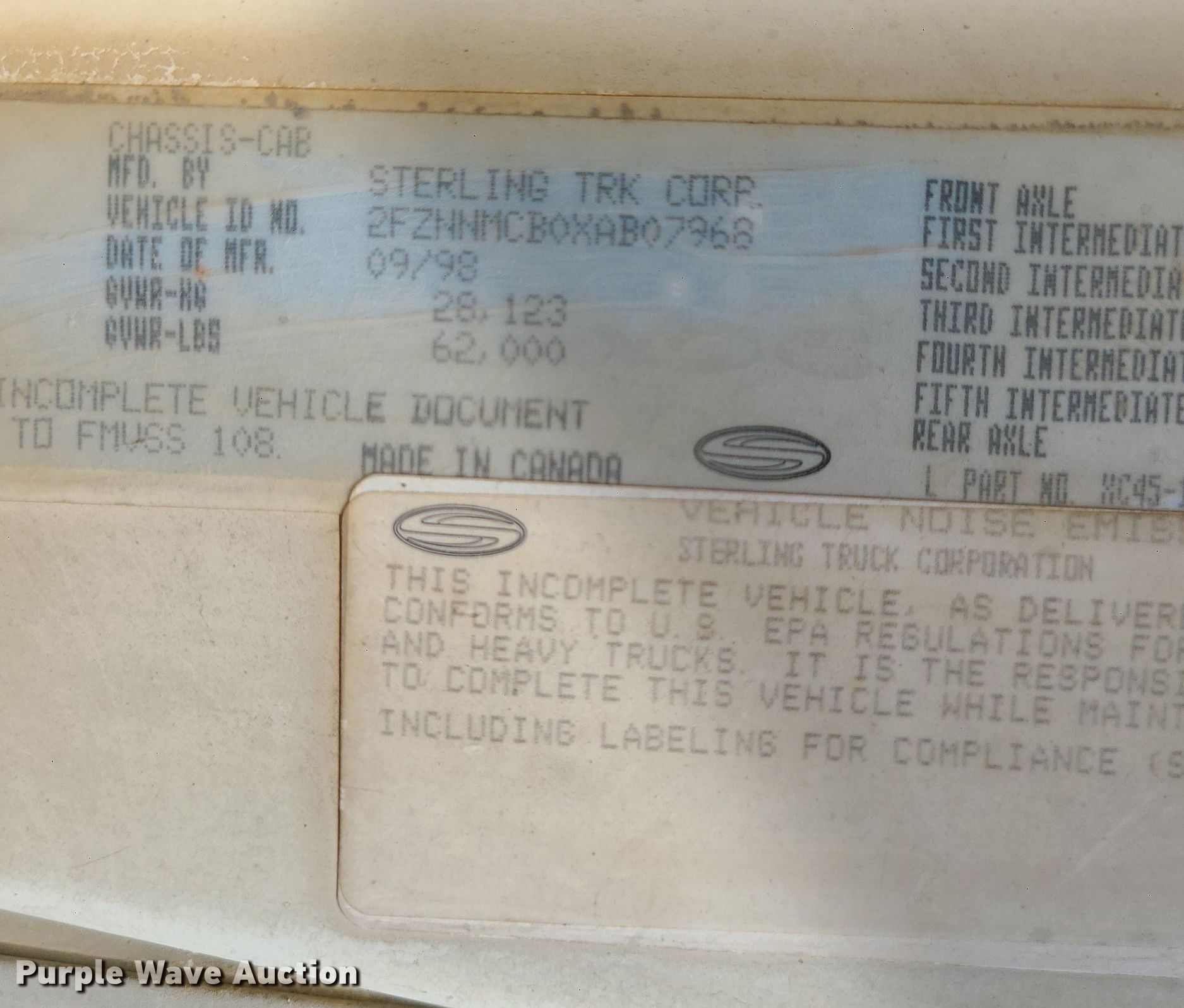 1999 Sterling L-Line ready mix truck. Miles: 116,091 on odometer, VIN: 2FZNNMCB0XAB07968. Engine Cummins ISM, Displacement: 10.8L, Cylinders: 6, Fuel type: Diesel. Transmission Eaton Fuller, Manual. Chassis Axles: Quad, Pusher axle, Tag axle, Differential lock: Full, Suspension: Spring over walking beam, Brakes: Air, PTO, GVWR: 62,000 lbs. Interior Heat. Features Mixer McNeilus, Capacity: 10.5 cu.yd., Discharge: Rear, In-cab controls, Rear drum controls, Chute Extensions: 3, Chute type: Steel.. Tires Front: 425/65R22.5, Rear: 11R22.5 , Lift axle: 255/70R22.5. Notes Non-operational power steering. Missouri title. Title distribution may be delayed up to 14 days from verification of funds. Martinez Company LLC. 2001 Blue Ridge Boulevard. Independence, MO 64052