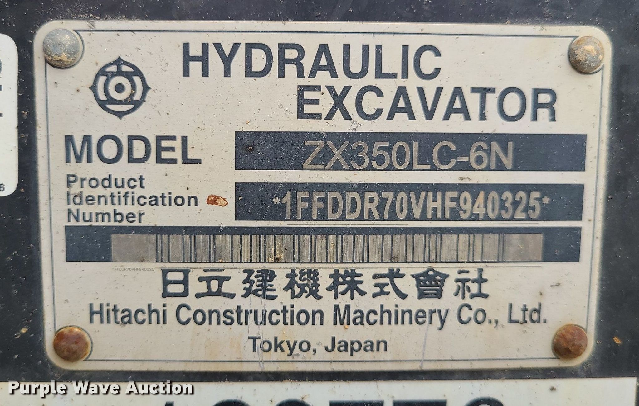 Purple Wave is selling a used Hydraulic Excavator in Missouri. This item is a 2018 Hitachi ZX350LC-6N excavator with the following: Hours: 1,761 on meter, Serial: 1FFDDR70VHF940325