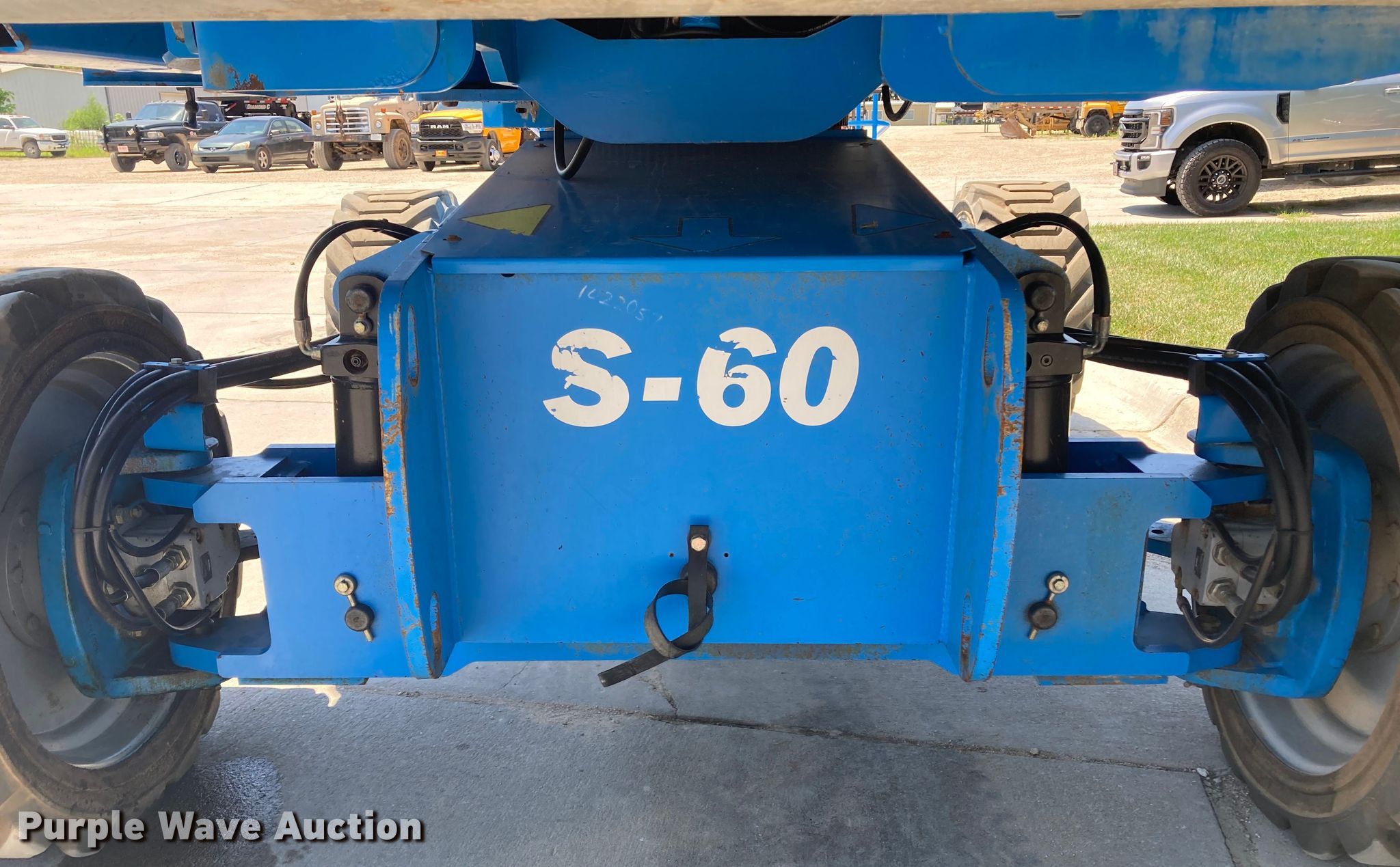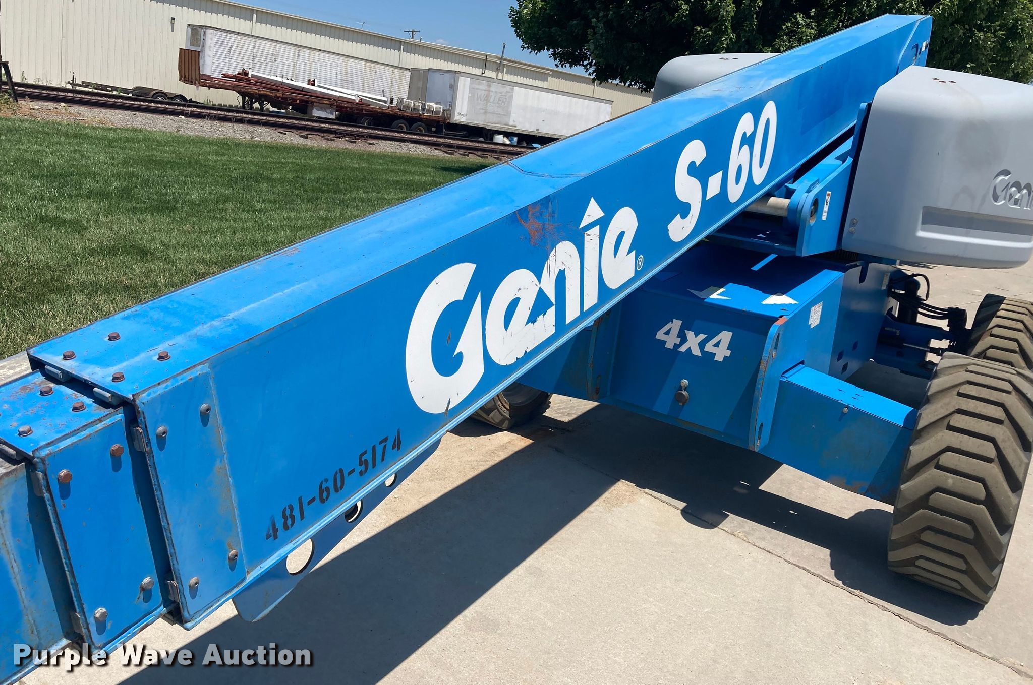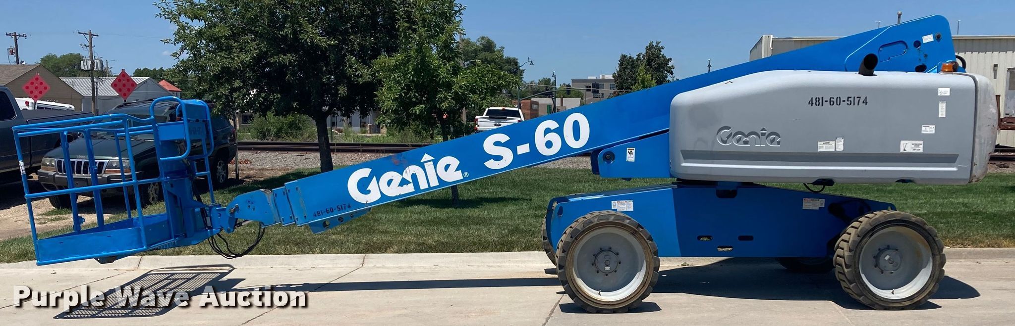 2005 Genie S-60 boom lift. Hours: 3,352 on meter, Serial: S6005-11441. Engine Deutz F3L-2011, Displacement: 2.332L, Cylinders: 3, Fuel type: Diesel, HP: 48, kW: 35.8. Features Rough terrain, Maximum lift capacity: 500 lbs, Maximum reach length: 50', Maximum lift height: 60', Platform: 94" L x 33" W, Controls: Platform, Ground, Platform rotation: Hydraulic. Tires Tire size: 355/55D625NHS. Midwest Concrete Materials. Manhattan, KS 66502