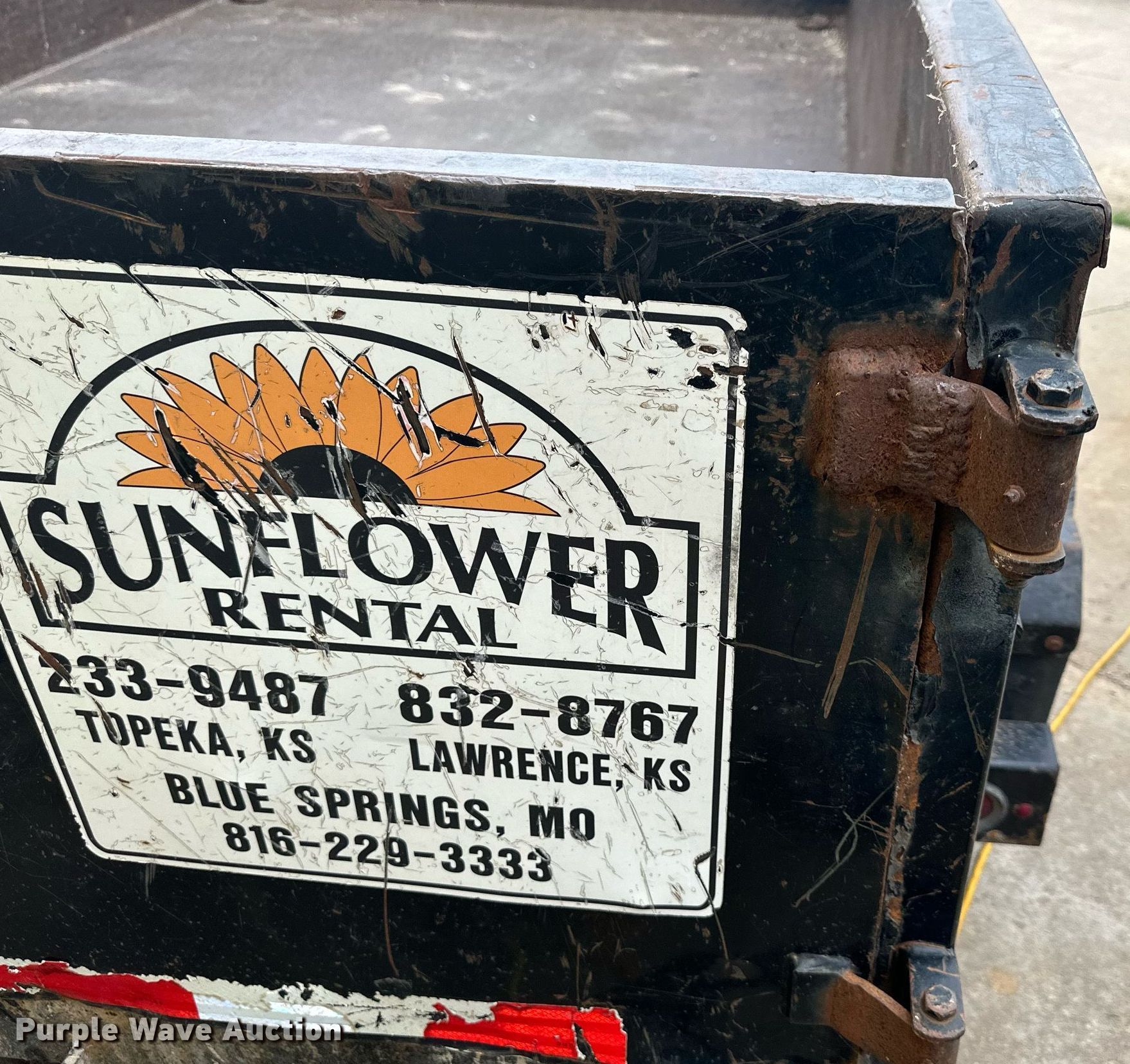 2015 Towmaster T-12HD dump trailer. VIN: 4KNUT1227FL162316. Dimensions Overall: 18' L x 102" W, Body: 12' L x 80" W, Side height: 24". Features Body type: Steel, End gate: Manual. Chassis Ball hitch: 2 5/16", Landing gear: Single, Suspension: Spring, Brakes: Electric, Axles: Tandem, GAWR: 7,000 lbs. Tires Steel wheels, Size: 235/85R16. Kansas title. Title distribution may be delayed up to 14 days from verification of funds. Sunflower Rental. 2010 SW Topeka Blvd. Topeka, KS 66612