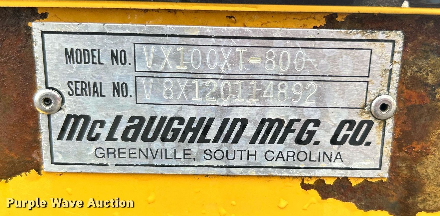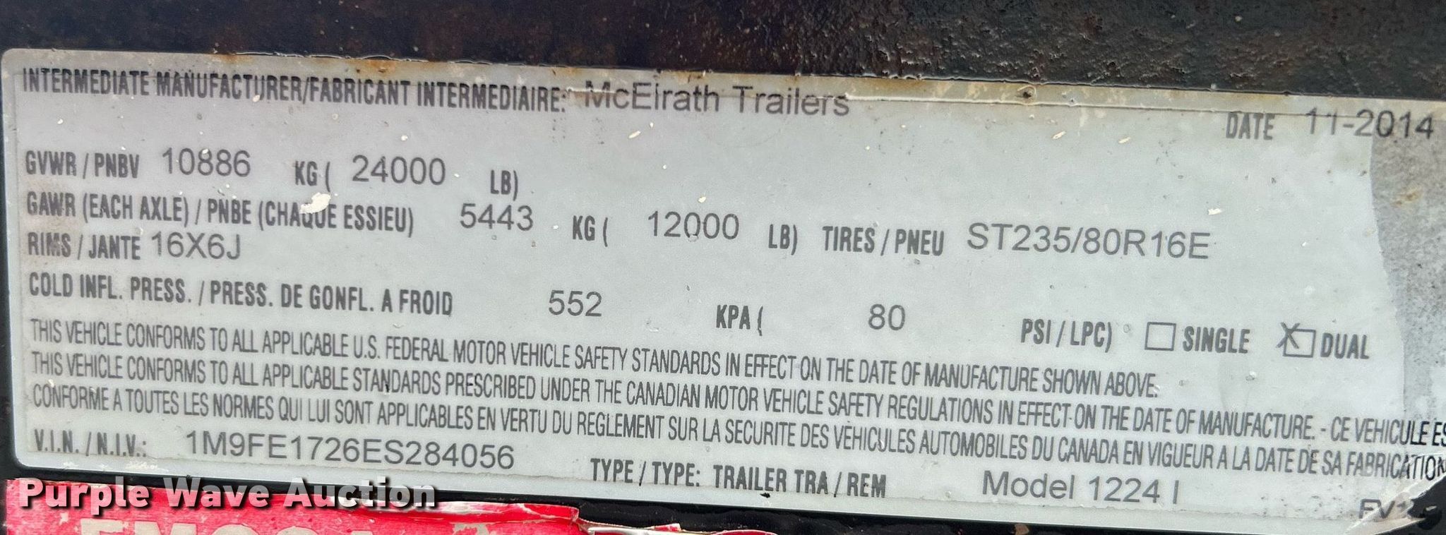 2014 Vermeer VX100XT-800AIR vacuum excavator. Hours: 1,436 on meter, VIN: 1M9FE1726ES284056, Serial: V8X120114892. Engine Kubota, Cylinders: 4, Fuel type: Diesel. Features Spoils tank Capacity: 500 gallons, Water tank Capacity: Approximately 200 gallons, Water pump, Vacuum pump Inlet valve size: 7", Outlet valve size: 7", CFM: 1,200, Suction hose Diameter: 6". Trailer 2014 McElrath 1224 I, 21' L x 102" W, Suspension: Spring, Brakes: Electric, Axles: Tandem, Tire size: 245/75R16, GVWR: 24,000 lbs, GAWR: 12,000 lbs. Notes Non-operational unit. Oklahoma title. Title distribution may be delayed up to 14 days from verification of funds. 15107 North 137th East Avenue. Collinsville, OK 74021