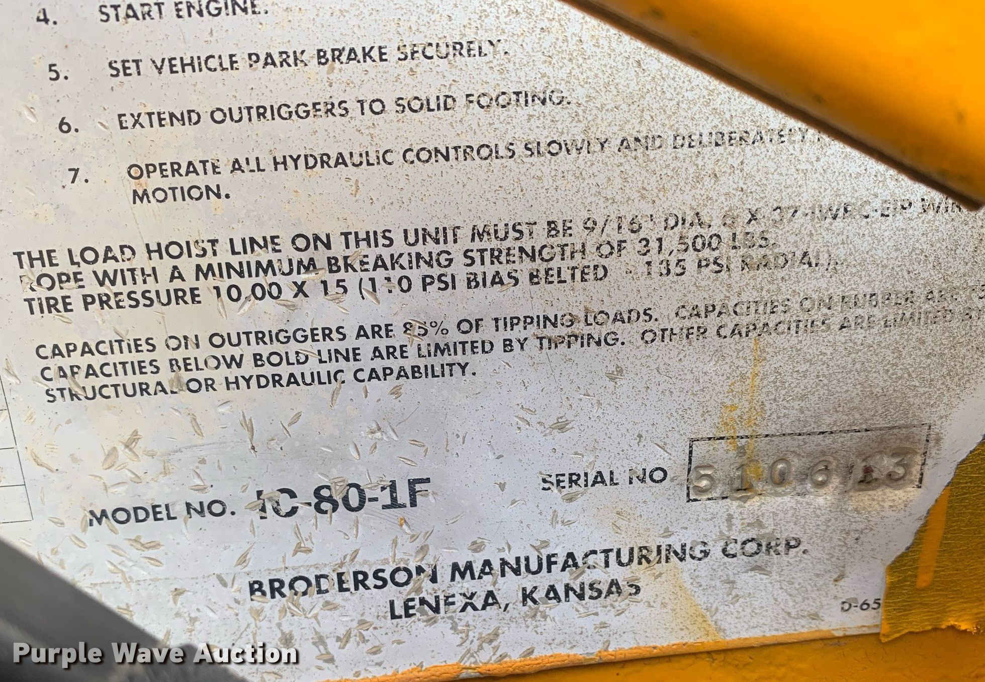 Purple Wave is selling a used Carry Deck Crane in Texas. This item is a 2002 Broderson IC-80-1F crane with the following: Hours: 2,642 on meter, Serial: 510613