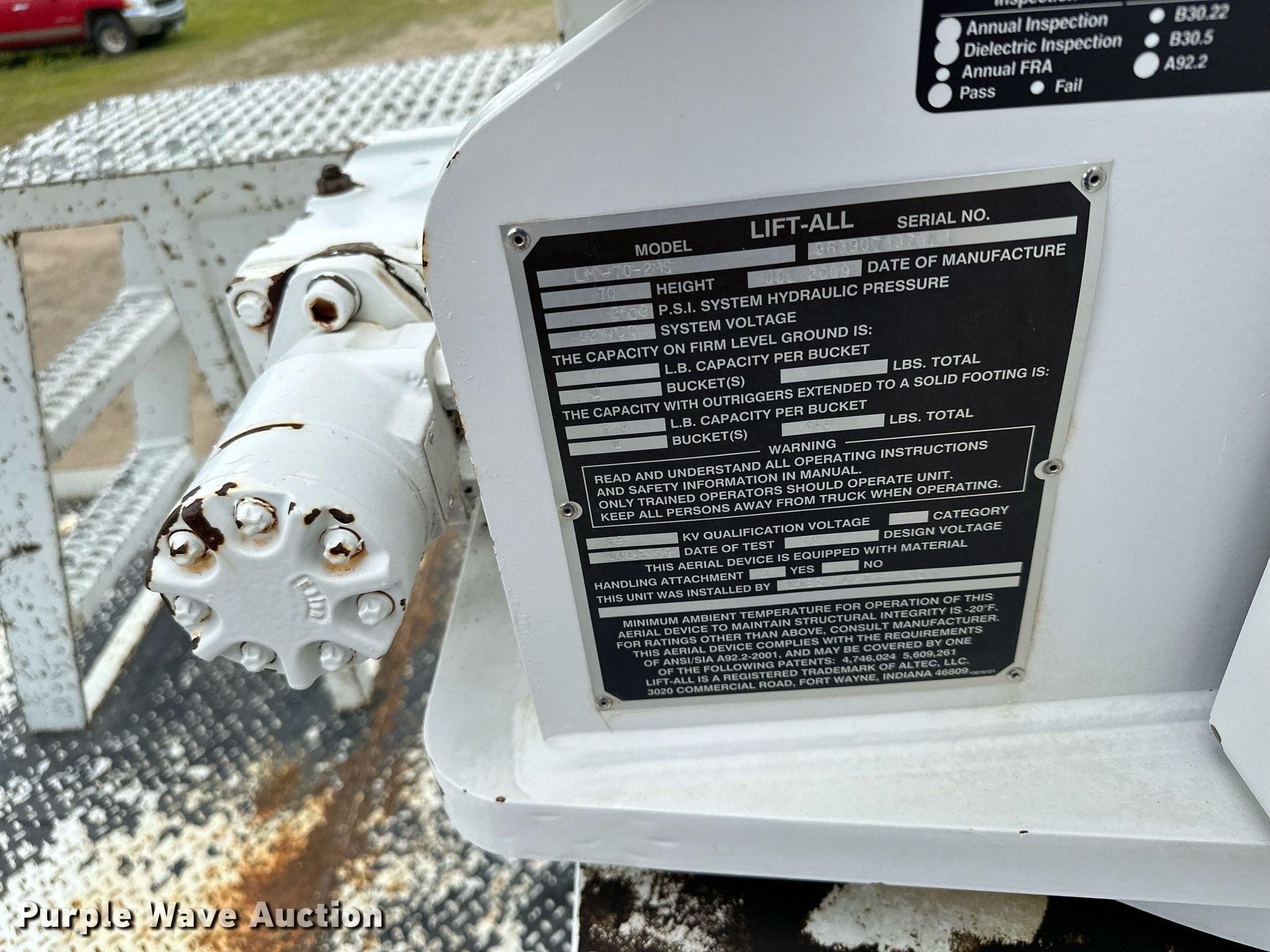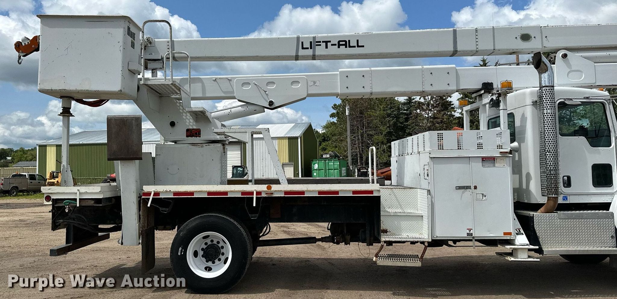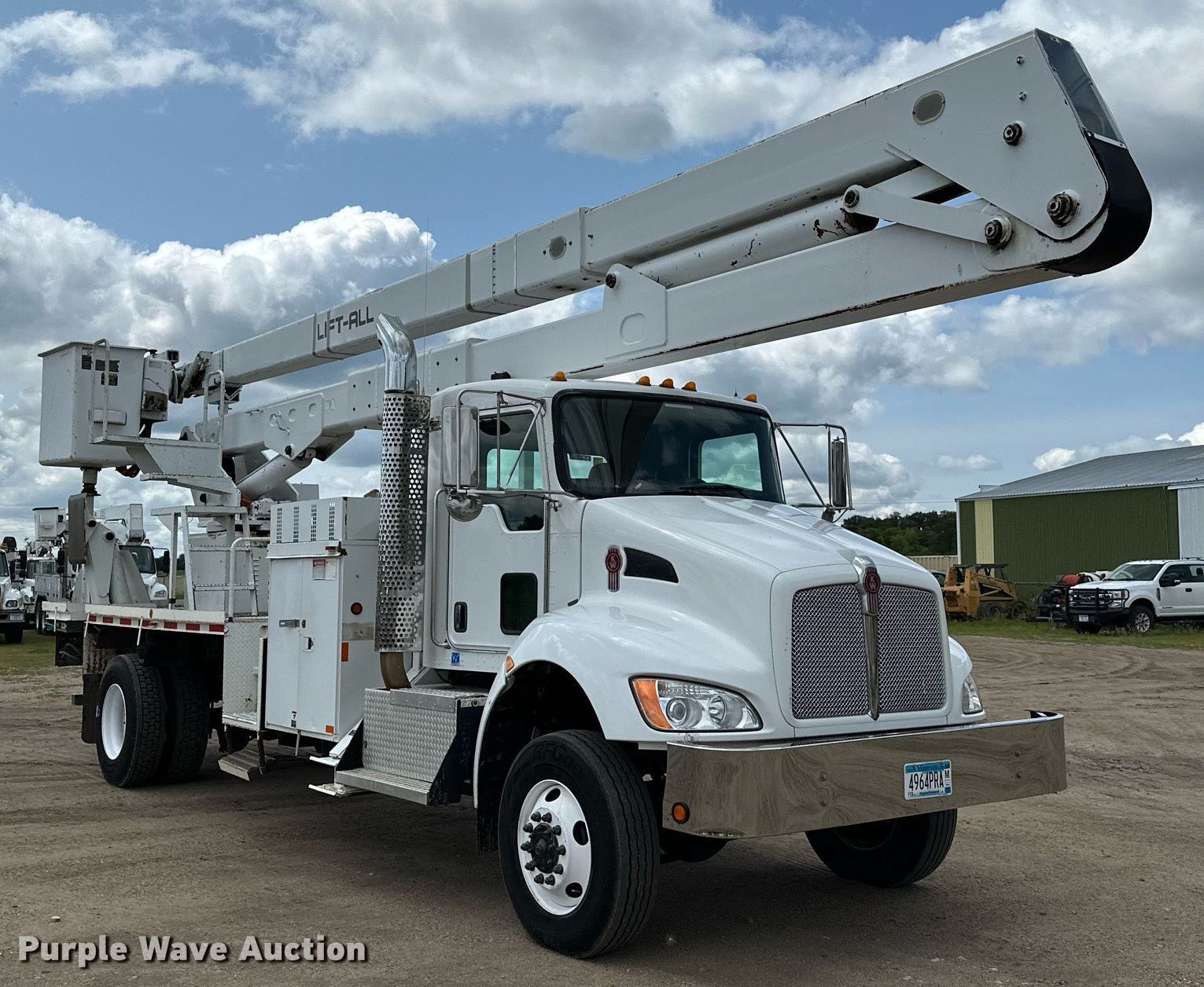 2010 Kenworth T370 bucket truck. Miles: 46,500 on odometer, Hours: 7,312 on meter, VIN: 2NKHHM7X4AM265657. Engine Paccar PX-6 260, Displacement: 6.7L, Cylinders: 6, Fuel type: Diesel, HP: 260. Transmission Allison 3500RDS, Automatic. Chassis Four wheel drive, Axles: Single, Suspension: Spring, Brakes: Air, PTO, GVWR: 33,000 lbs. Interior AC, Heat, Heated mirrors, Power windows, Power locks, Cruise control, Auxiliary controls. Features Bed Altec, Serial: 47-15084524, 28' 6" L x 8' W, Boom 2009 Lift All LM-70-2MS, Serial: 9639070970LM, Boom length: 70', Mast height: 70', Maximum lift capacity: 600 lbs, Maximum lift height: 70', Boom type: Articulating, Man basket, Boom controls Ground, Platform/ basket, Material handler, Certification valid through: 03/22. Tires Front: 295/75R22.5, 275/80R22.5, Rear: 11R22.5. Notes Contents not included. Minnesota title. Title distribution may be delayed up to 14 days from verification of funds. Midwest Powerline Construction LLC. 1435 Sinclair Lewis Avenue. Sauk Centre, MN 56378