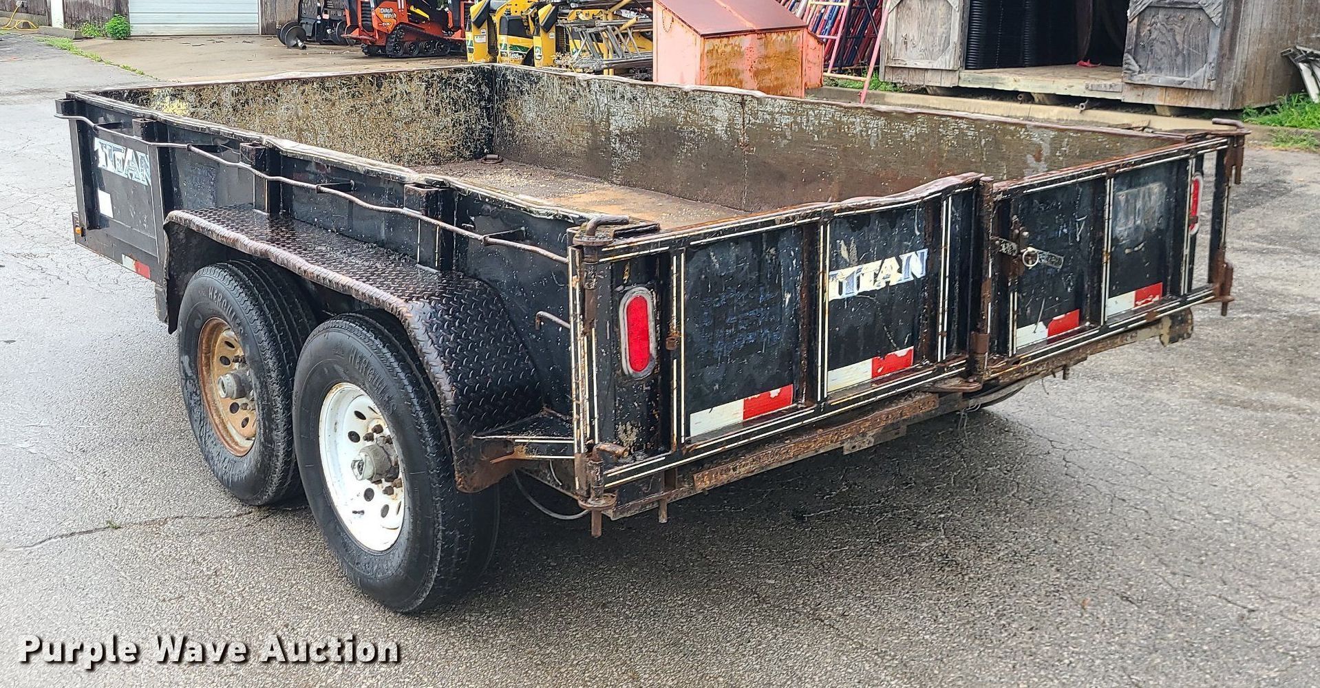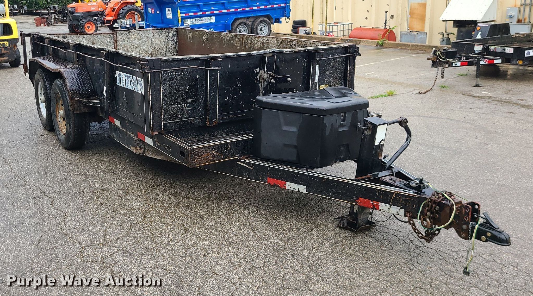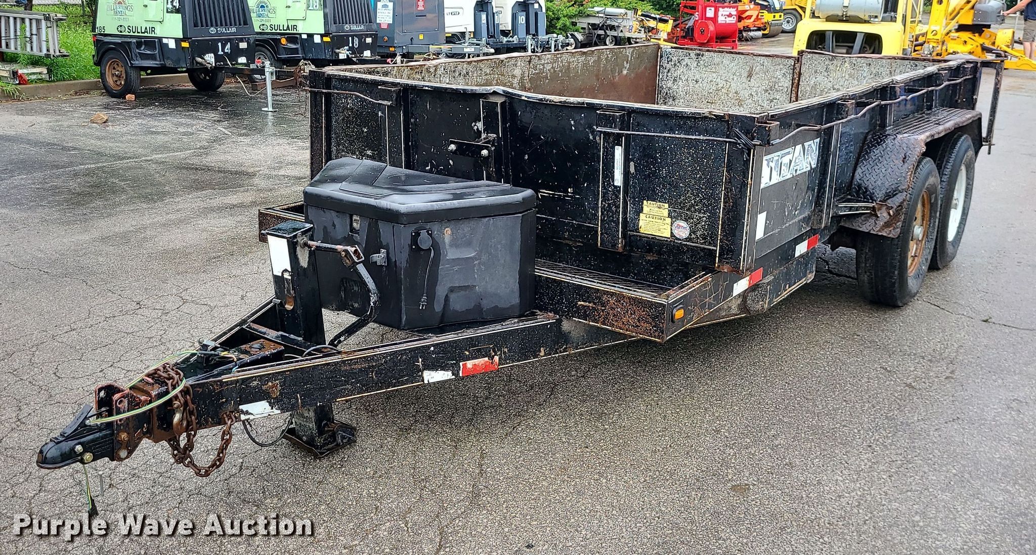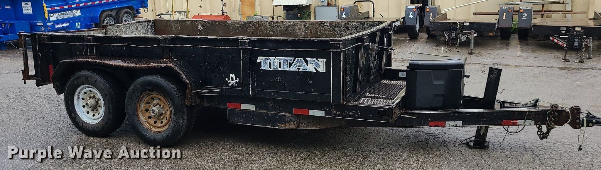 2011 Titan dump trailer. VIN: 4TGF12203B1058599. Dimensions Overall: 20' L x 102" W, Body: 12' L x 82" W, Side height: 18". Features Body type: Steel, Ram: Single, End gate: Manual. Chassis Ball hitch: 2 5/16", Landing gear: Single, Suspension: Spring, Brakes: Electric, Axles: Tandem, GVWR: 14,000 lbs. Tires Size: 235/80R16. Missouri title. Title distribution may be delayed up to 14 days from verification of funds. Blue Springs Rental. 1615 SW US 40 Hwy. Blue Springs, MO 64015