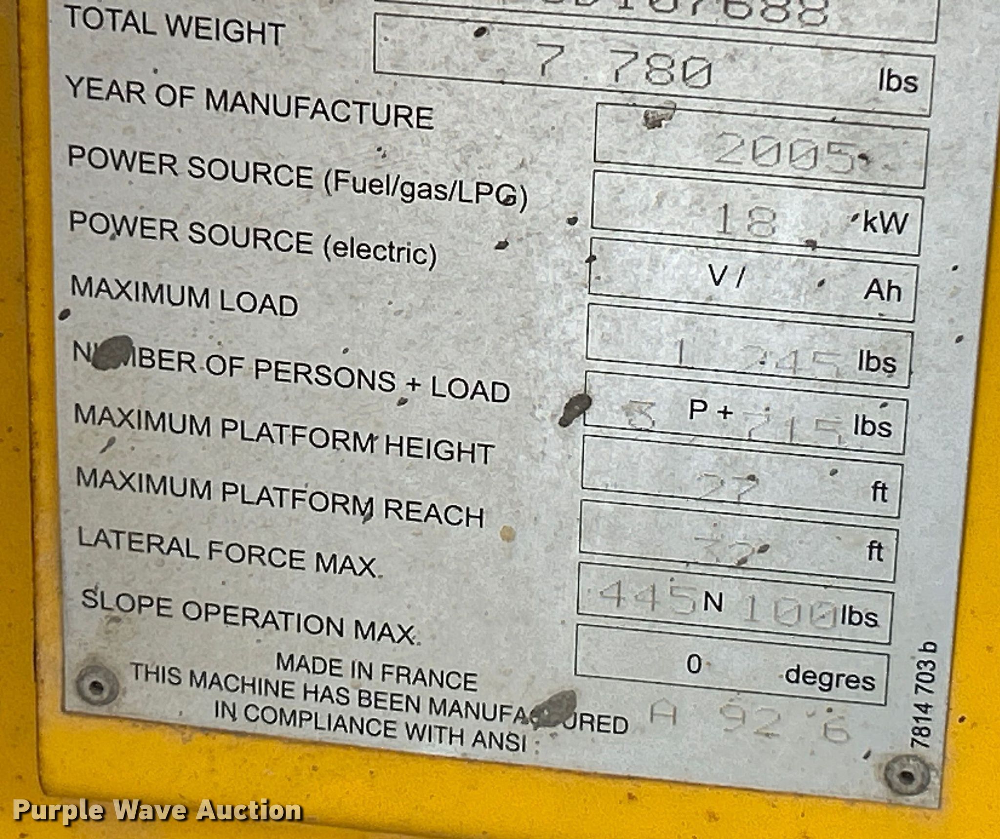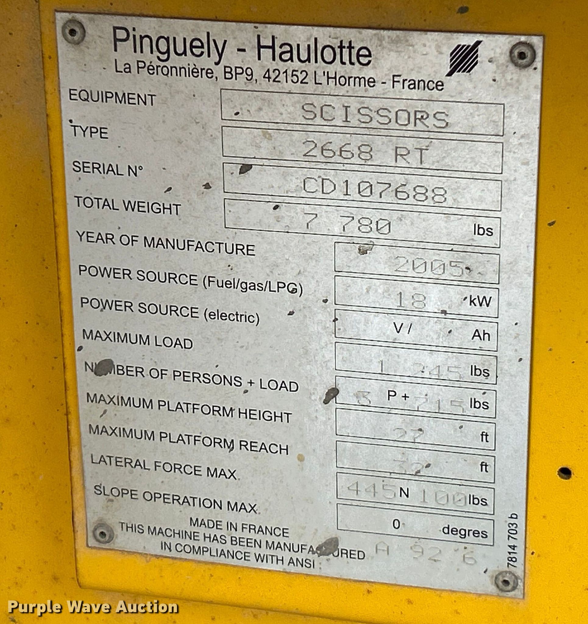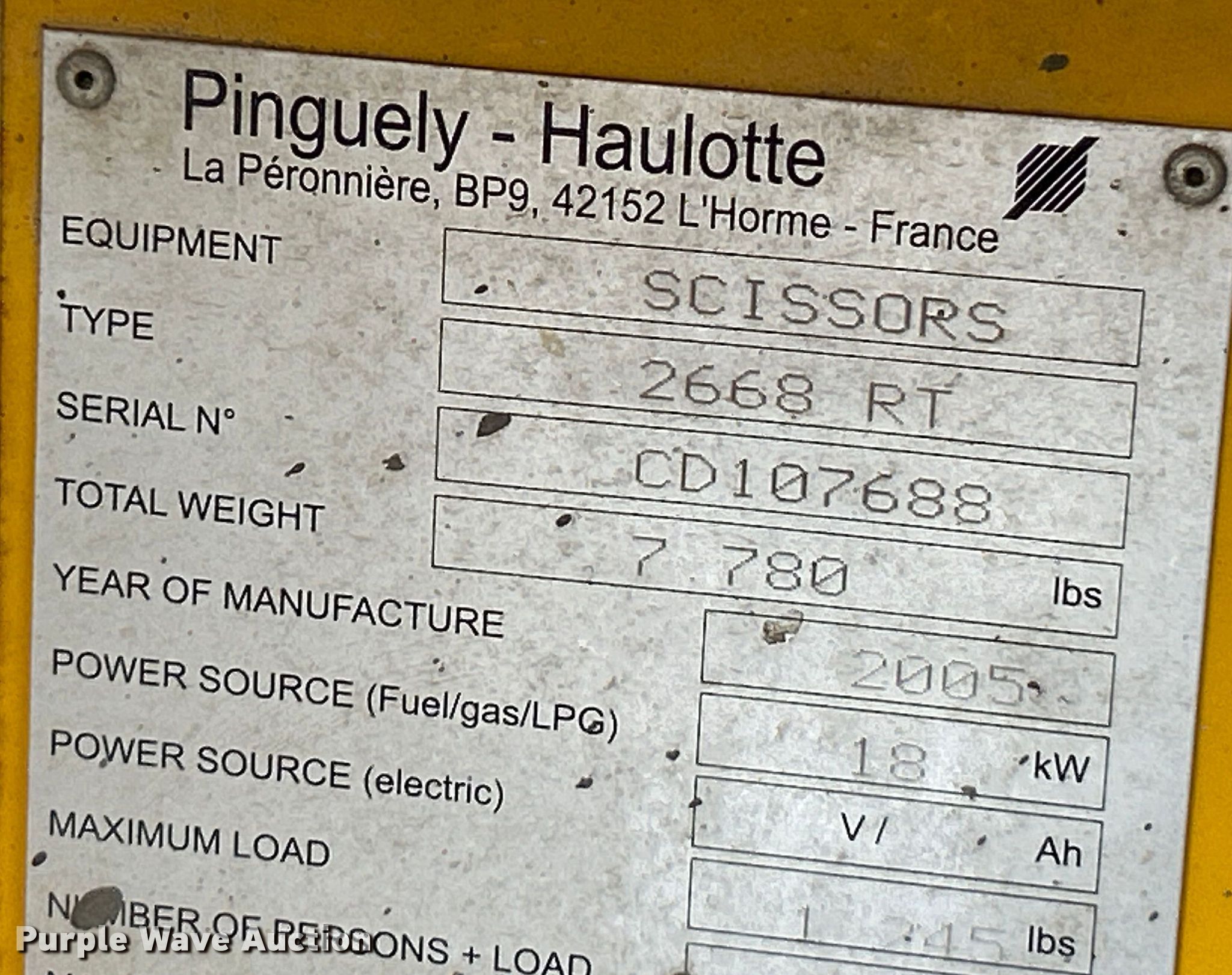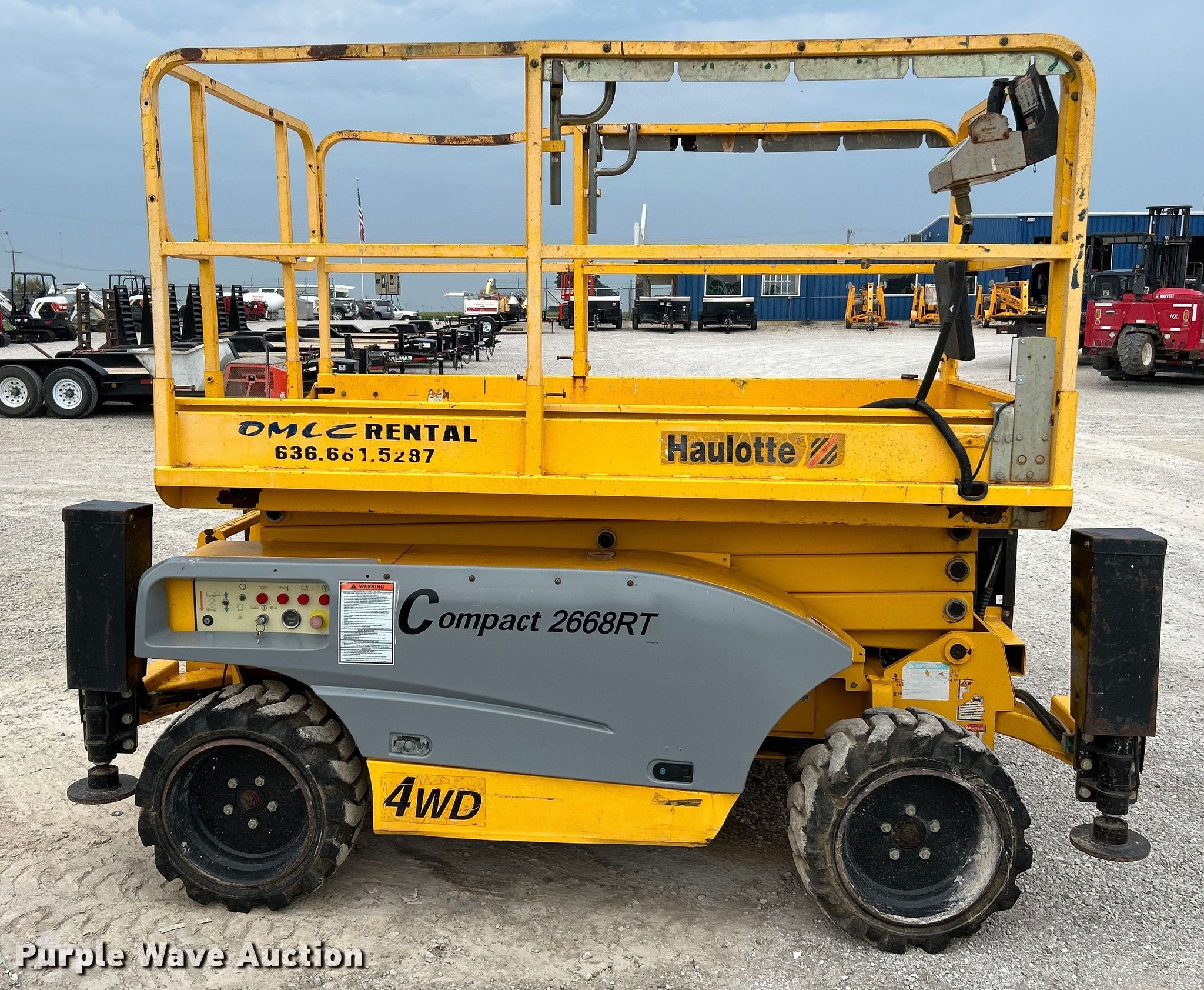 Purple Wave is selling a used Scissor or Vertical Lift in Missouri. This item is a 2005 Haulotte Compact 2668RT scissor lift with the following: Hours: 3,362 on meter, Serial: CD107688