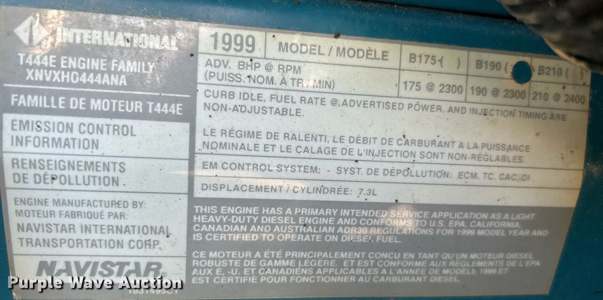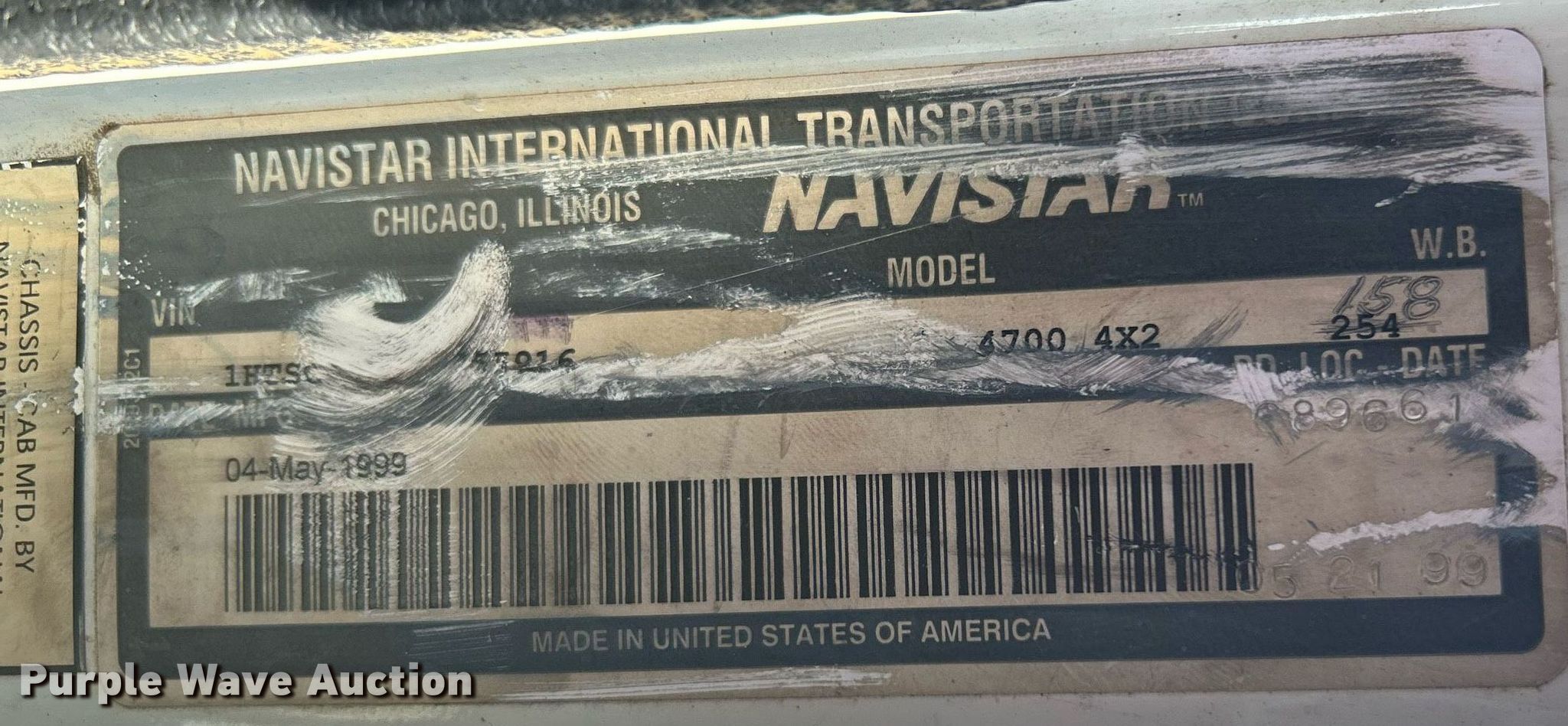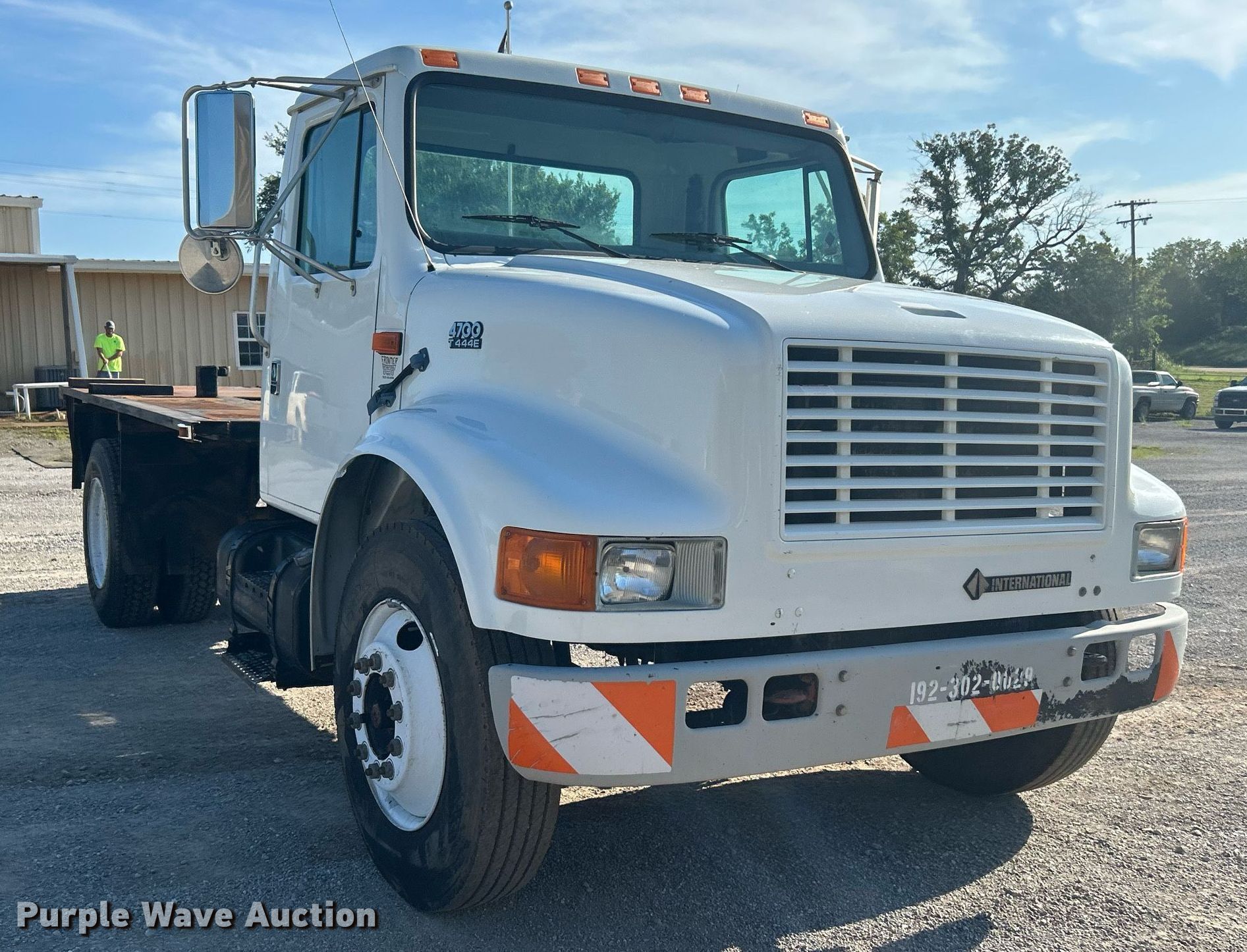 2000 International 4700 flatbed truck. Miles: 133,850 on odometer, Hours: 7,415 on meter, VIN: 1HTSCABM0YH255916. Engine Navistar T444E, Displacement: 7.3L, Cylinders: 8, Fuel type: Diesel. Transmission Manual, Speed: 5. Chassis Axles: Single, Suspension: Spring, Brakes: Hydraulic. Interior AC, Heat, Cruise control. Features Flatbed 10' 8" L x 94.5" W. Tires Size: 10R22.5. Oklahoma title. Seller is a government entity who will be assigning and distributing the title. Please contact the seller for distribution questions. Creek County. 10920 S. Highway 99. Drumright, OK 74030